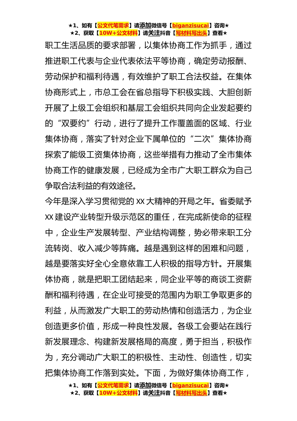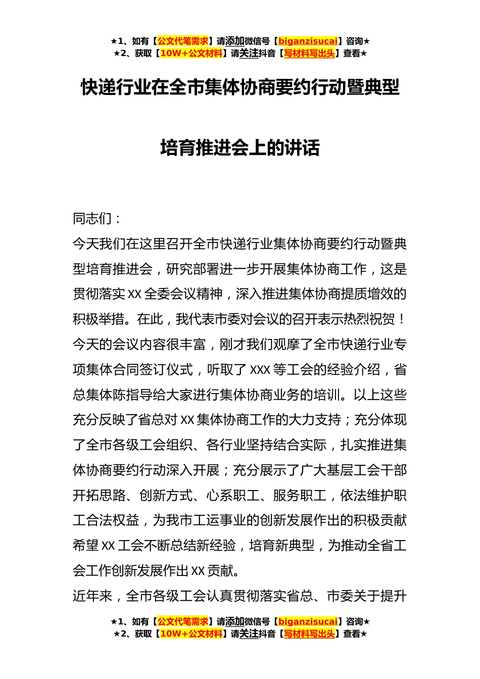 ★1、如有【公文代笔需求】请添加微信号【biganzisucai】咨询★★2、获取【10W+公文材料】请关注抖音【写材料写出头】查看★快递行业在全市集体协商要约行动暨典型培育推进会上的讲话同志们:今天我们在这里召开全市快递行业集体协商要约行动暨典型培育推进会,研究部署进一步开展集体协商工作,这是贯彻落实XX全委会议精神,深入推进集体协商提质增效的积极举措。在此,我代表市委对会议的召开表示热烈祝贺!今天的会议内容很丰富,刚才我们观摩了全市快递行业专项集体合同签订仪式,听取了XXX等工会的经验介绍,省总集体陈指导给大家进行集体协商业务的培训。以上这些充分反映了省总对XX集体协商工作的大力支持;充分体现了全市各级工会组织、各行业坚持结合实际,扎实推进集体协商要约行动深入开展;充分展示了...