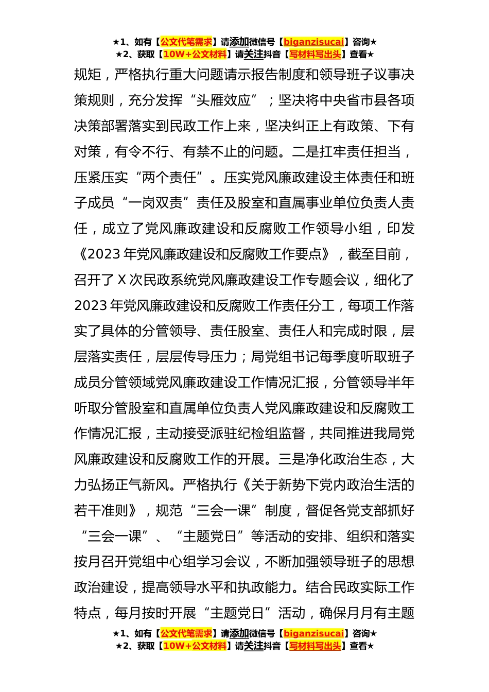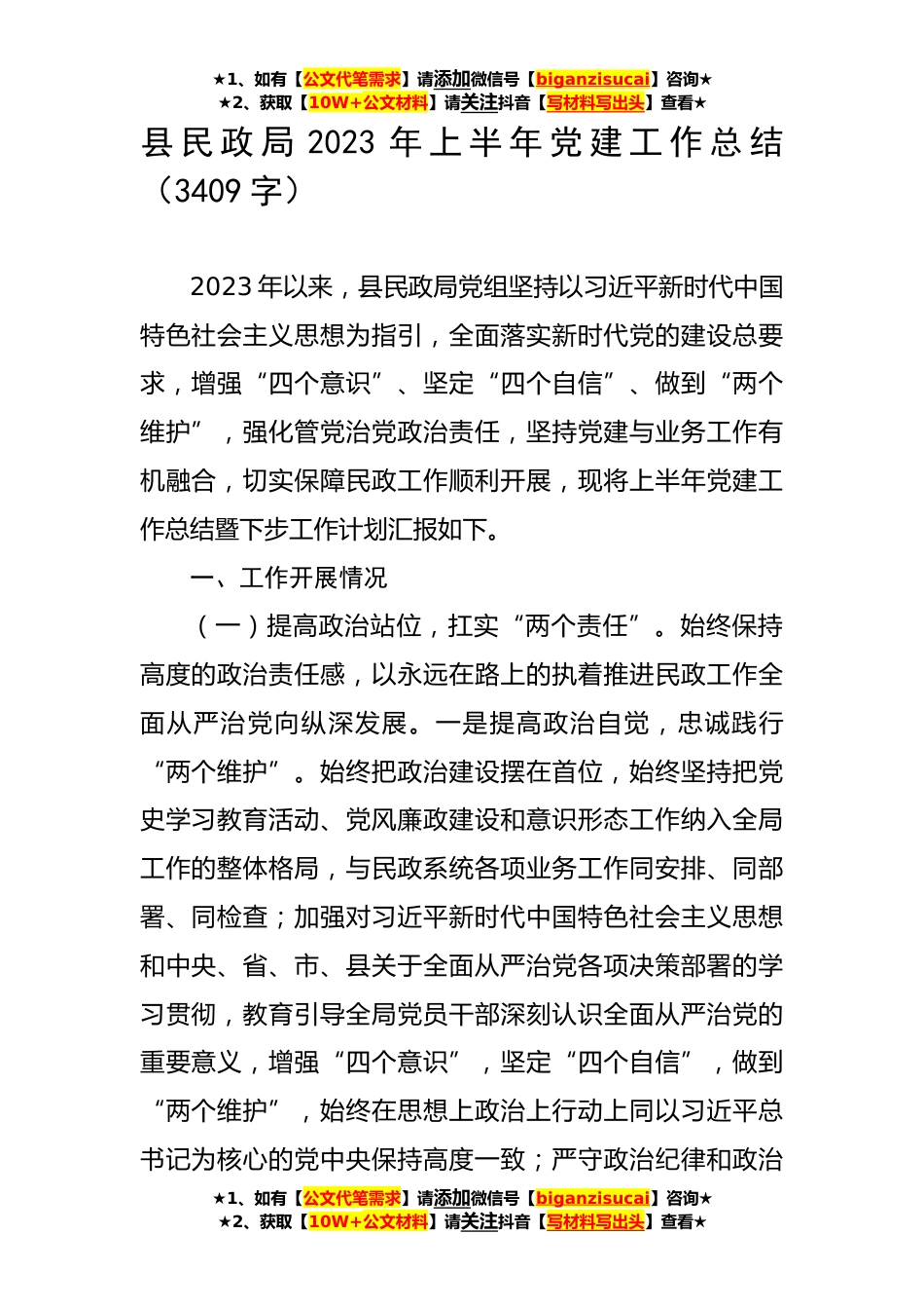 ★1、如有【公文代笔需求】请添加微信号【biganzisucai】咨询★★2、获取【10W+公文材料】请关注抖音【写材料写出头】查看★县民政局2023年上半年党建工作总结(3409字)2023年以来,县民政局党组坚持以习近平新时代中国特色社会主义思想为指引,全面落实新时代党的建设总要求,增强“四个意识”、坚定“四个自信”、做到“两个维护”,强化管党治党政治责任,坚持党建与业务工作有机融合,切实保障民政工作顺利开展,现将上半年党建工作总结暨下步工作计划汇报如下。一、工作开展情况(一)提高政治站位,扛实“两个责任”。始终保持高度的政治责任感,以永远在路上的执着推进民政工作全面从严治党向纵深发展。一是提高政治自觉,忠诚践行“两个维护”。始终把政治建设摆在首位,始终坚持把党史学习教育活动、党...