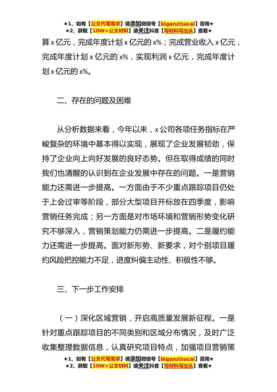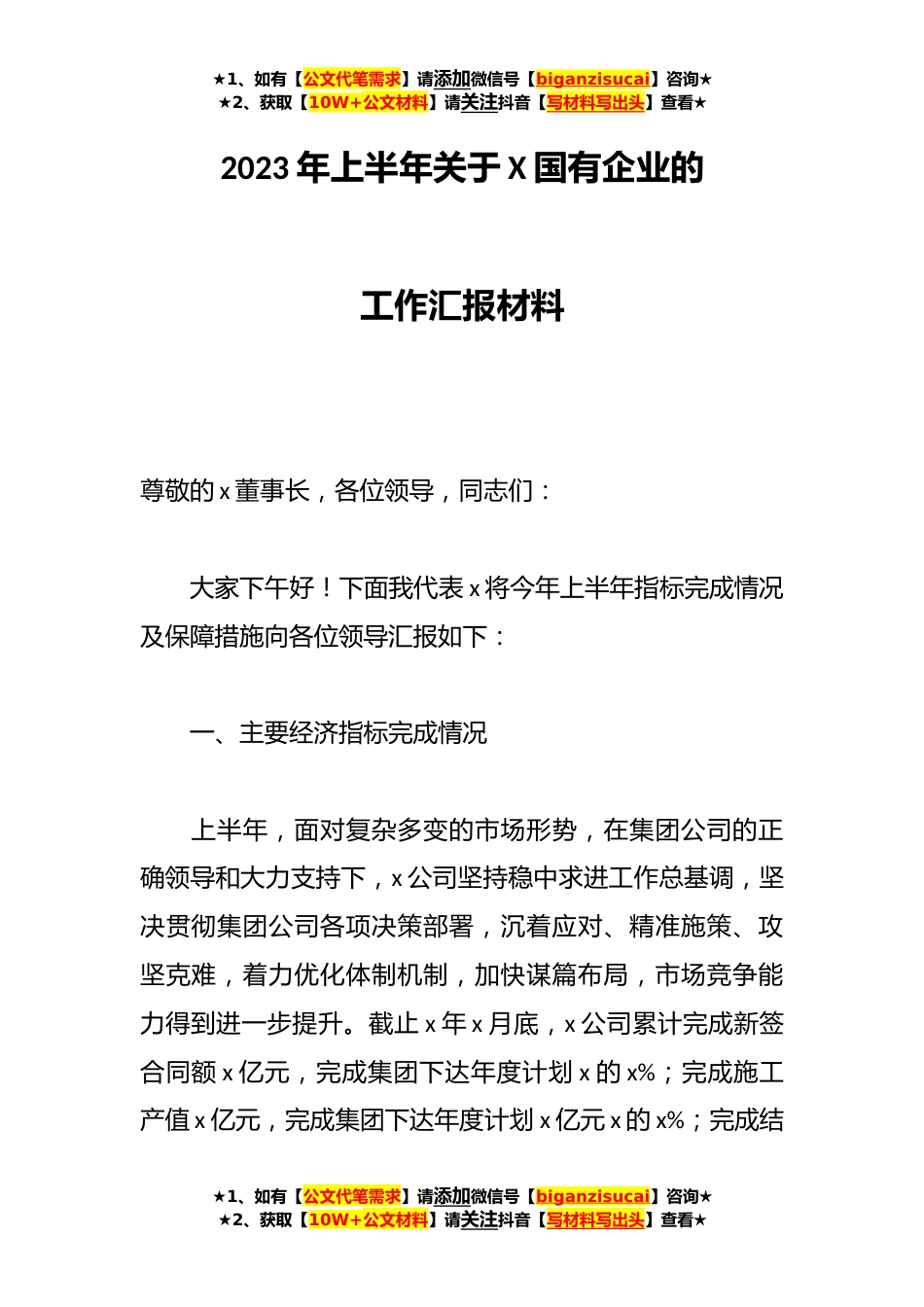 ★1、如有【公文代笔需求】请添加微信号【biganzisucai】咨询★★2、获取【10W+公文材料】请关注抖音【写材料写出头】查看★2023年上半年关于X国有企业的工作汇报材料尊敬的x董事长,各位领导,同志们:大家下午好!下面我代表x将今年上半年指标完成情况及保障措施向各位领导汇报如下:一、主要经济指标完成情况上半年,面对复杂多变的市场形势,在集团公司的正确领导和大力支持下,x公司坚持稳中求进工作总基调,坚决贯彻集团公司各项决策部署,沉着应对、精准施策、攻坚克难,着力优化体制机制,加快谋篇布局,市场竞争能力得到进一步提升。截止x年x月底,x公司累计完成新签合同额x亿元,完成集团下达年度计划x的x%;完成施工产值x亿元,完成集团下达年度计划x亿元x的x%;完成结★1、如有【公文代笔需求】请添加...