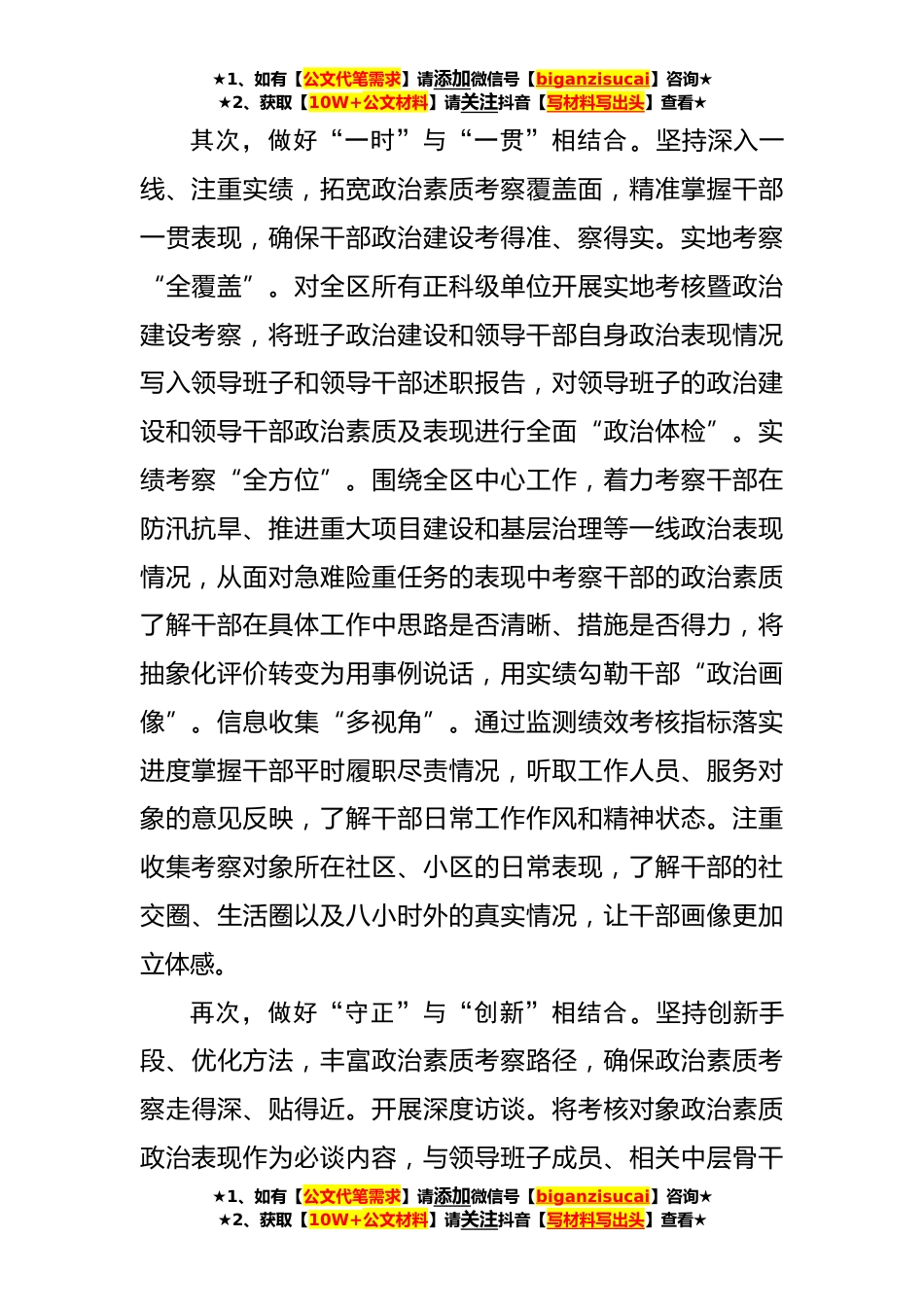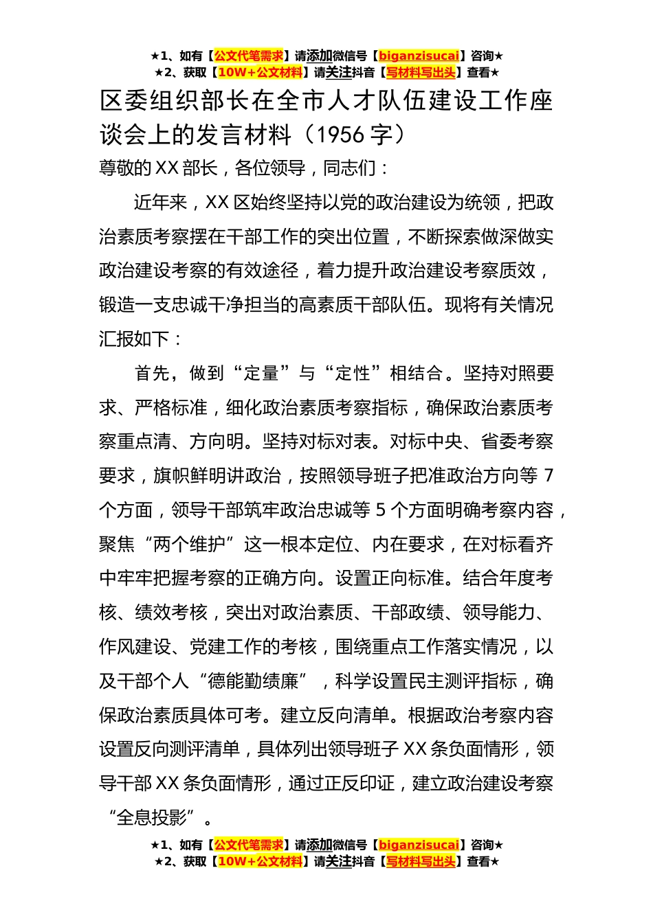★1、如有【公文代笔需求】请添加微信号【biganzisucai】咨询★★2、获取【10W+公文材料】请关注抖音【写材料写出头】查看★区委组织部长在全市人才队伍建设工作座谈会上的发言材料(1956字)尊敬的XX部长,各位领导,同志们:近年来,XX区始终坚持以党的政治建设为统领,把政治素质考察摆在干部工作的突出位置,不断探索做深做实政治建设考察的有效途径,着力提升政治建设考察质效,锻造一支忠诚干净担当的高素质干部队伍。现将有关情况汇报如下:首先,做到“定量”与“定性”相结合。坚持对照要求、严格标准,细化政治素质考察指标,确保政治素质考察重点清、方向明。坚持对标对表。对标中央、省委考察要求,旗帜鲜明讲政治,按照领导班子把准政治方向等7个方面,领导干部筑牢政治忠诚等5个方面明确考察内容,...