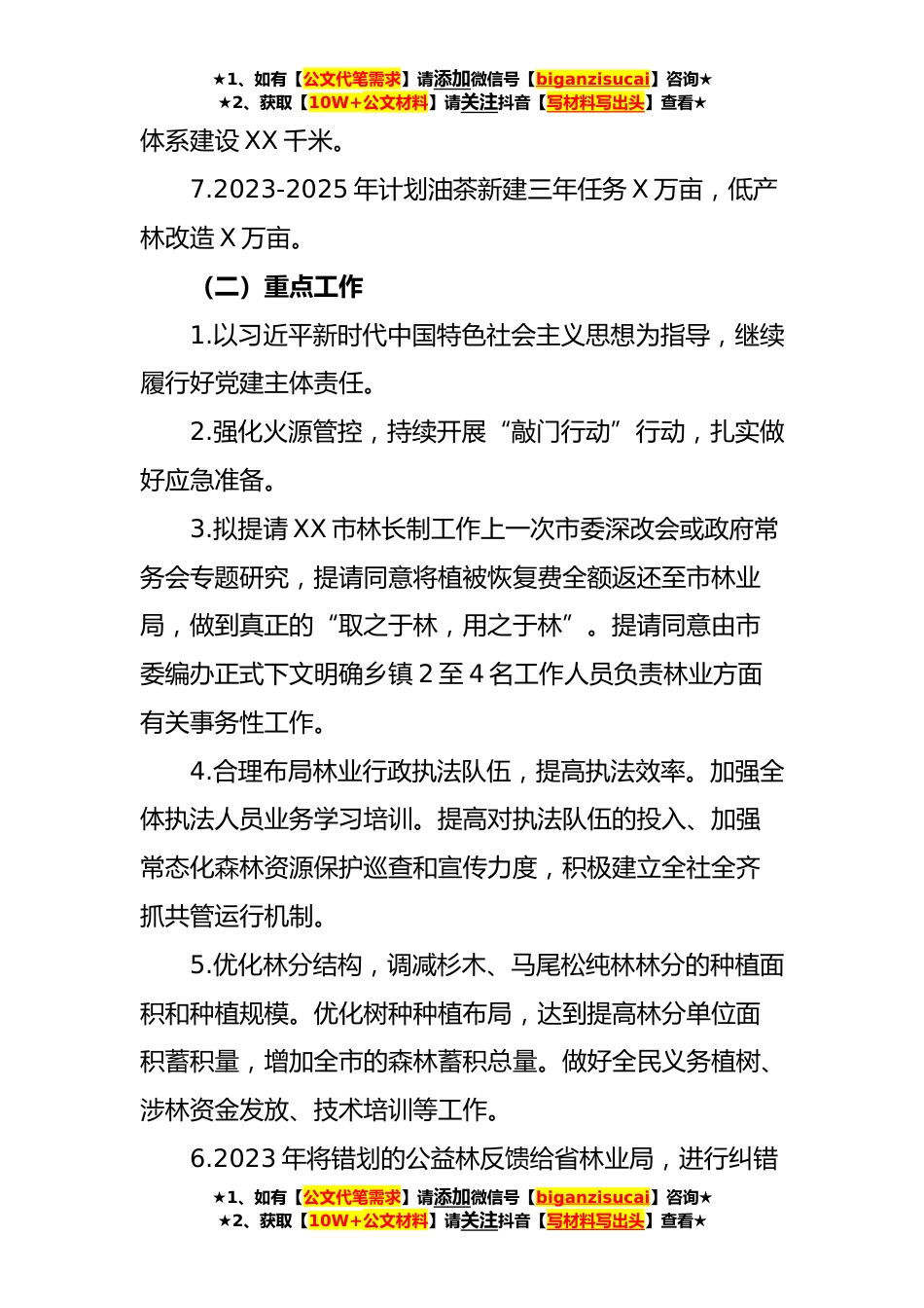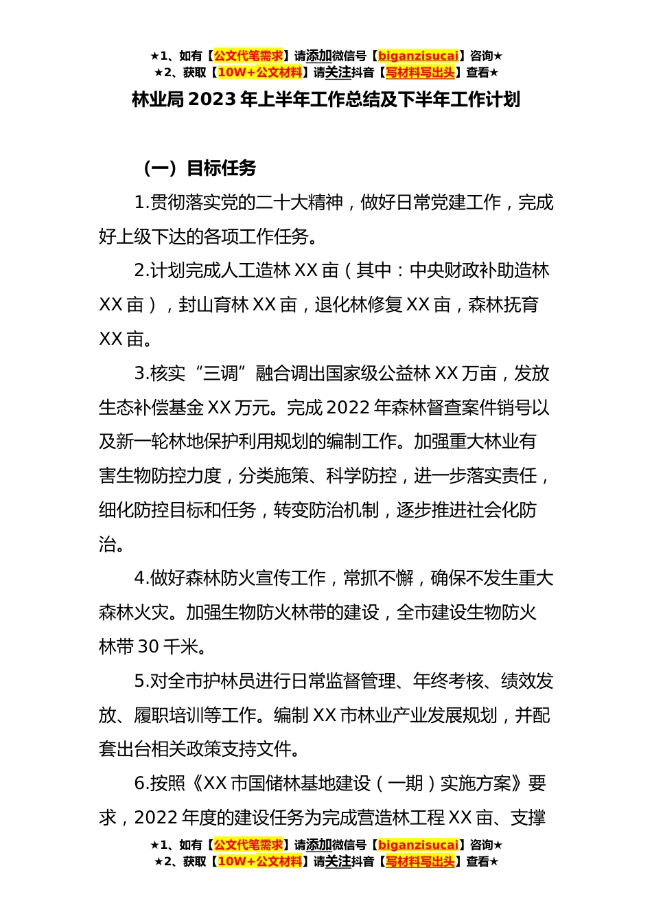 ★1、如有【公文代笔需求】请添加微信号【biganzisucai】咨询★★2、获取【10W+公文材料】请关注抖音【写材料写出头】查看★林业局2023年上半年工作总结及下半年工作计划(一)目标任务1.贯彻落实党的二十大精神,做好日常党建工作,完成好上级下达的各项工作任务。2.计划完成人工造林XX亩(其中:中央财政补助造林XX亩),封山育林XX亩,退化林修复XX亩,森林抚育XX亩。3.核实“三调”融合调出国家级公益林XX万亩,发放生态补偿基金XX万元。完成2022年森林督查案件销号以及新一轮林地保护利用规划的编制工作。加强重大林业有害生物防控力度,分类施策、科学防控,进一步落实责任,细化防控目标和任务,转变防治机制,逐步推进社会化防治。4.做好森林防火宣传工作,常抓不懈,确保不发生重大森林火灾。加强生物防...