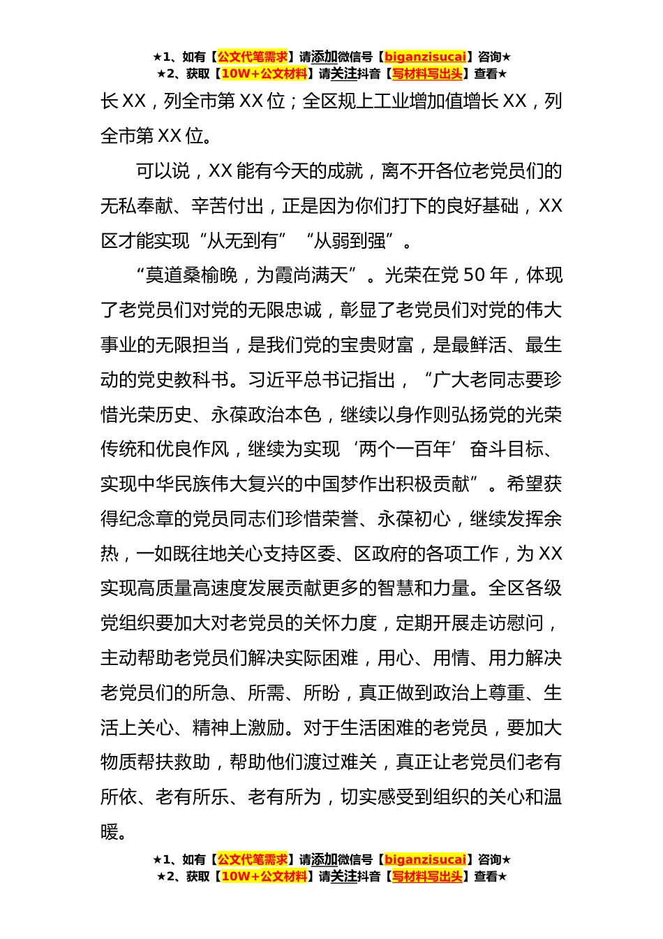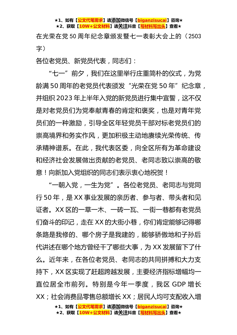 ★1、如有【公文代笔需求】请添加微信号【biganzisucai】咨询★★2、获取【10W+公文材料】请关注抖音【写材料写出头】查看★在光荣在党50周年纪念章颁发暨七一表彰大会上的(2503字)各位老党员、新党员代表,同志们:“七一”前夕,我们在这里举行庄重简朴的仪式,为党龄满50周年的老党员代表颁发“光荣在党50年”纪念章,并组织2023年上半年入党的新党员进行集中宣誓,这不仅是对老党员们为党奉献青春的肯定和褒奖,也是对青年党员们的一种激励,引导全区年轻党员干部对标老党员们的崇高境界和务实作风,更加积极主动地赓续光荣传统、传承精神谱系。在此,我代表区委,向全区所有为革命建设和经济社会发展做出贡献的老党员、老同志致以崇高的敬意!向新加入党组织的同志们表示衷心地祝贺!“一朝入党,一生为党...
