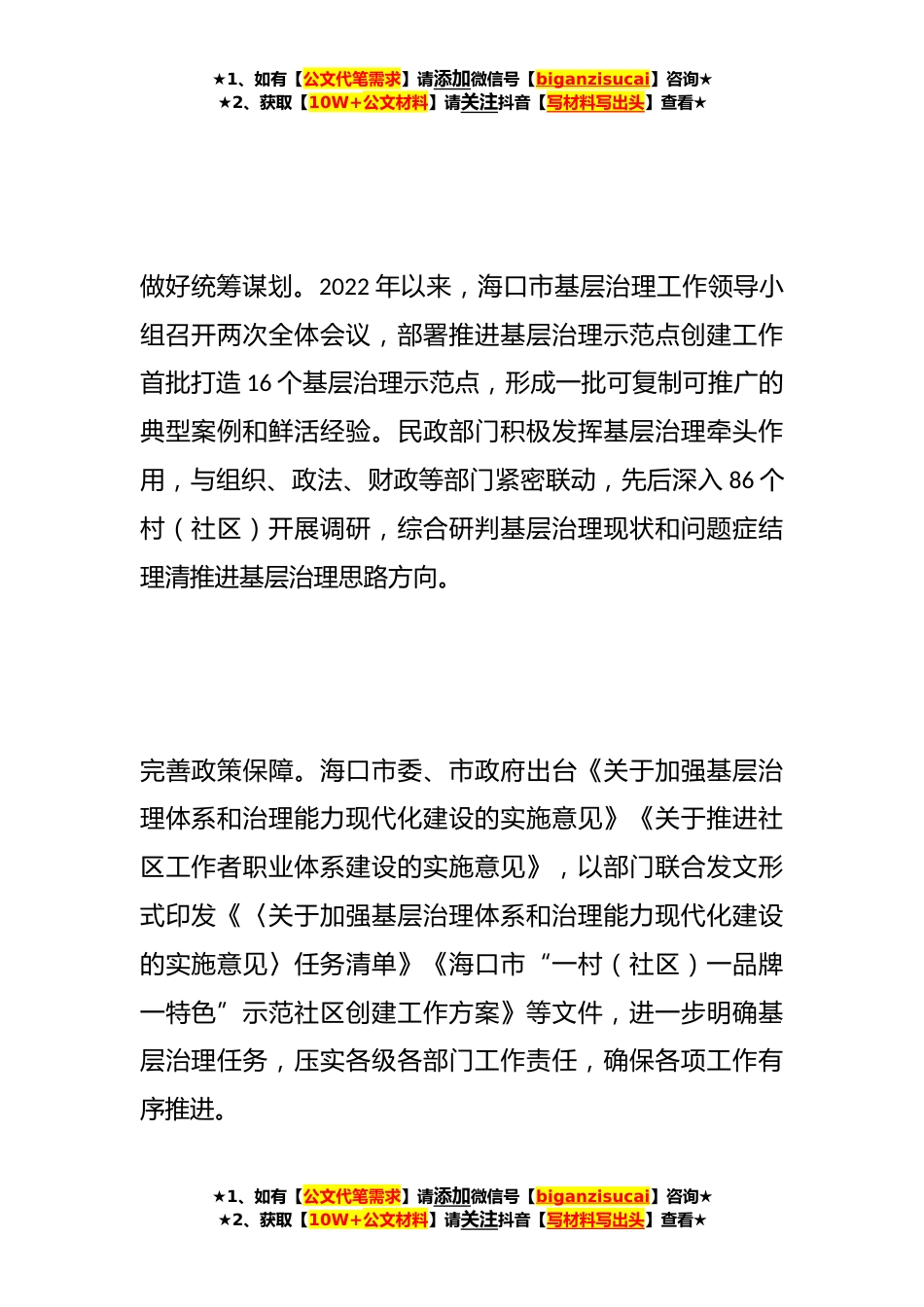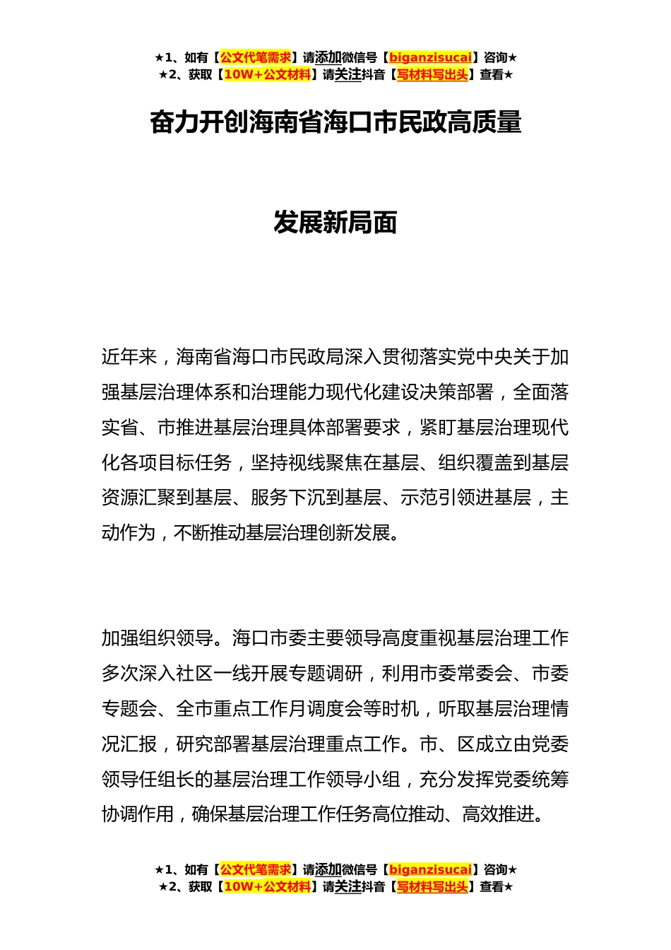 ★1、如有【公文代笔需求】请添加微信号【biganzisucai】咨询★★2、获取【10W+公文材料】请关注抖音【写材料写出头】查看★奋力开创海南省海口市民政高质量发展新局面近年来,海南省海口市民政局深入贯彻落实党中央关于加强基层治理体系和治理能力现代化建设决策部署,全面落实省、市推进基层治理具体部署要求,紧盯基层治理现代化各项目标任务,坚持视线聚焦在基层、组织覆盖到基层资源汇聚到基层、服务下沉到基层、示范引领进基层,主动作为,不断推动基层治理创新发展。加强组织领导。海口市委主要领导高度重视基层治理工作多次深入社区一线开展专题调研,利用市委常委会、市委专题会、全市重点工作月调度会等时机,听取基层治理情况汇报,研究部署基层治理重点工作。市、区成立由党委领导任组长的基层治理工...