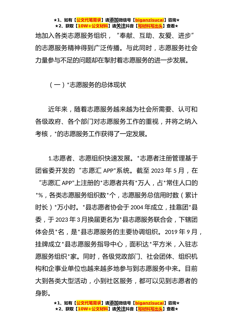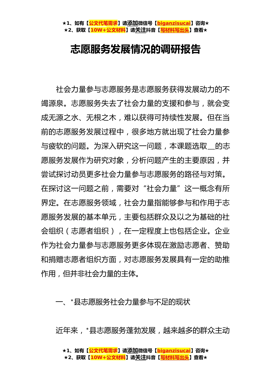 ★1、如有【公文代笔需求】请添加微信号【biganzisucai】咨询★★2、获取【10W+公文材料】请关注抖音【写材料写出头】查看★志愿服务发展情况的调研报告社会力量参与志愿服务是志愿服务获得发展动力的不竭源泉。志愿服务失去了社会力量的支援和参与,就会变成无源之水、无根之木,难以获得可持续性发展。但在当前的志愿服务发展过程中,很多地方就出现了社会力量参与疲软的问题。为深入研究这一问题,本课题选取__的志愿服务发展作为研究对象,分析问题产生的主要原因,并尝试探讨动员更多社会力量参与志愿服务的路径与对策。在探讨这一问题之前,需要对“社会力量”这一概念有所界定。在志愿服务领域,社会力量指能够参与和作用于志愿服务发展的基本单元,主要包括群众及以之为基础的社会组织(志愿者组织),在...