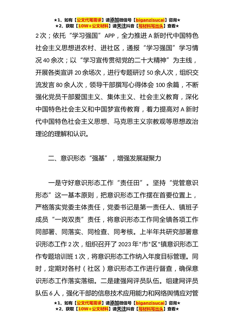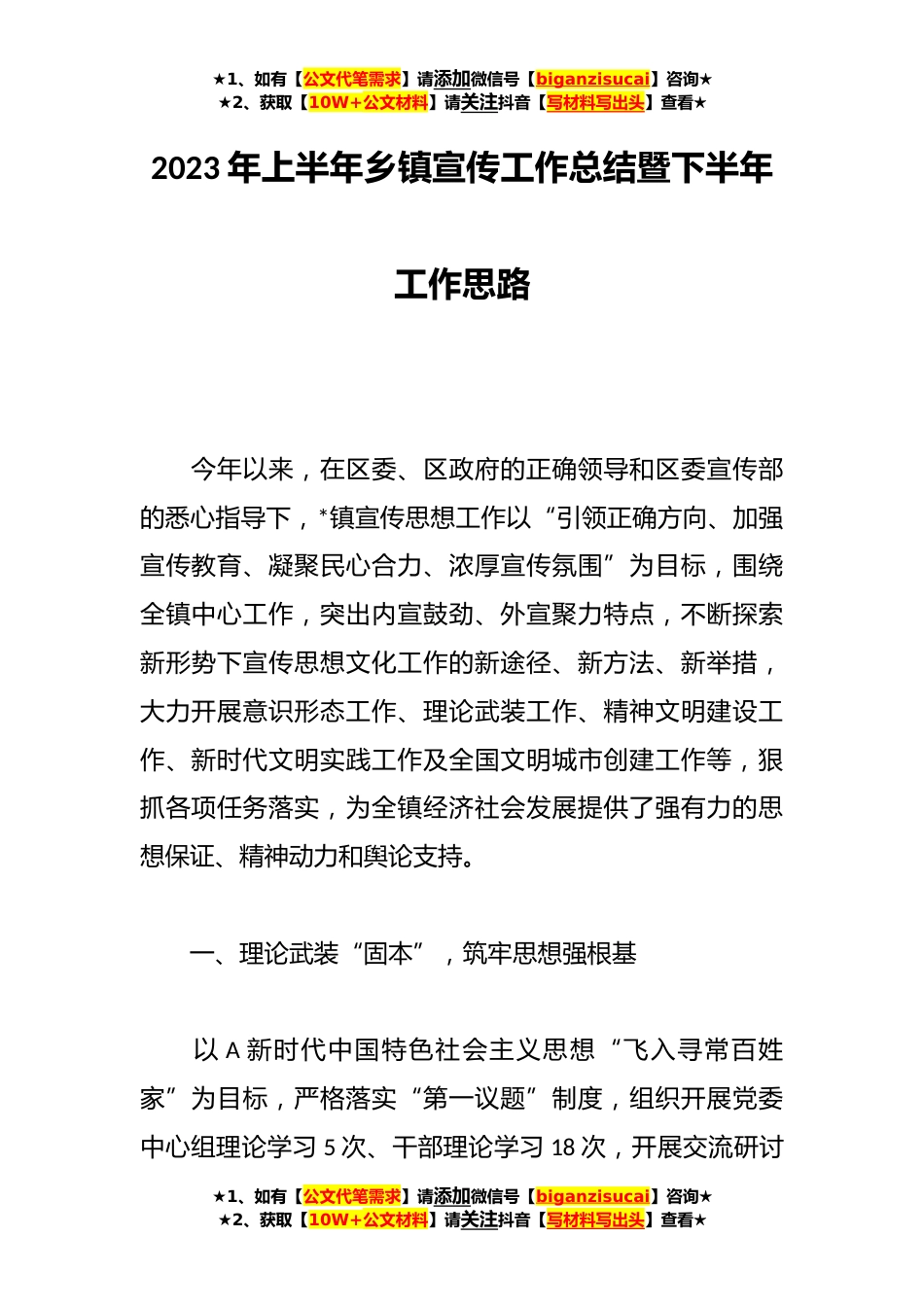 ★1、如有【公文代笔需求】请添加微信号【biganzisucai】咨询★★2、获取【10W+公文材料】请关注抖音【写材料写出头】查看★2023年上半年乡镇宣传工作总结暨下半年工作思路今年以来,在区委、区政府的正确领导和区委宣传部的悉心指导下,*镇宣传思想工作以“引领正确方向、加强宣传教育、凝聚民心合力、浓厚宣传氛围”为目标,围绕全镇中心工作,突出内宣鼓劲、外宣聚力特点,不断探索新形势下宣传思想文化工作的新途径、新方法、新举措,大力开展意识形态工作、理论武装工作、精神文明建设工作、新时代文明实践工作及全国文明城市创建工作等,狠抓各项任务落实,为全镇经济社会发展提供了强有力的思想保证、精神动力和舆论支持。一、理论武装“固本”,筑牢思想强根基以A新时代中国特色社会主义思想“飞入寻常百...