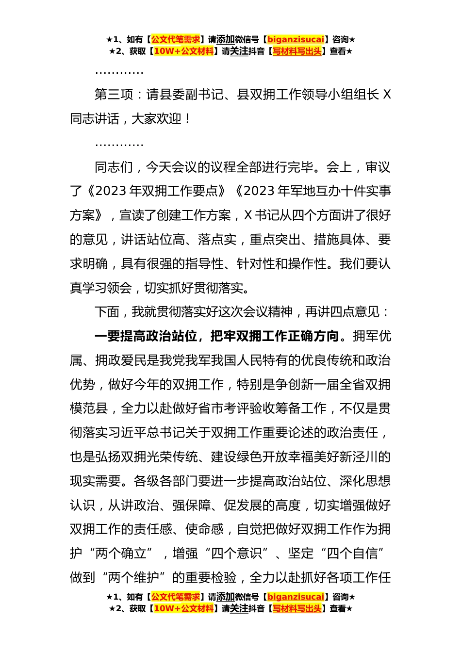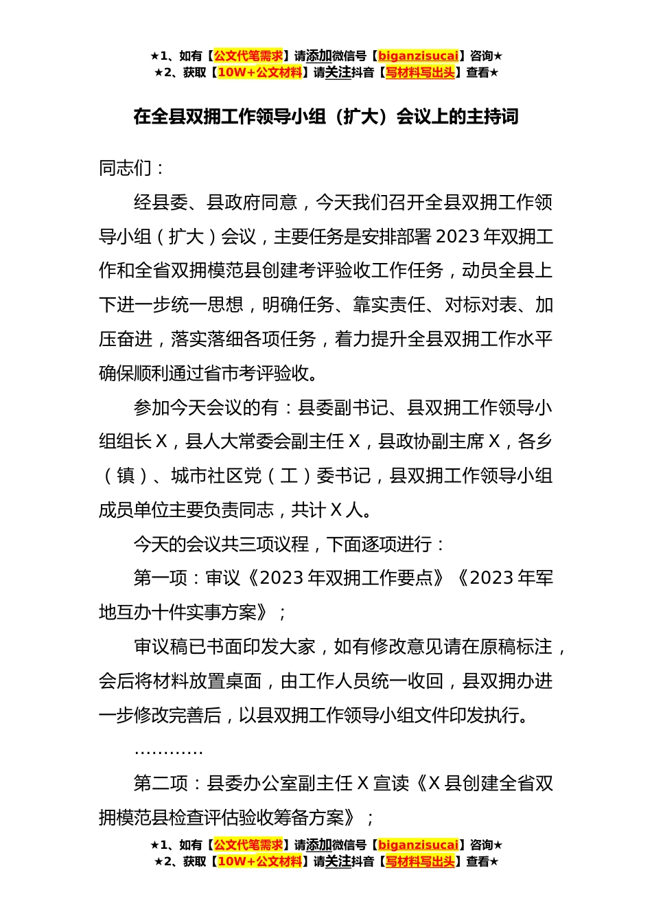 ★1、如有【公文代笔需求】请添加微信号【biganzisucai】咨询★★2、获取【10W+公文材料】请关注抖音【写材料写出头】查看★在全县双拥工作领导小组(扩大)会议上的主持词同志们:经县委、县政府同意,今天我们召开全县双拥工作领导小组(扩大)会议,主要任务是安排部署2023年双拥工作和全省双拥模范县创建考评验收工作任务,动员全县上下进一步统一思想,明确任务、靠实责任、对标对表、加压奋进,落实落细各项任务,着力提升全县双拥工作水平确保顺利通过省市考评验收。参加今天会议的有:县委副书记、县双拥工作领导小组组长X,县人大常委会副主任X,县政协副主席X,各乡(镇)、城市社区党(工)委书记,县双拥工作领导小组成员单位主要负责同志,共计X人。今天的会议共三项议程,下面逐项进行:第一项:审...