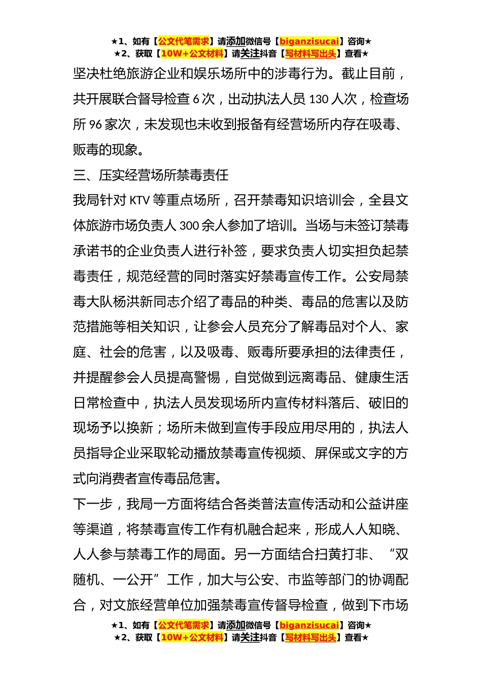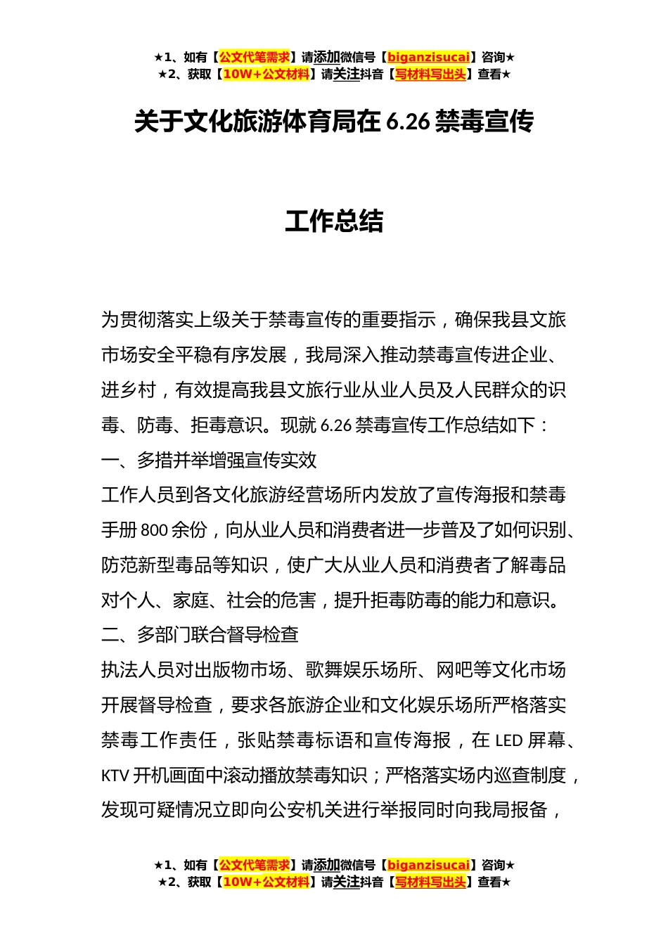 ★1、如有【公文代笔需求】请添加微信号【biganzisucai】咨询★★2、获取【10W+公文材料】请关注抖音【写材料写出头】查看★关于文化旅游体育局在6.26禁毒宣传工作总结为贯彻落实上级关于禁毒宣传的重要指示,确保我县文旅市场安全平稳有序发展,我局深入推动禁毒宣传进企业、进乡村,有效提高我县文旅行业从业人员及人民群众的识毒、防毒、拒毒意识。现就6.26禁毒宣传工作总结如下:一、多措并举增强宣传实效工作人员到各文化旅游经营场所内发放了宣传海报和禁毒手册800余份,向从业人员和消费者进一步普及了如何识别、防范新型毒品等知识,使广大从业人员和消费者了解毒品对个人、家庭、社会的危害,提升拒毒防毒的能力和意识。二、多部门联合督导检查执法人员对出版物市场、歌舞娱乐场所、网吧等文化市场开展督...
