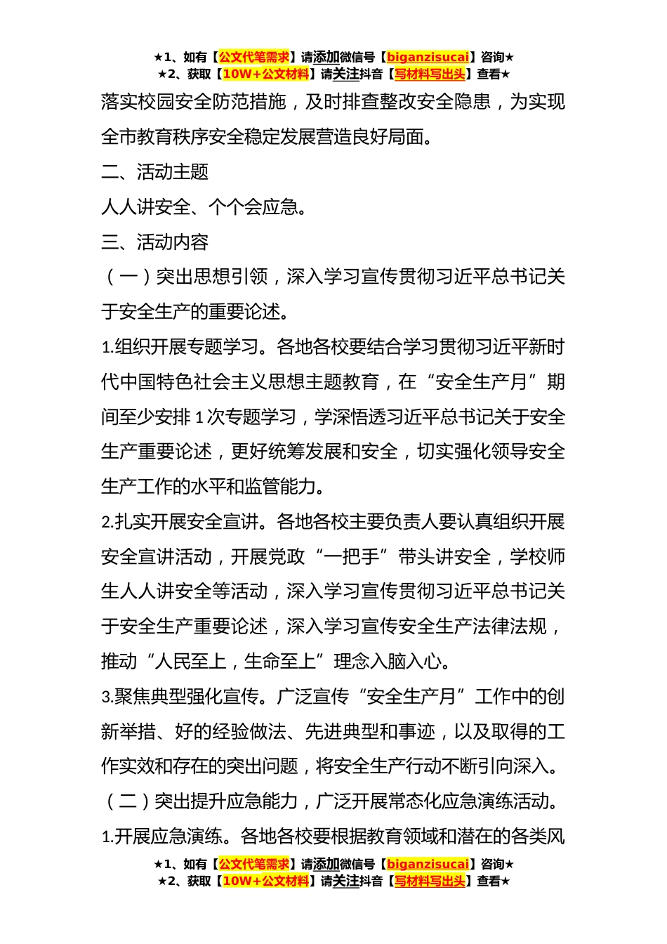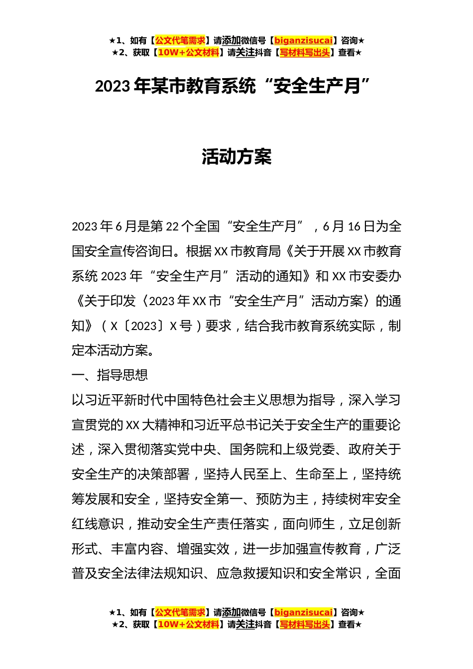 ★1、如有【公文代笔需求】请添加微信号【biganzisucai】咨询★★2、获取【10W+公文材料】请关注抖音【写材料写出头】查看★2023年某市教育系统“安全生产月”活动方案2023年6月是第22个全国“安全生产月”,6月16日为全国安全宣传咨询日。根据XX市教育局《关于开展XX市教育系统2023年“安全生产月”活动的通知》和XX市安委办《关于印发〈2023年XX市“安全生产月”活动方案〉的通知》(X〔2023〕X号)要求,结合我市教育系统实际,制定本活动方案。一、指导思想以习近平新时代中国特色社会主义思想为指导,深入学习宣贯党的XX大精神和习近平总书记关于安全生产的重要论述,深入贯彻落实党中央、国务院和上级党委、政府关于安全生产的决策部署,坚持人民至上、生命至上,坚持统筹发展和安全,坚持安全第一、预防为...
