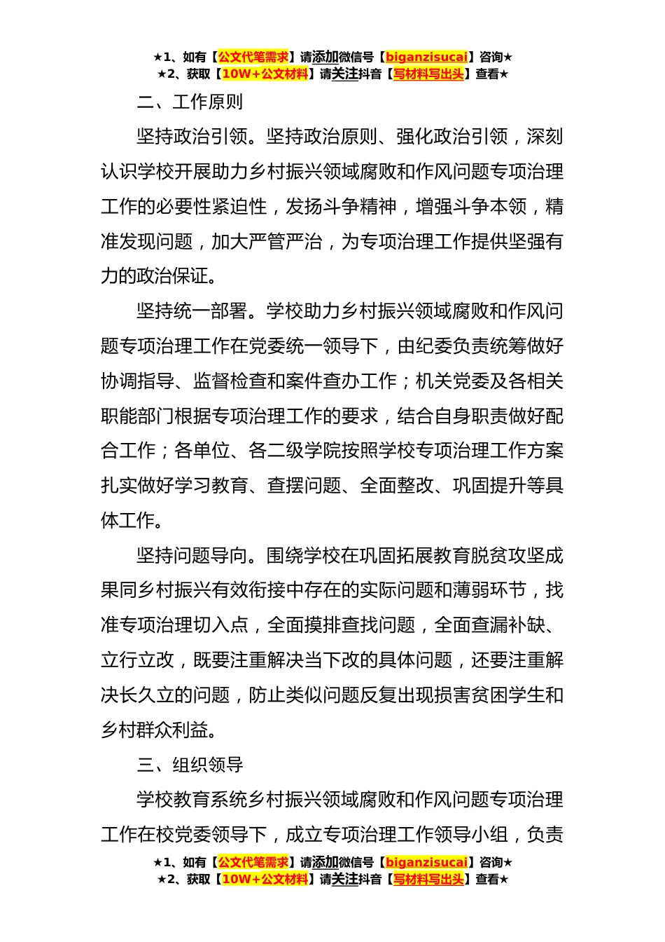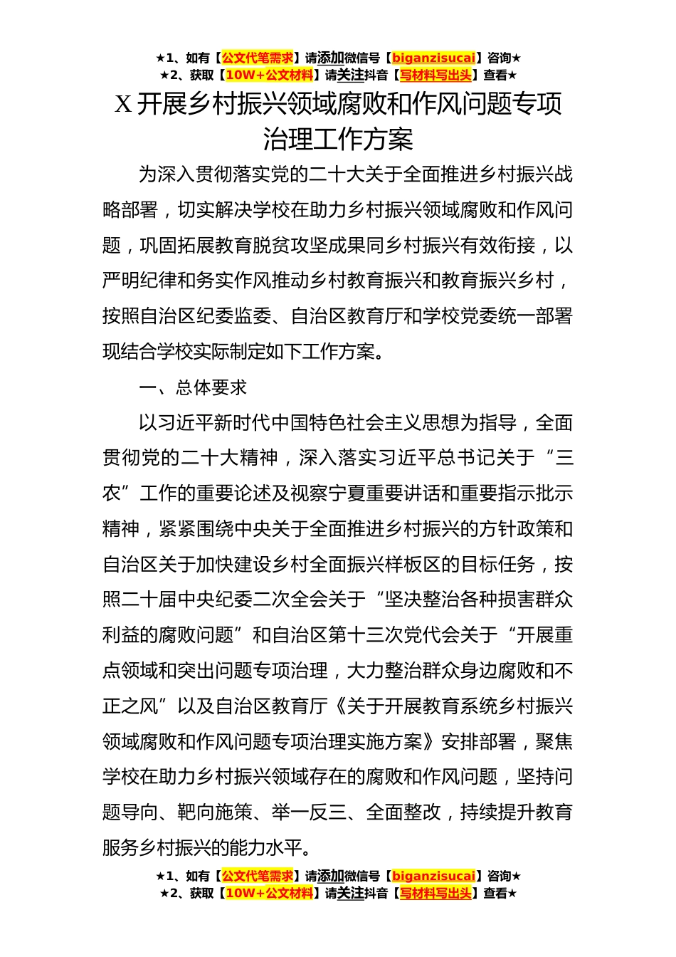 ★1、如有【公文代笔需求】请添加微信号【biganzisucai】咨询★★2、获取【10W+公文材料】请关注抖音【写材料写出头】查看★X开展乡村振兴领域腐败和作风问题专项治理工作方案为深入贯彻落实党的二十大关于全面推进乡村振兴战略部署,切实解决学校在助力乡村振兴领域腐败和作风问题,巩固拓展教育脱贫攻坚成果同乡村振兴有效衔接,以严明纪律和务实作风推动乡村教育振兴和教育振兴乡村,按照自治区纪委监委、自治区教育厅和学校党委统一部署现结合学校实际制定如下工作方案。一、总体要求以习近平新时代中国特色社会主义思想为指导,全面贯彻党的二十大精神,深入落实习近平总书记关于“三农”工作的重要论述及视察宁夏重要讲话和重要指示批示精神,紧紧围绕中央关于全面推进乡村振兴的方针政策和自治区关于加快建...