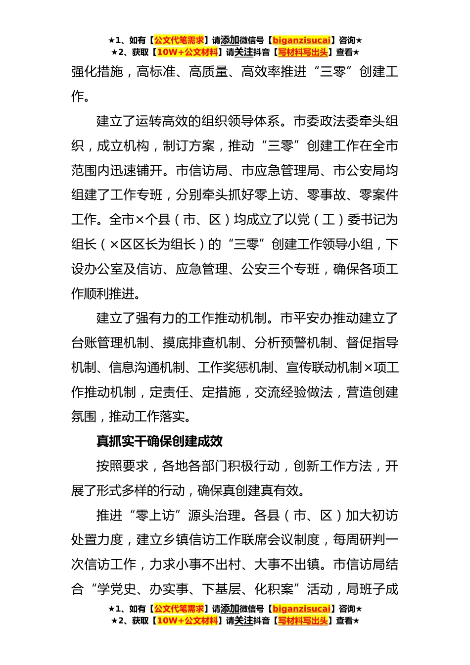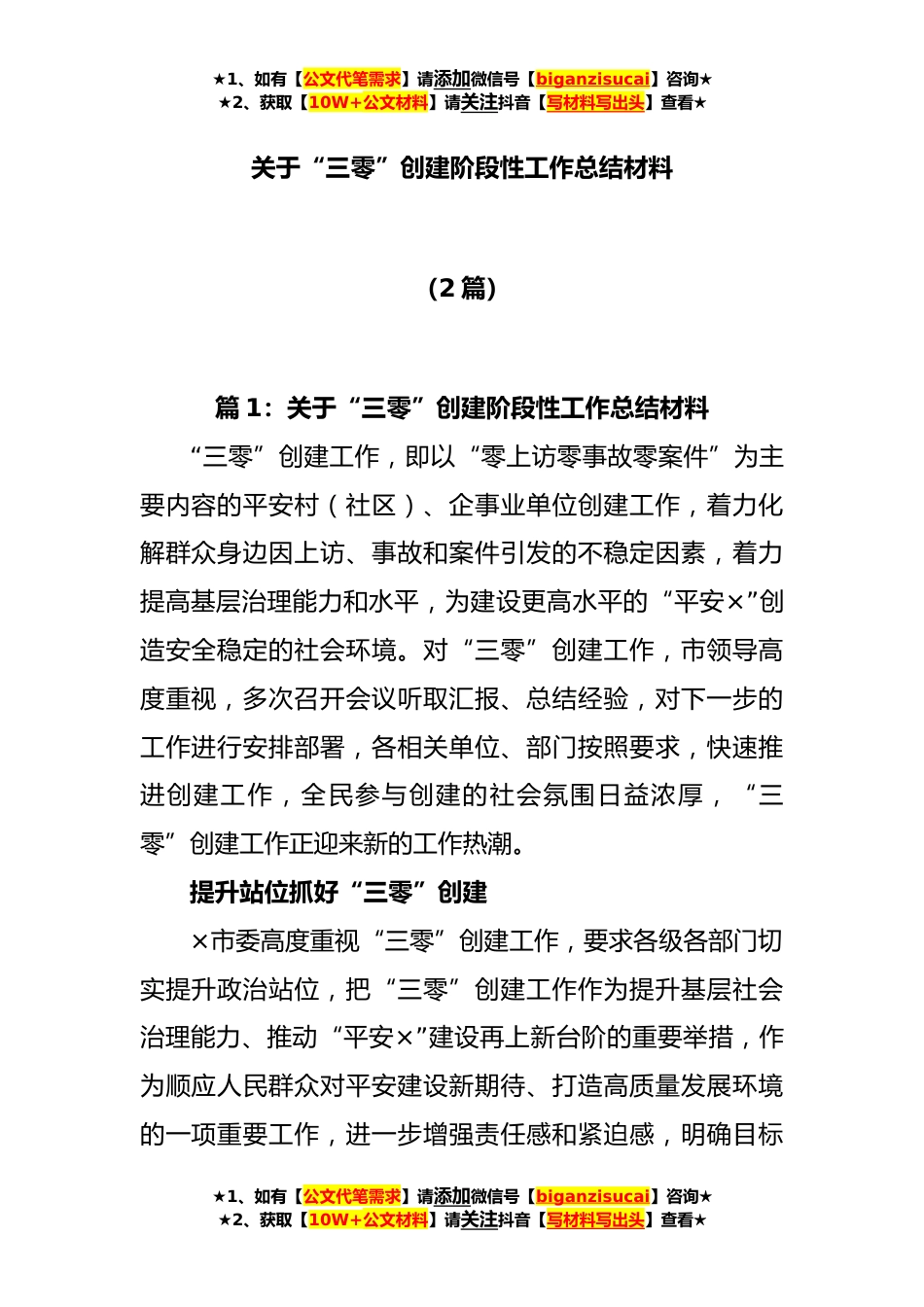 ★1、如有【公文代笔需求】请添加微信号【biganzisucai】咨询★★2、获取【10W+公文材料】请关注抖音【写材料写出头】查看★关于“三零”创建阶段性工作总结材料(2篇)篇1:关于“三零”创建阶段性工作总结材料“三零”创建工作,即以“零上访零事故零案件”为主要内容的平安村(社区)、企事业单位创建工作,着力化解群众身边因上访、事故和案件引发的不稳定因素,着力提高基层治理能力和水平,为建设更高水平的“平安×”创造安全稳定的社会环境。对“三零”创建工作,市领导高度重视,多次召开会议听取汇报、总结经验,对下一步的工作进行安排部署,各相关单位、部门按照要求,快速推进创建工作,全民参与创建的社会氛围日益浓厚,“三零”创建工作正迎来新的工作热潮。提升站位抓好“三零”创建×市委高度重...