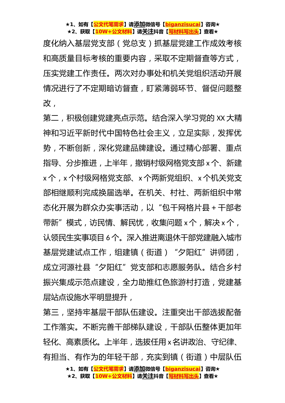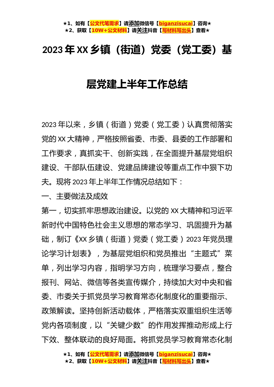 ★1、如有【公文代笔需求】请添加微信号【biganzisucai】咨询★★2、获取【10W+公文材料】请关注抖音【写材料写出头】查看★2023年XX乡镇(街道)党委(党工委)基层党建上半年工作总结2023年以来,乡镇(街道)党委(党工委)认真贯彻落实党的XX大精神,严格按照省委、市委、县委的工作部署和工作要求,真抓实干、创新实践,在全面提升基层党组织建设、干部队伍建设、党建品牌建设等重点工作中狠下功夫。现将2023年上半年工作情况总结如下:一、主要做法及成效第一,切实抓牢思想政治建设。以党的XX大精神和习近平新时代中国特色社会主义思想的常态学习、巩固提升为基础,制订《XX乡镇(街道)党委(党工委)2023年党员理论学习计划表》,为基层党组织和党员推出“主题式”菜单,列出学习内容,指明学习方向,梳...