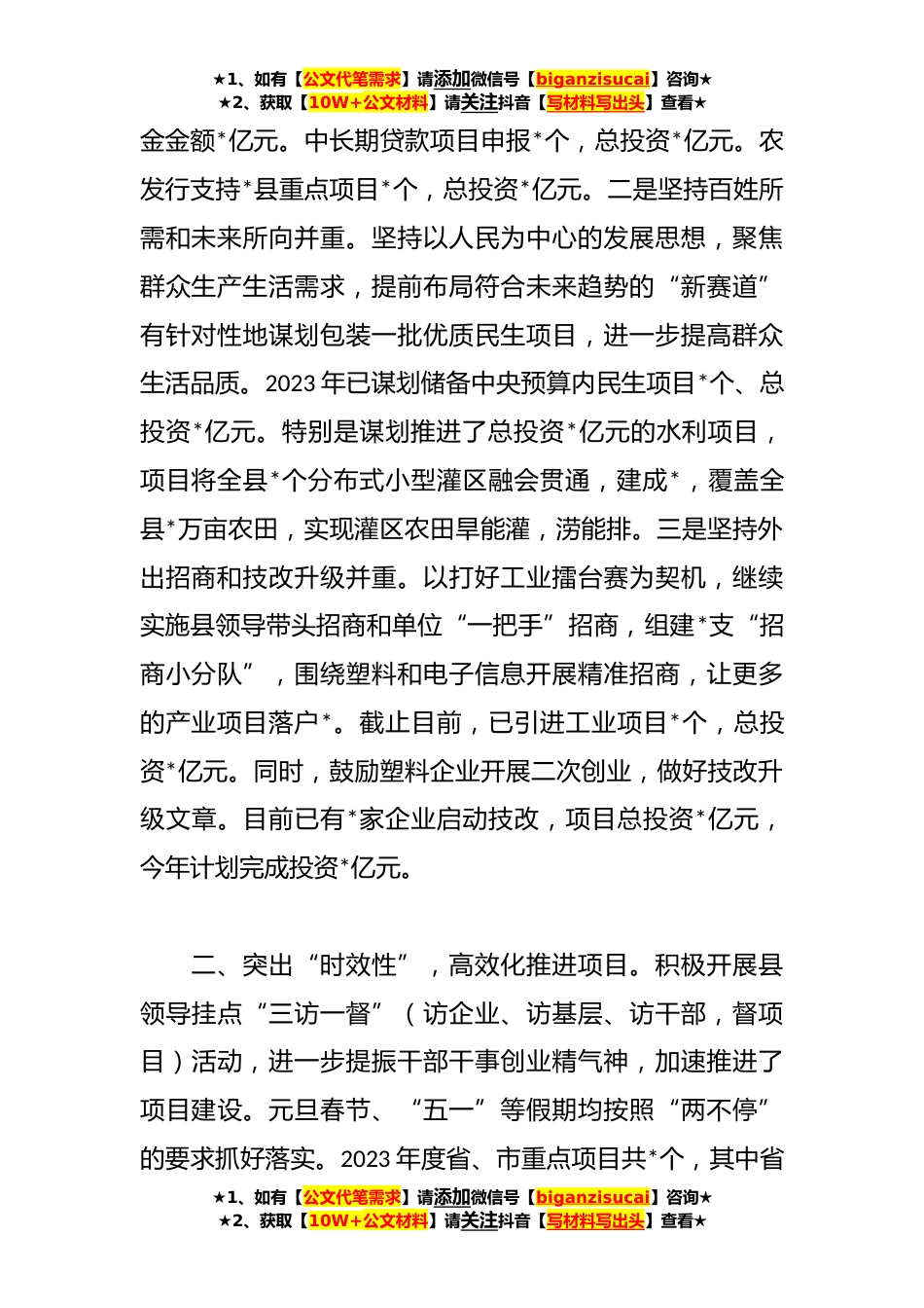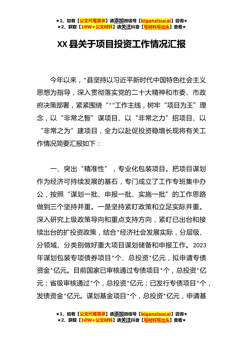 ★1、如有【公文代笔需求】请添加微信号【biganzisucai】咨询★★2、获取【10W+公文材料】请关注抖音【写材料写出头】查看★XX县关于项目投资工作情况汇报今年以来,*县坚持以习近平新时代中国特色社会主义思想为指导,深入贯彻落实党的二十大精神和市委、市政府决策部署,紧紧围绕“*”工作主线,树牢“项目为王”理念,以“非常之智”谋项目、以“非常之力”招项目、以“非常之为”建项目,全力以赴促投资稳增长现将有关工作情况简要汇报如下:一、突出“精准性”,专业化包装项目。把项目谋划作为经济可持续发展的基石,专门成立了工作专班集中办公,按照“谋划一批、申报一批、实施一批”的工作思路做到三个坚持并重。一是坚持紧盯政策和立足实际并重。深入研究上级政策导向和重点支持方向,紧盯已出台和接续...