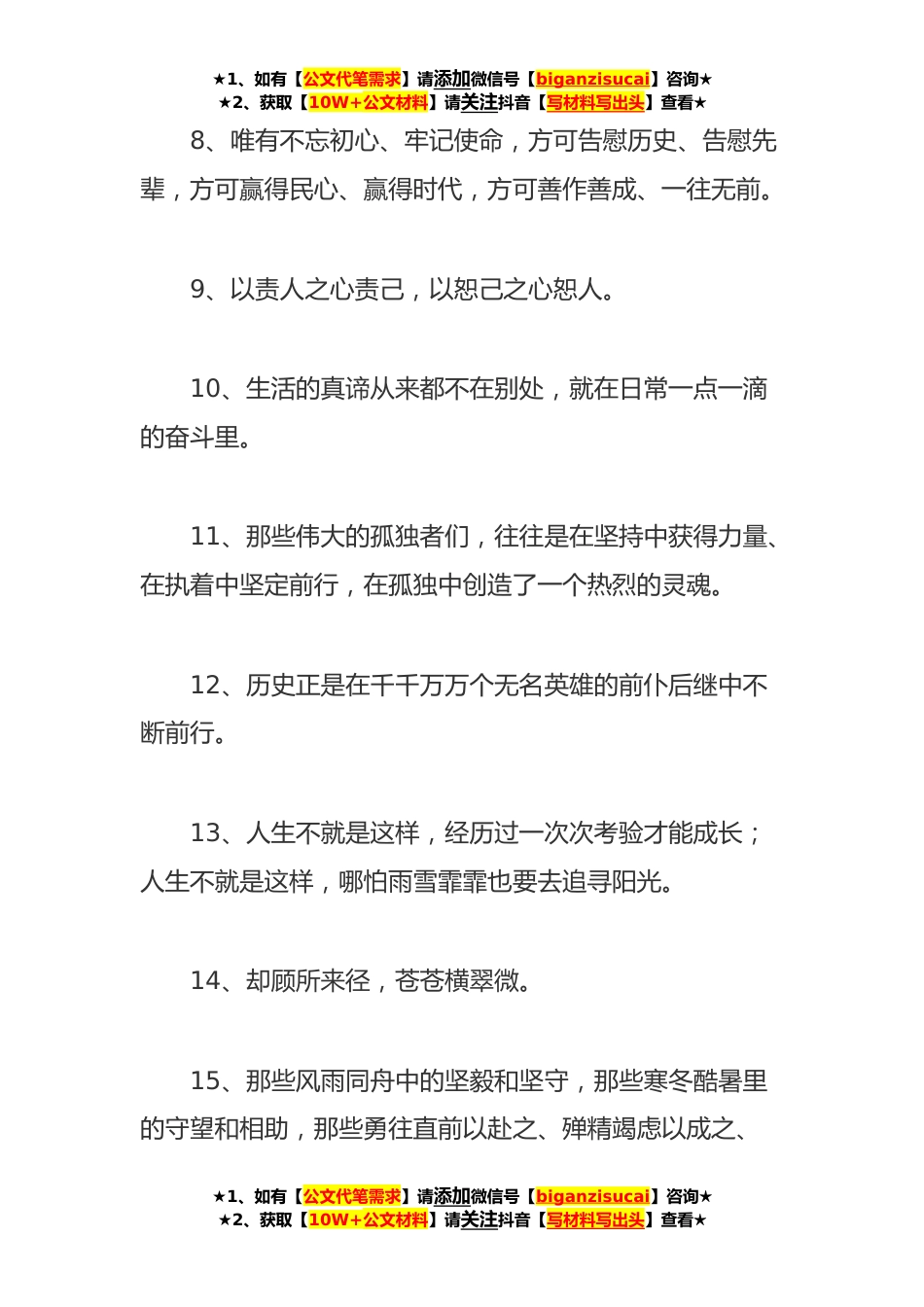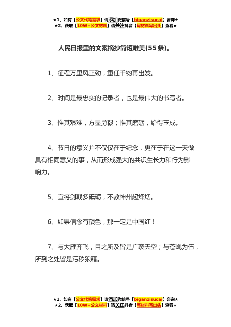 ★1、如有【公文代笔需求】请添加微信号【biganzisucai】咨询★★2、获取【10W+公文材料】请关注抖音【写材料写出头】查看★人民日报里的文案摘抄简短唯美(55条)。1、征程万里风正劲,重任千钧再出发。2、时间是最忠实的记录者,也是最伟大的书写者。3、惟其艰难,方显勇毅;惟其磨砺,始得玉成。4、节日的意义并不仅仅在于纪念,更在于在这一天做具有相同意义的事,从而形成强大的共识生长力和行为影响力。5、宜将剑戟多砥砺,不教神州起烽烟。6、如果信念有颜色,那一定是中国红!7、与大雁齐飞,目之所及皆是广袤天空;与苍蝇为伍,所到之处皆是污秽狼藉。★1、如有【公文代笔需求】请添加微信号【biganzisucai】咨询★★2、获取【10W+公文材料】请关注抖音【写材料写出头】查看★★1、如有【公文代笔需求】请...
