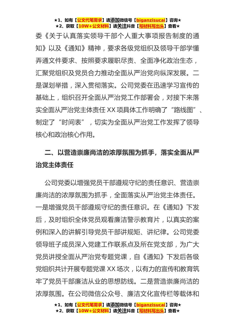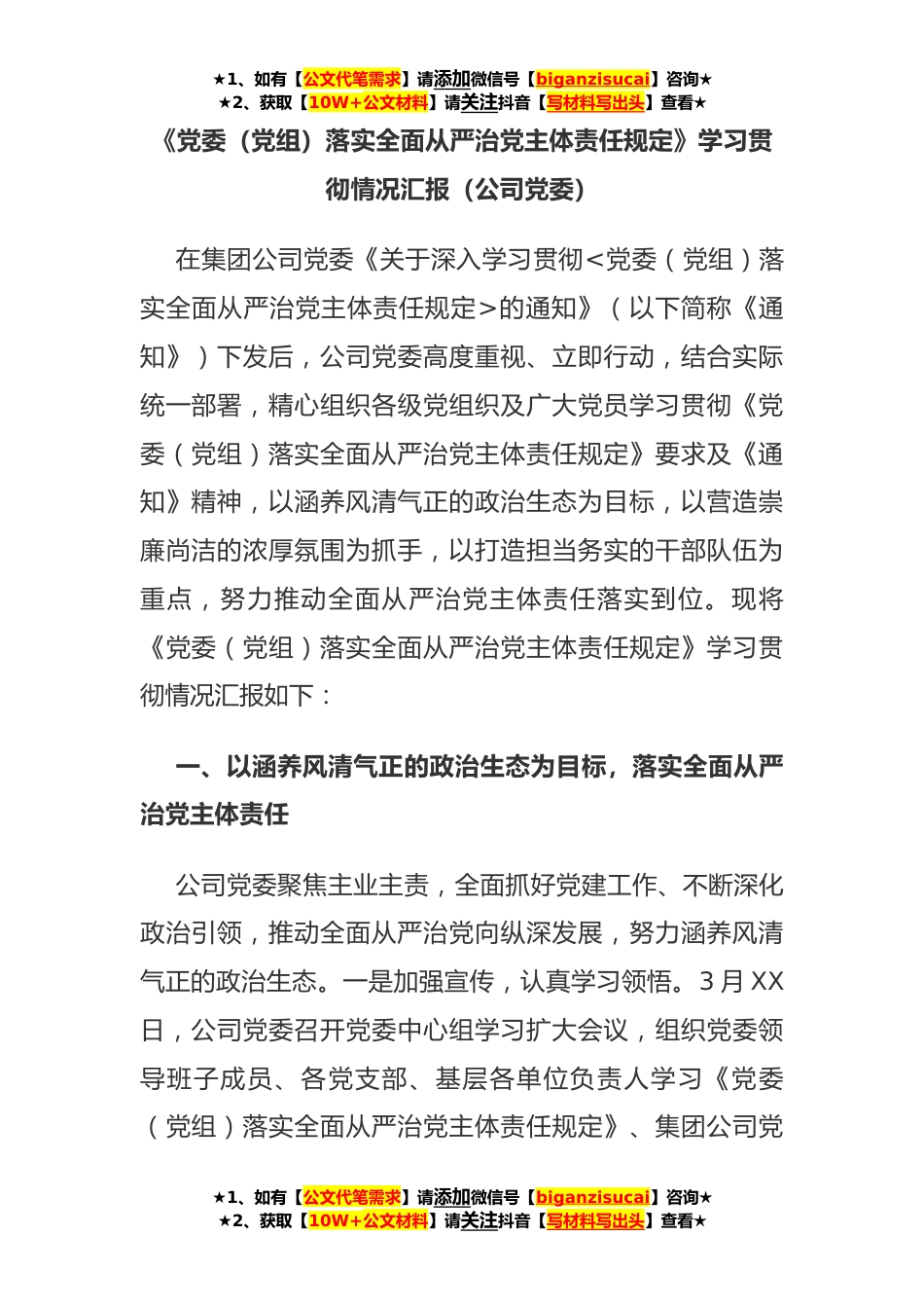 ★1、如有【公文代笔需求】请添加微信号【biganzisucai】咨询★★2、获取【10W+公文材料】请关注抖音【写材料写出头】查看★《党委(党组)落实全面从严治党主体责任规定》学习贯彻情况汇报(公司党委)在集团公司党委《关于深入学习贯彻<党委(党组)落实全面从严治党主体责任规定>的通知》(以下简称《通知》)下发后,公司党委高度重视、立即行动,结合实际统一部署,精心组织各级党组织及广大党员学习贯彻《党委(党组)落实全面从严治党主体责任规定》要求及《通知》精神,以涵养风清气正的政治生态为目标,以营造崇廉尚洁的浓厚氛围为抓手,以打造担当务实的干部队伍为重点,努力推动全面从严治党主体责任落实到位。现将《党委(党组)落实全面从严治党主体责任规定》学习贯彻情况汇报如下:一、以涵养风清...