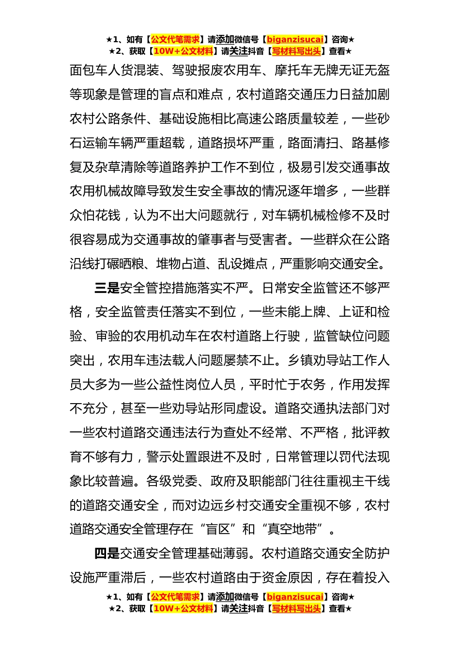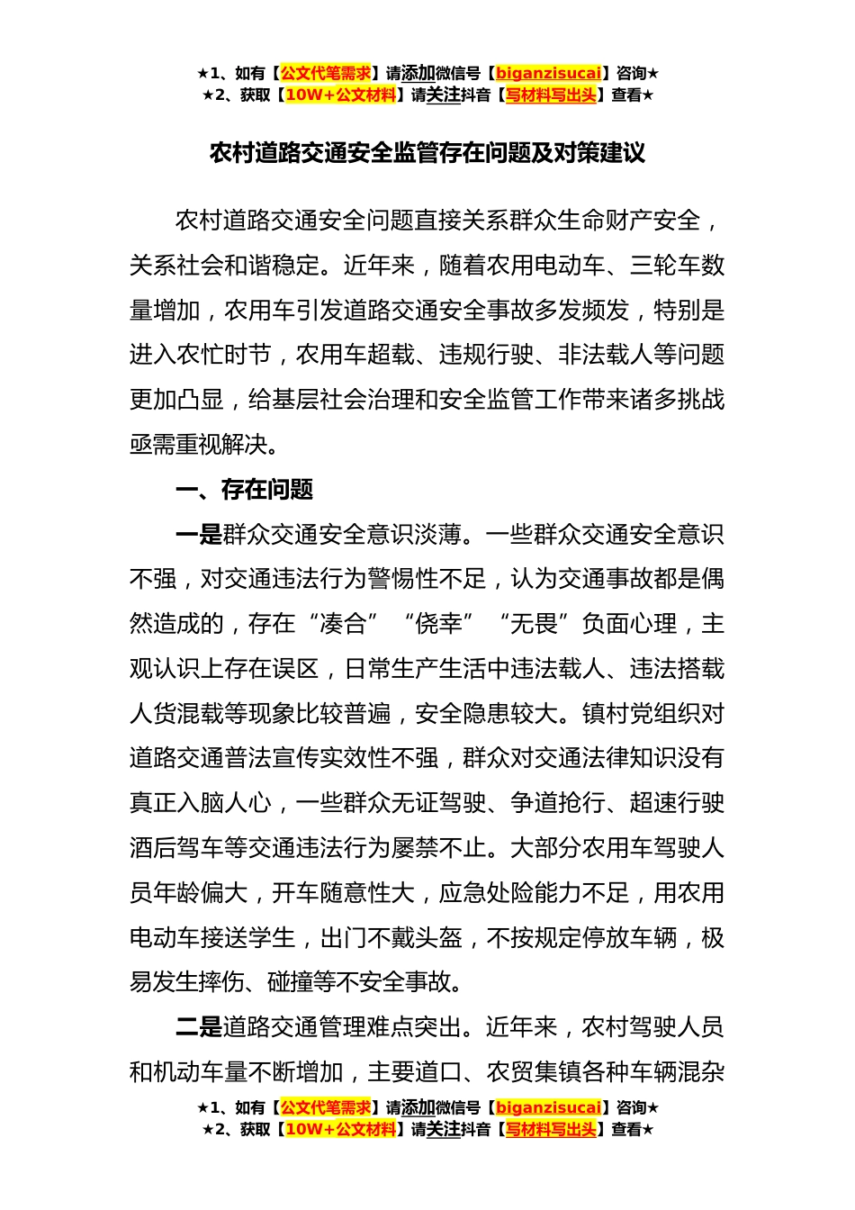 ★1、如有【公文代笔需求】请添加微信号【biganzisucai】咨询★★2、获取【10W+公文材料】请关注抖音【写材料写出头】查看★农村道路交通安全监管存在问题及对策建议农村道路交通安全问题直接关系群众生命财产安全,关系社会和谐稳定。近年来,随着农用电动车、三轮车数量增加,农用车引发道路交通安全事故多发频发,特别是进入农忙时节,农用车超载、违规行驶、非法载人等问题更加凸显,给基层社会治理和安全监管工作带来诸多挑战亟需重视解决。一、存在问题一是群众交通安全意识淡薄。一些群众交通安全意识不强,对交通违法行为警惕性不足,认为交通事故都是偶然造成的,存在“凑合”“侥幸”“无畏”负面心理,主观认识上存在误区,日常生产生活中违法载人、违法搭载人货混载等现象比较普遍,安全隐患较大。镇...