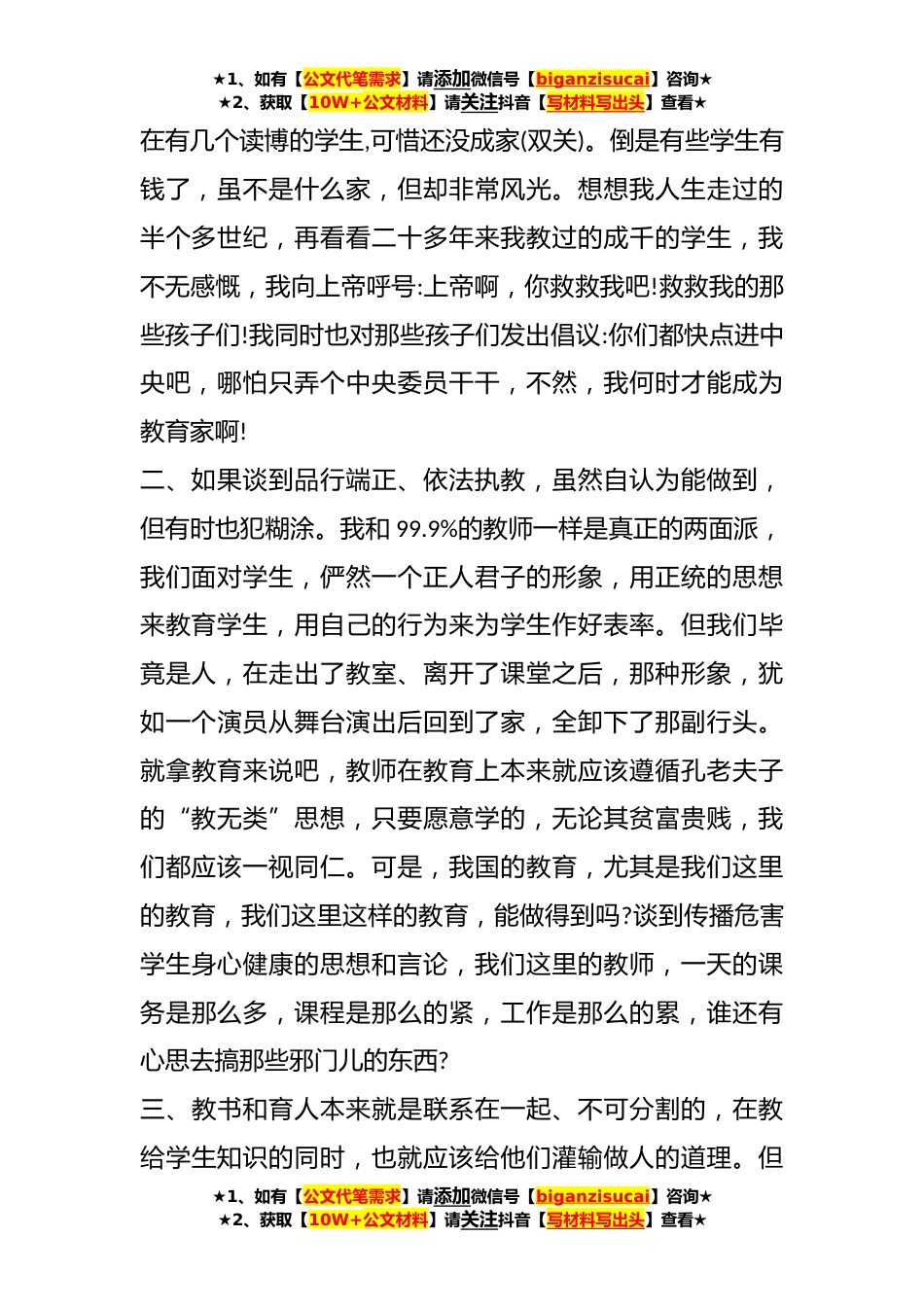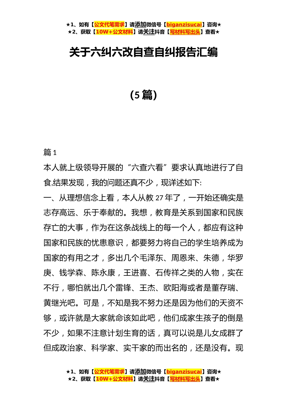 ★1、如有【公文代笔需求】请添加微信号【biganzisucai】咨询★★2、获取【10W+公文材料】请关注抖音【写材料写出头】查看★关于六纠六改自查自纠报告汇编(5篇)篇1本人就上级领导开展的“六查六看”要求认真地进行了自食,结果发现,我的问题还真不少,现详述如下:一、从理想信念上看,本人从教27年了,一开始还确实是志存高远、乐于奉献的。我想,教育是关系到国家和民族存亡的大事,作为在这条战线上的每一个人,都应有这种国家和民族的忧患意识,都要努力将自己的学生培养成为国家的有用之才,多出几个毛泽东、周恩来、朱德,华罗庚、钱学森、陈永康,王进喜、石传祥之类的人物,实在不行,哪怕就出几个雷锋、王杰、欧阳海或者是董存瑞、黄继光吧。可是,不知是我不努力还是因为他们的天资不够,或许就是大家...