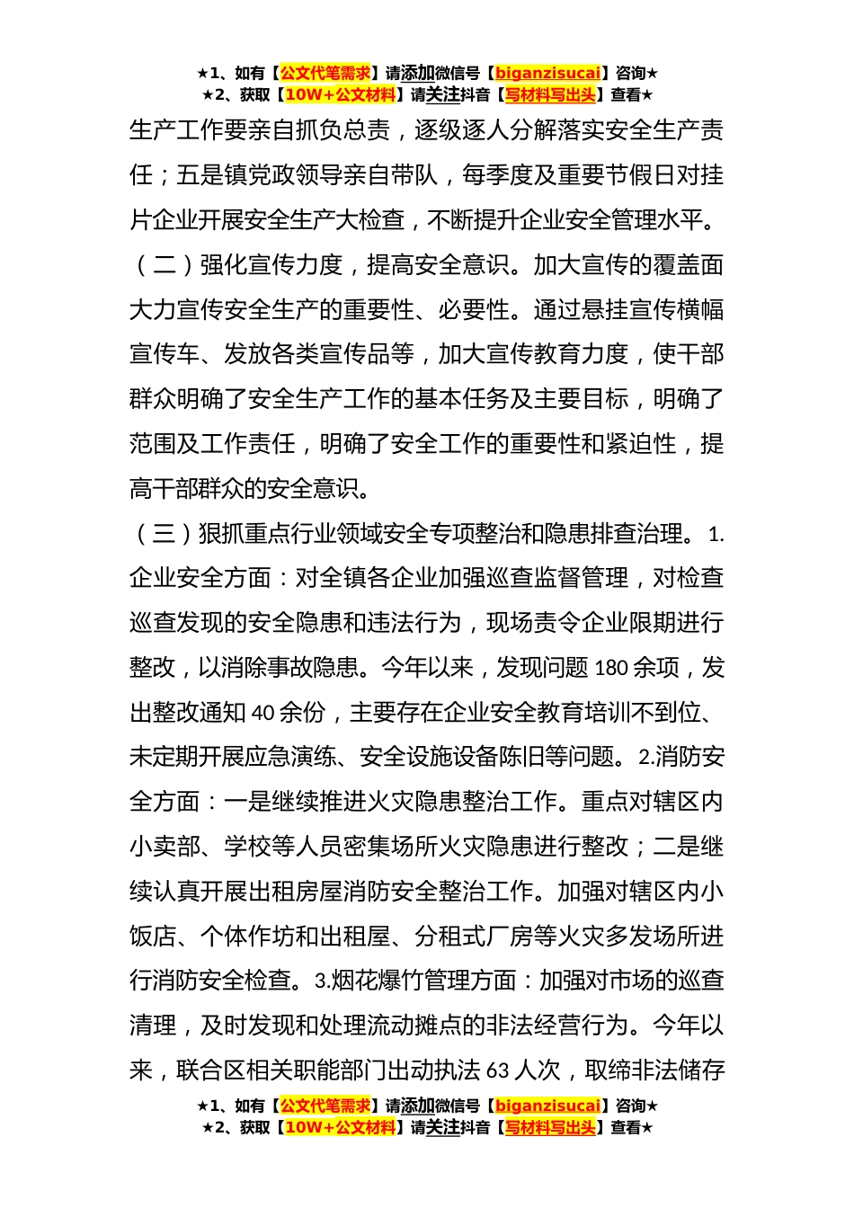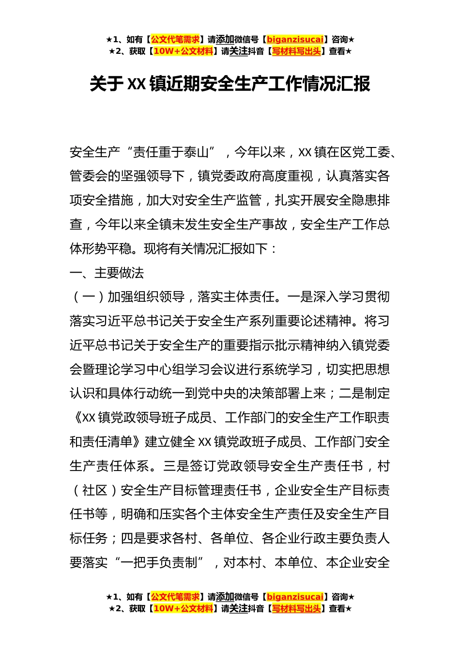★1、如有【公文代笔需求】请添加微信号【biganzisucai】咨询★★2、获取【10W+公文材料】请关注抖音【写材料写出头】查看★关于XX镇近期安全生产工作情况汇报安全生产“责任重于泰山”,今年以来,XX镇在区党工委、管委会的坚强领导下,镇党委政府高度重视,认真落实各项安全措施,加大对安全生产监管,扎实开展安全隐患排查,今年以来全镇未发生安全生产事故,安全生产工作总体形势平稳。现将有关情况汇报如下:一、主要做法(一)加强组织领导,落实主体责任。一是深入学习贯彻落实习近平总书记关于安全生产系列重要论述精神。将习近平总书记关于安全生产的重要指示批示精神纳入镇党委会暨理论学习中心组学习会议进行系统学习,切实把思想认识和具体行动统一到党中央的决策部署上来;二是制定《XX镇党政领导班...