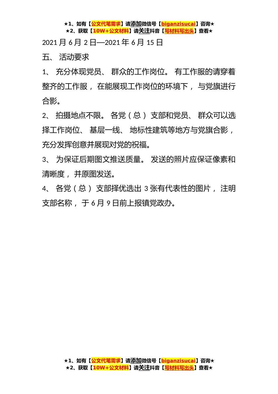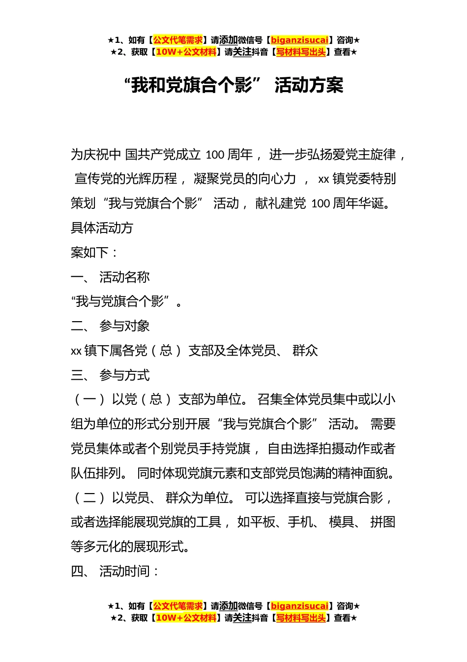 ★1、如有【公文代笔需求】请添加微信号【biganzisucai】咨询★★2、获取【10W+公文材料】请关注抖音【写材料写出头】查看★“我和党旗合个影”活动方案为庆祝中国共产党成立100周年,进一步弘扬爱党主旋律,宣传党的光辉历程,凝聚党员的向心力,xx镇党委特别策划“我与党旗合个影”活动,献礼建党100周年华诞。具体活动方案如下:一、活动名称“我与党旗合个影”。二、参与对象xx镇下属各党(总)支部及全体党员、群众三、参与方式(一)以党(总)支部为单位。召集全体党员集中或以小组为单位的形式分别开展“我与党旗合个影”活动。需要党员集体或者个别党员手持党旗,自由选择拍摄动作或者队伍排列。同时体现党旗元素和支部党员饱满的精神面貌。(二)以党员、群众为单位。可以选择直接与党旗合影,或者选择...