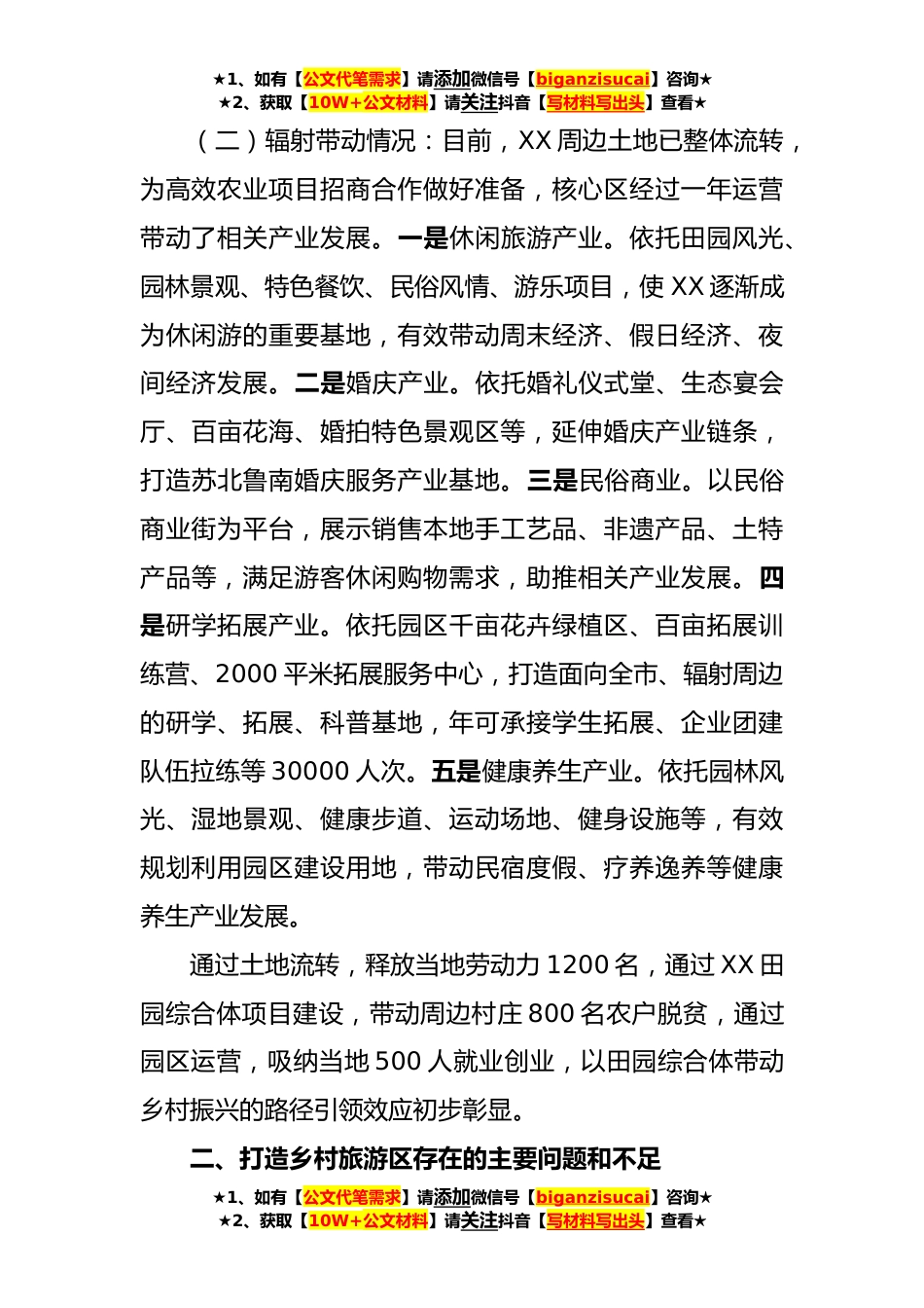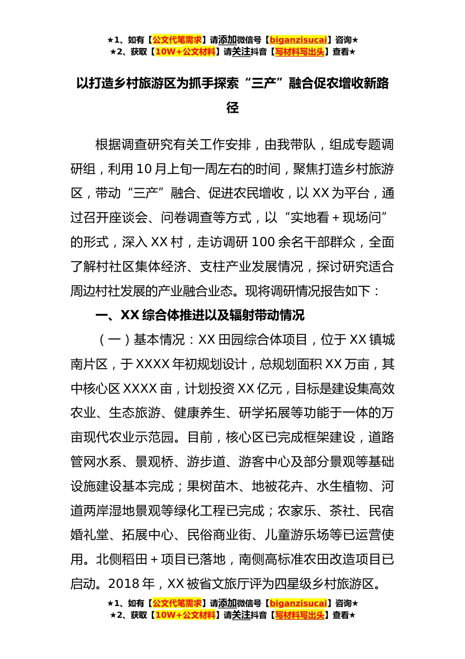 ★1、如有【公文代笔需求】请添加微信号【biganzisucai】咨询★★2、获取【10W+公文材料】请关注抖音【写材料写出头】查看★以打造乡村旅游区为抓手探索“三产”融合促农增收新路径根据调查研究有关工作安排,由我带队,组成专题调研组,利用10月上旬一周左右的时间,聚焦打造乡村旅游区,带动“三产”融合、促进农民增收,以XX为平台,通过召开座谈会、问卷调查等方式,以“实地看+现场问”的形式,深入XX村,走访调研100余名干部群众,全面了解村社区集体经济、支柱产业发展情况,探讨研究适合周边村社发展的产业融合业态。现将调研情况报告如下:一、XX综合体推进以及辐射带动情况(一)基本情况:XX田园综合体项目,位于XX镇城南片区,于XXXX年初规划设计,总规划面积XX万亩,其中核心区XXXX亩,计划投资XX亿...