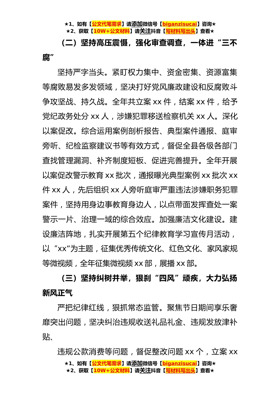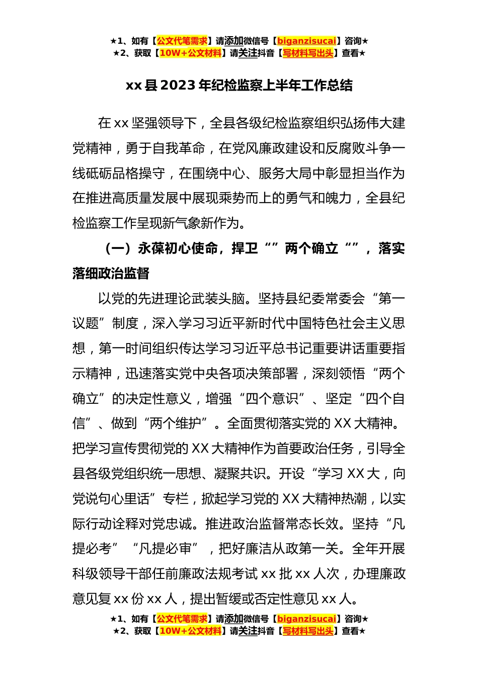 ★1、如有【公文代笔需求】请添加微信号【biganzisucai】咨询★★2、获取【10W+公文材料】请关注抖音【写材料写出头】查看★xx县2023年纪检监察上半年工作总结在xx坚强领导下,全县各级纪检监察组织弘扬伟大建党精神,勇于自我革命,在党风廉政建设和反腐败斗争一线砥砺品格操守,在围绕中心、服务大局中彰显担当作为在推进高质量发展中展现乘势而上的勇气和魄力,全县纪检监察工作呈现新气象新作为。(一)永葆初心使命,捍卫“”两个确立“”,落实落细政治监督以党的先进理论武装头脑。坚持县纪委常委会“第一议题”制度,深入学习习近平新时代中国特色社会主义思想,第一时间组织传达学习习近平总书记重要讲话重要指示精神,迅速落实党中央各项决策部署,深刻领悟“两个确立”的决定性意义,增强“四个意识”...
