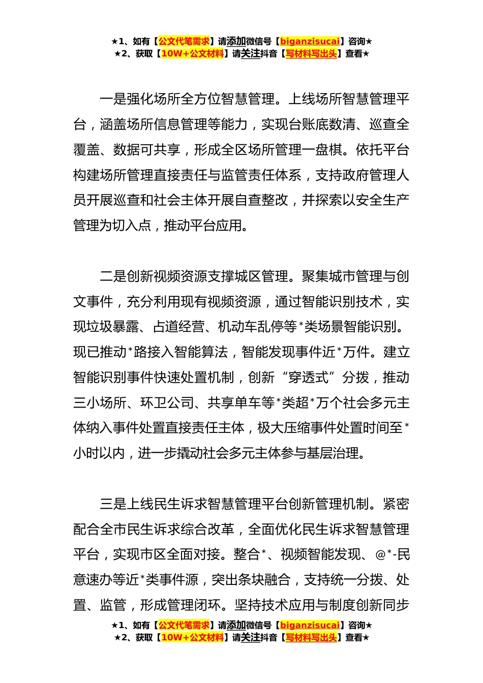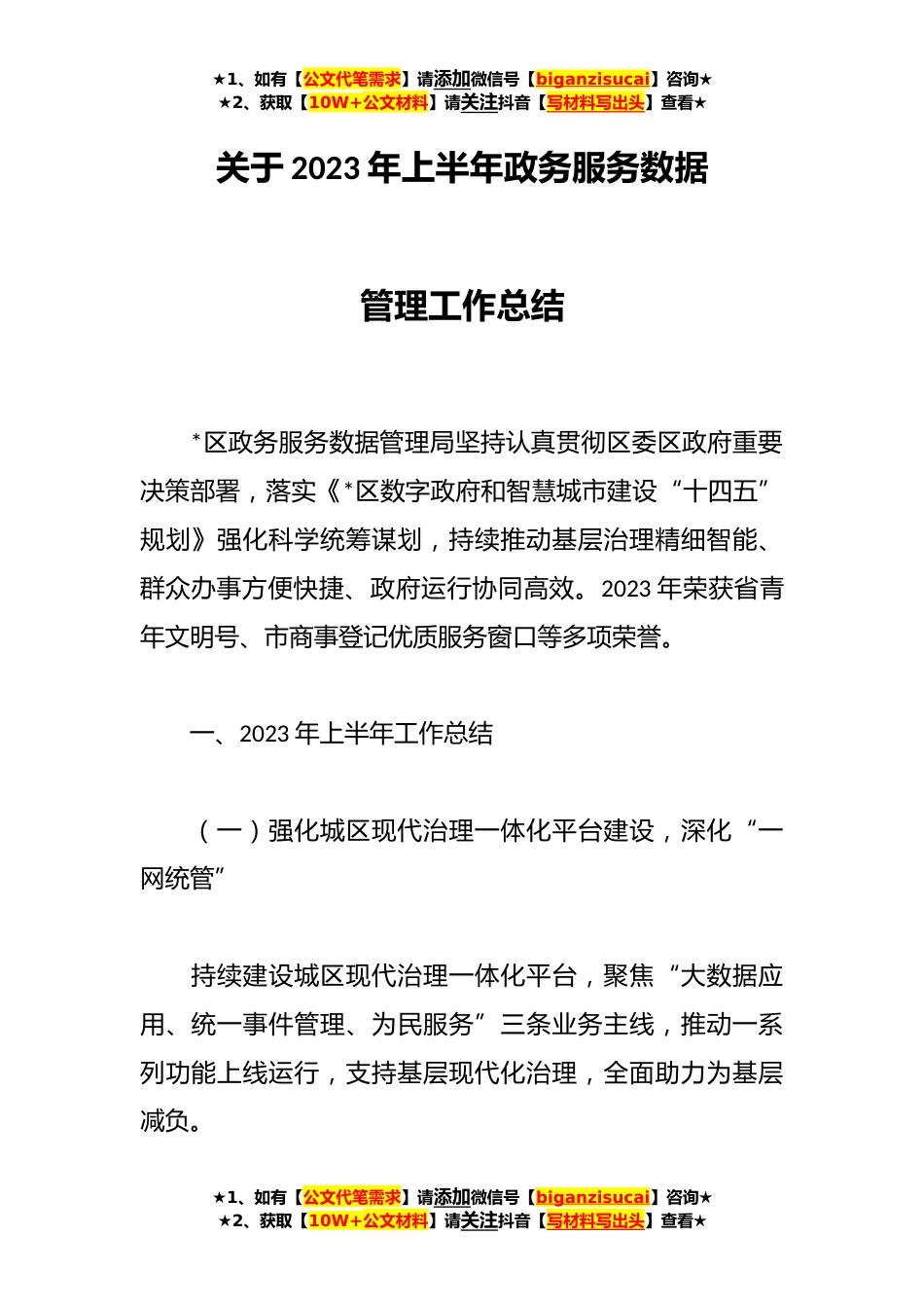 ★1、如有【公文代笔需求】请添加微信号【biganzisucai】咨询★★2、获取【10W+公文材料】请关注抖音【写材料写出头】查看★关于2023年上半年政务服务数据管理工作总结*区政务服务数据管理局坚持认真贯彻区委区政府重要决策部署,落实《*区数字政府和智慧城市建设“十四五”规划》强化科学统筹谋划,持续推动基层治理精细智能、群众办事方便快捷、政府运行协同高效。2023年荣获省青年文明号、市商事登记优质服务窗口等多项荣誉。一、2023年上半年工作总结(一)强化城区现代治理一体化平台建设,深化“一网统管”持续建设城区现代治理一体化平台,聚焦“大数据应用、统一事件管理、为民服务”三条业务主线,推动一系列功能上线运行,支持基层现代化治理,全面助力为基层减负。★1、如有【公文代笔需求】请添加微信...