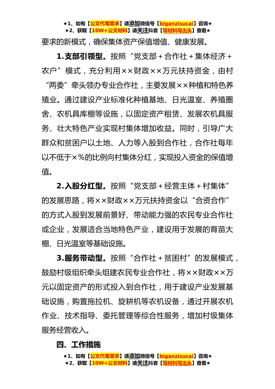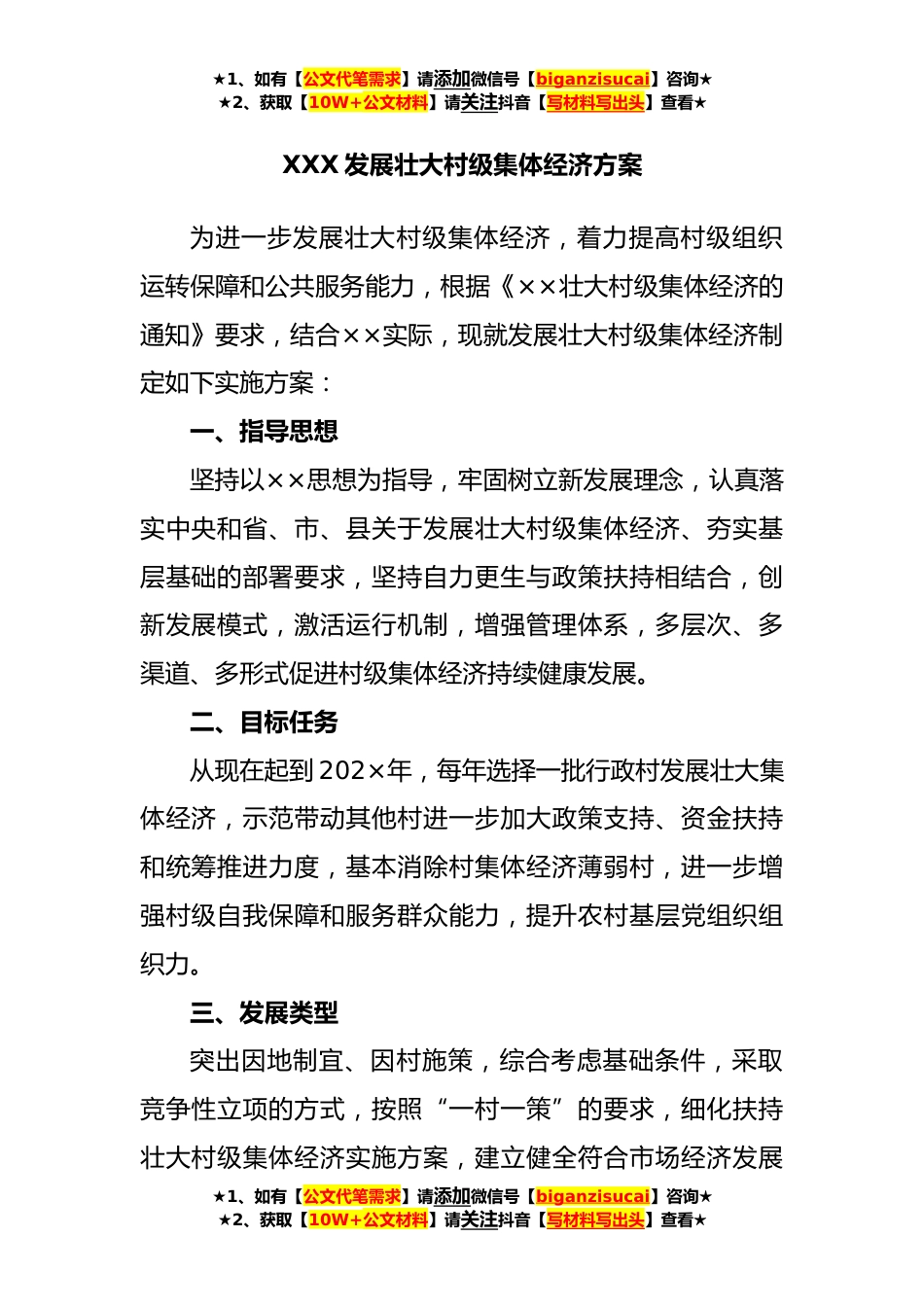 ★1、如有【公文代笔需求】请添加微信号【biganzisucai】咨询★★2、获取【10W+公文材料】请关注抖音【写材料写出头】查看★XXX发展壮大村级集体经济方案为进一步发展壮大村级集体经济,着力提高村级组织运转保障和公共服务能力,根据《××壮大村级集体经济的通知》要求,结合××实际,现就发展壮大村级集体经济制定如下实施方案:一、指导思想坚持以××思想为指导,牢固树立新发展理念,认真落实中央和省、市、县关于发展壮大村级集体经济、夯实基层基础的部署要求,坚持自力更生与政策扶持相结合,创新发展模式,激活运行机制,增强管理体系,多层次、多渠道、多形式促进村级集体经济持续健康发展。二、目标任务从现在起到202×年,每年选择一批行政村发展壮大集体经济,示范带动其他村进一步加大政策支持、...