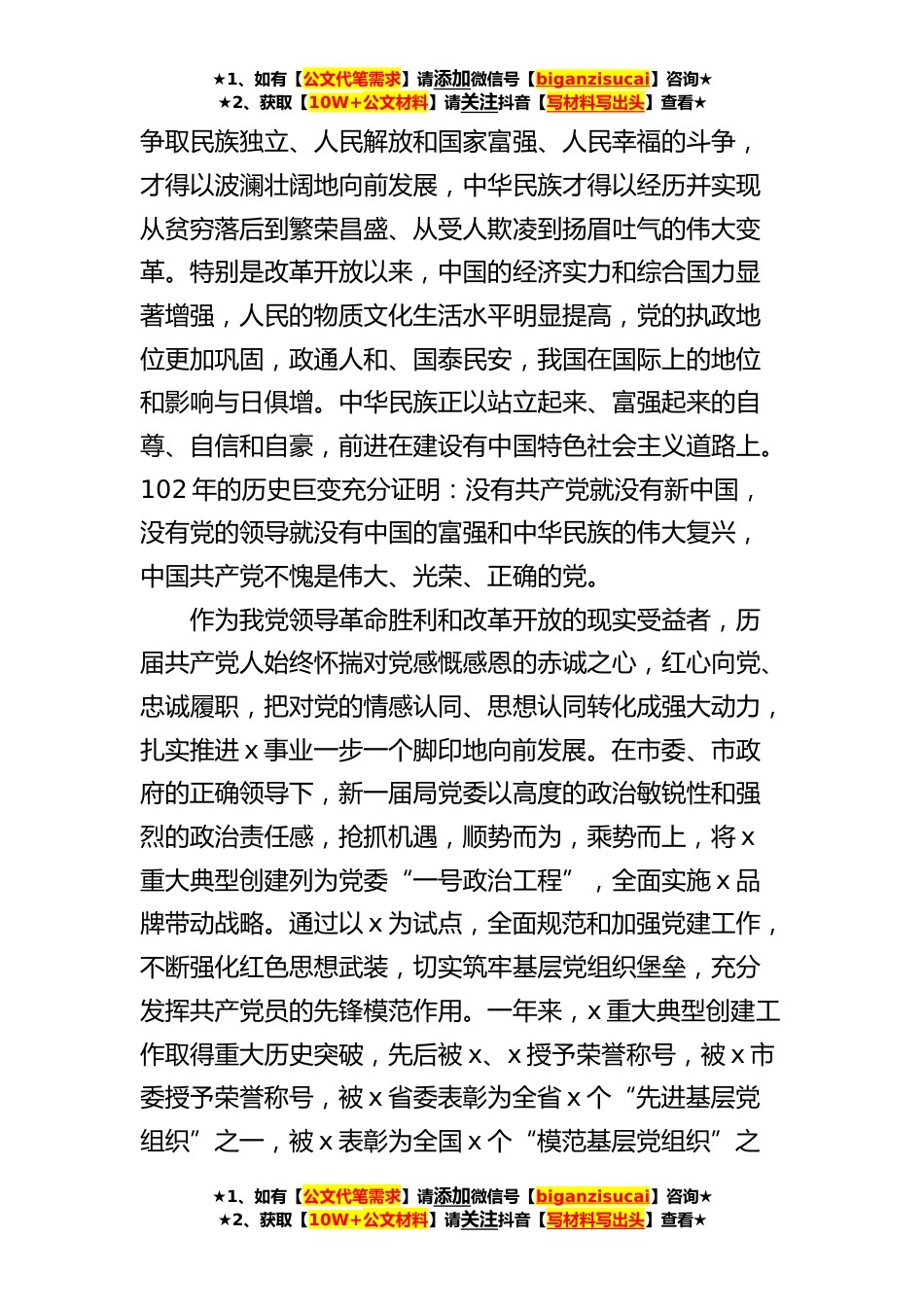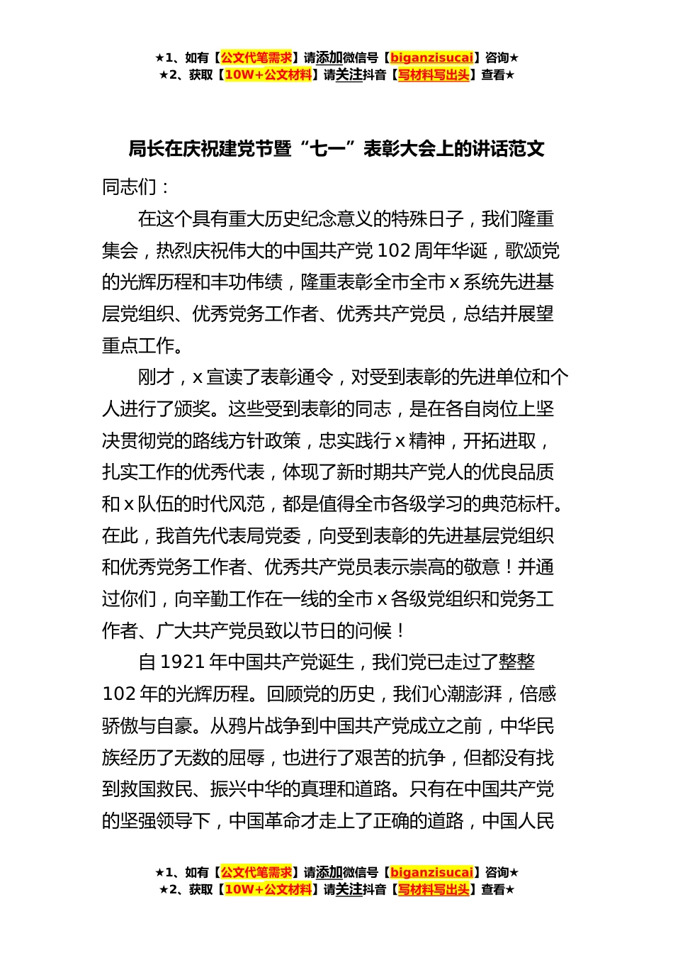 ★1、如有【公文代笔需求】请添加微信号【biganzisucai】咨询★★2、获取【10W+公文材料】请关注抖音【写材料写出头】查看★局长在庆祝建党节暨“七一”表彰大会上的讲话范文同志们:在这个具有重大历史纪念意义的特殊日子,我们隆重集会,热烈庆祝伟大的中国共产党102周年华诞,歌颂党的光辉历程和丰功伟绩,隆重表彰全市全市x系统先进基层党组织、优秀党务工作者、优秀共产党员,总结并展望重点工作。刚才,x宣读了表彰通令,对受到表彰的先进单位和个人进行了颁奖。这些受到表彰的同志,是在各自岗位上坚决贯彻党的路线方针政策,忠实践行x精神,开拓进取,扎实工作的优秀代表,体现了新时期共产党人的优良品质和x队伍的时代风范,都是值得全市各级学习的典范标杆。在此,我首先代表局党委,向受到表彰的先进基...