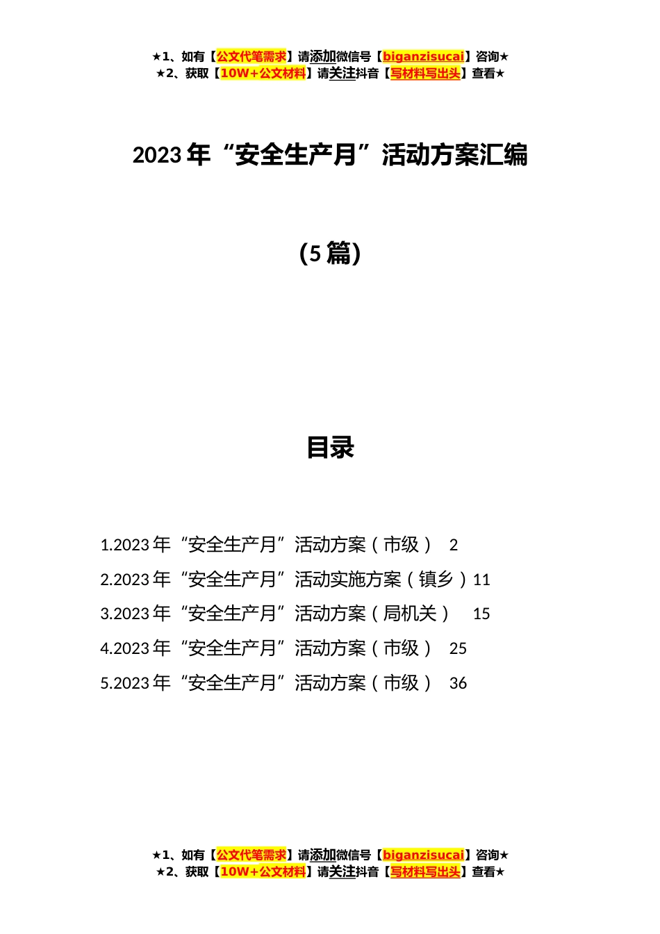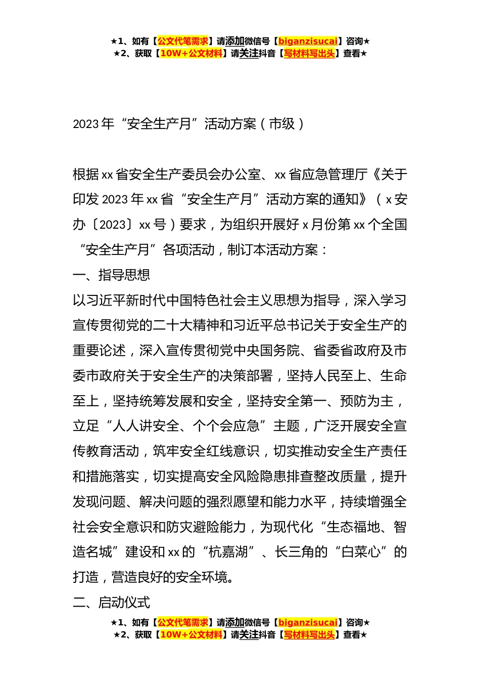 ★1、如有【公文代笔需求】请添加微信号【biganzisucai】咨询★★2、获取【10W+公文材料】请关注抖音【写材料写出头】查看★2023年“安全生产月”活动方案汇编(5篇)目录1.2023年“安全生产月”活动方案(市级)22.2023年“安全生产月”活动实施方案(镇乡)113.2023年“安全生产月”活动方案(局机关)154.2023年“安全生产月”活动方案(市级)255.2023年“安全生产月”活动方案(市级)36★1、如有【公文代笔需求】请添加微信号【biganzisucai】咨询★★2、获取【10W+公文材料】请关注抖音【写材料写出头】查看★★1、如有【公文代笔需求】请添加微信号【biganzisucai】咨询★★2、获取【10W+公文材料】请关注抖音【写材料写出头】查看★2023年“安全生产月”活动方案(市级)根据xx省安全生产委员会办公室、x...
