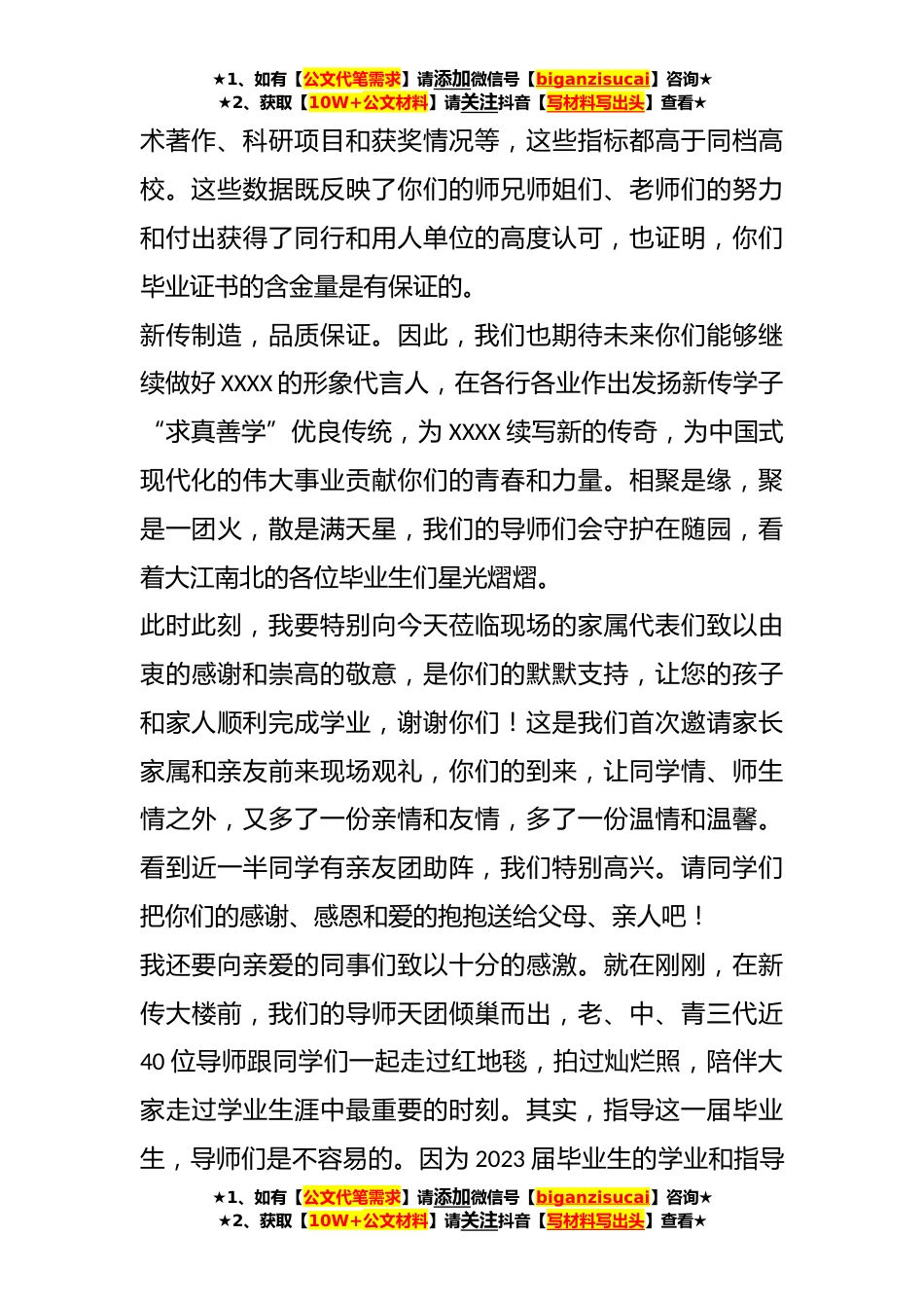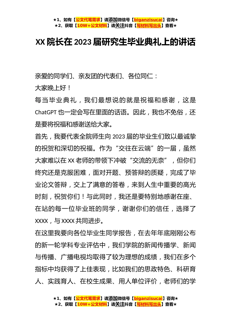 ★1、如有【公文代笔需求】请添加微信号【biganzisucai】咨询★★2、获取【10W+公文材料】请关注抖音【写材料写出头】查看★XX院长在2023届研究生毕业典礼上的讲话亲爱的同学们、亲友团的代表们、各位同仁:大家晚上好!每当毕业典礼,我们最想说的就是祝福和感谢,这是ChatGPT也一定会写在里面的话语。因此,我也不免俗,还是要将祝福和感谢送给大家。首先,我要代表全院师生向2023届的毕业生们致以最诚挚的祝贺和深切的祝福。作为“交往在云端”的一届,虽然大家难以在XX老师的带领下冲破“交流的无奈”,但你们终究还是克服困难,面对开题、预答辩的质疑,完成了毕业论文答辩,交上了满意的答卷,来到人生中重要的高光时刻,祝贺你们!与此同时,我还是要特别地感谢在座、在站的每一位毕业班的同学,谢谢你们的...