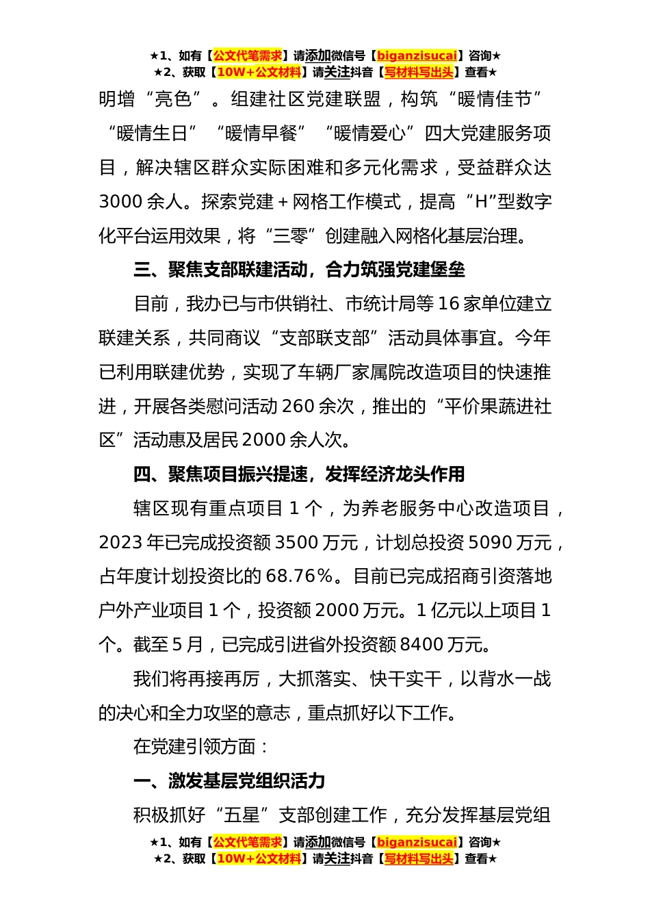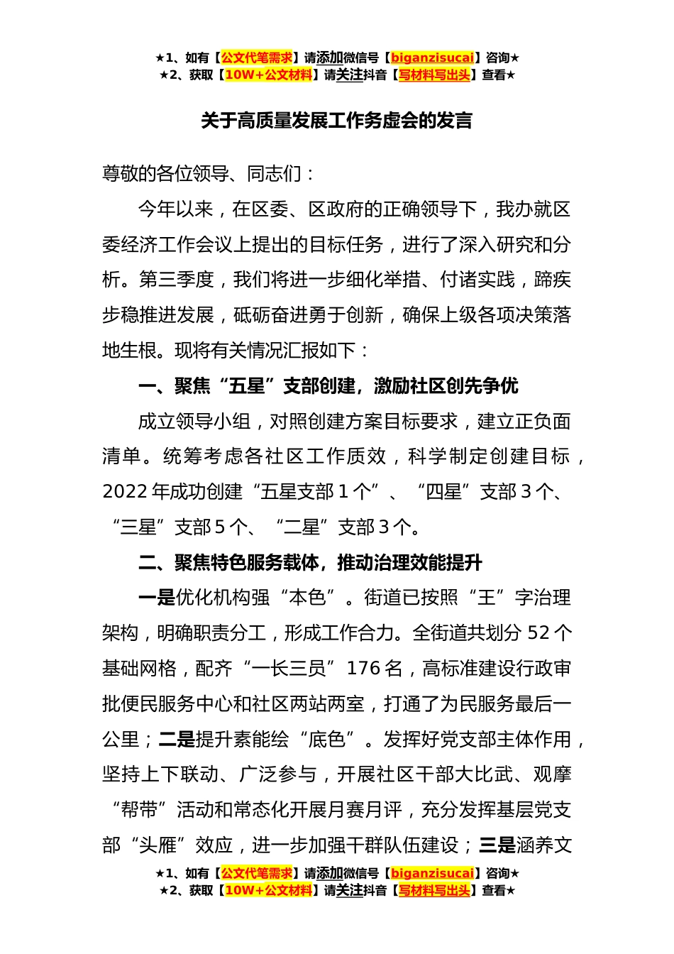 ★1、如有【公文代笔需求】请添加微信号【biganzisucai】咨询★★2、获取【10W+公文材料】请关注抖音【写材料写出头】查看★关于高质量发展工作务虚会的发言尊敬的各位领导、同志们:今年以来,在区委、区政府的正确领导下,我办就区委经济工作会议上提出的目标任务,进行了深入研究和分析。第三季度,我们将进一步细化举措、付诸实践,蹄疾步稳推进发展,砥砺奋进勇于创新,确保上级各项决策落地生根。现将有关情况汇报如下:一、聚焦“五星”支部创建,激励社区创先争优成立领导小组,对照创建方案目标要求,建立正负面清单。统筹考虑各社区工作质效,科学制定创建目标,2022年成功创建“五星支部1个”、“四星”支部3个、“三星”支部5个、“二星”支部3个。二、聚焦特色服务载体,推动治理效能提升一是优化机...
