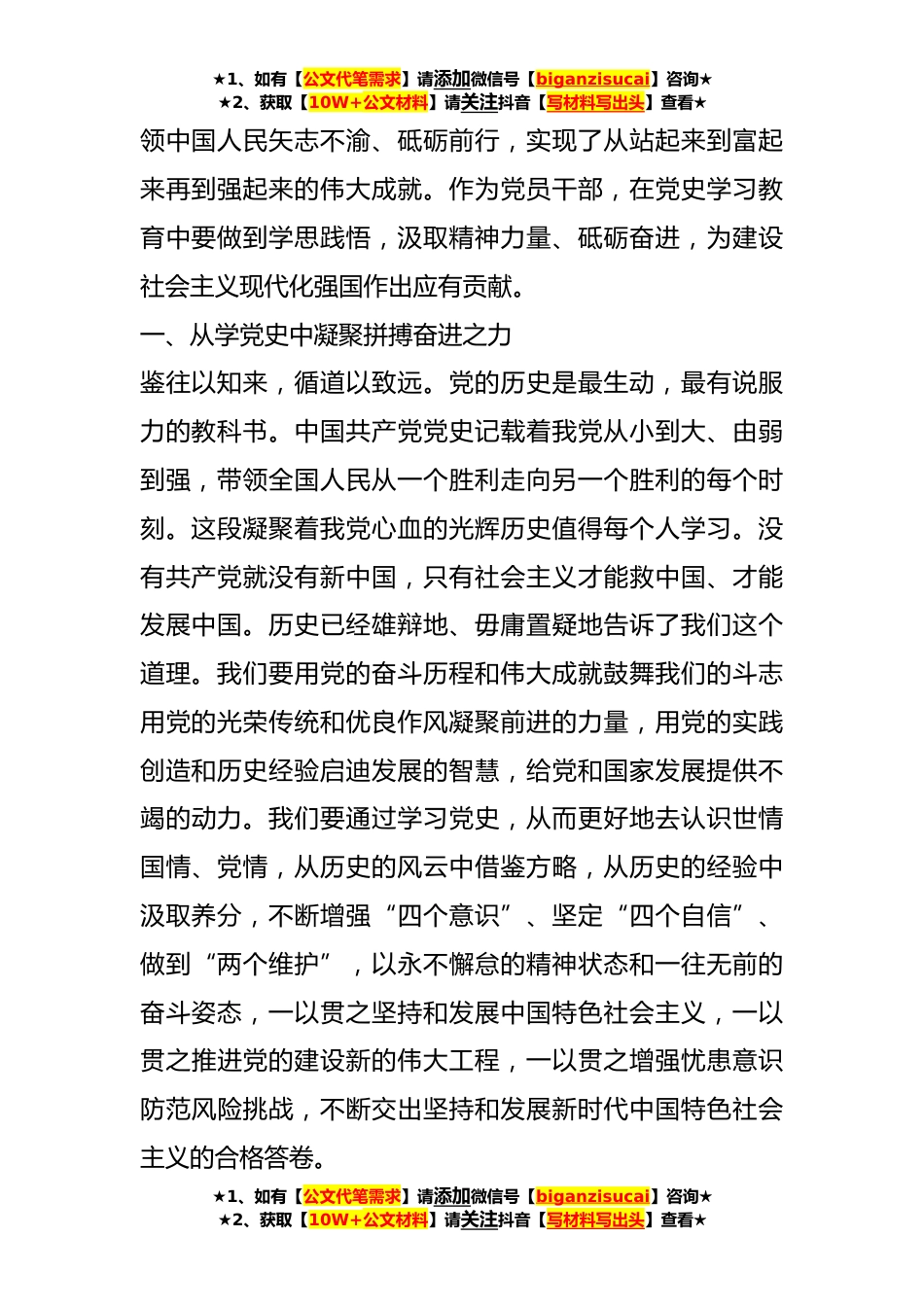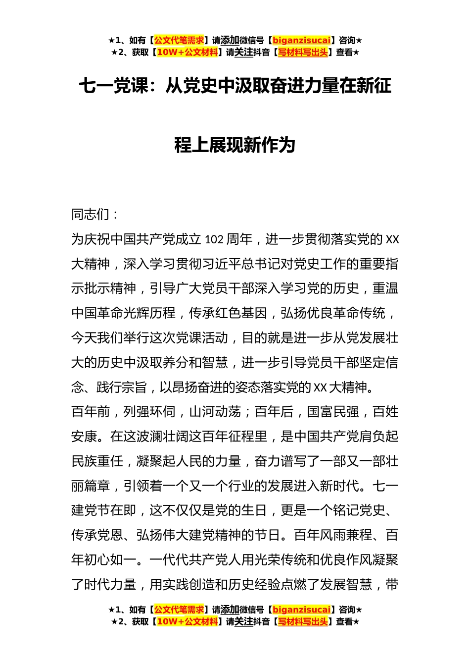 ★1、如有【公文代笔需求】请添加微信号【biganzisucai】咨询★★2、获取【10W+公文材料】请关注抖音【写材料写出头】查看★七一党课:从党史中汲取奋进力量在新征程上展现新作为同志们:为庆祝中国共产党成立102周年,进一步贯彻落实党的XX大精神,深入学习贯彻习近平总书记对党史工作的重要指示批示精神,引导广大党员干部深入学习党的历史,重温中国革命光辉历程,传承红色基因,弘扬优良革命传统,今天我们举行这次党课活动,目的就是进一步从党发展壮大的历史中汲取养分和智慧,进一步引导党员干部坚定信念、践行宗旨,以昂扬奋进的姿态落实党的XX大精神。百年前,列强环伺,山河动荡;百年后,国富民强,百姓安康。在这波澜壮阔这百年征程里,是中国共产党肩负起民族重任,凝聚起人民的力量,奋力谱写了一部...
