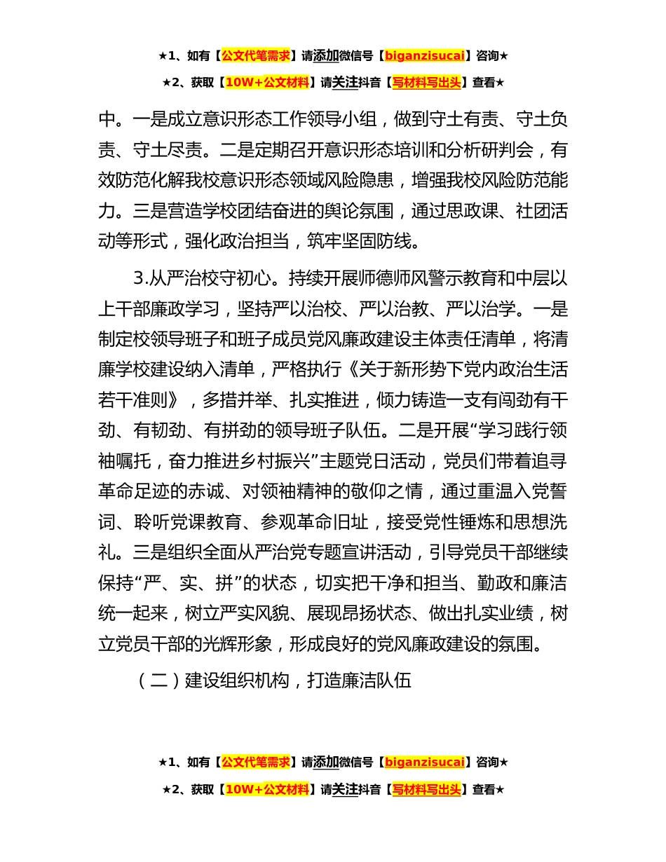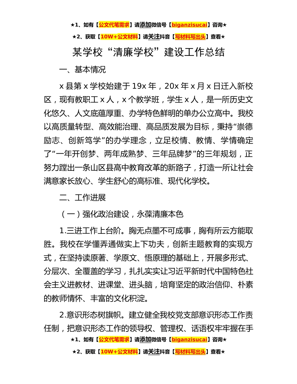 ★1、如有【公文代笔需求】请添加微信号【biganzisucai】咨询★★2、获取【10W+公文材料】请关注抖音【写材料写出头】查看★某学校“清廉学校”建设工作总结一、基本情况x县第x学校始建于19x年,20x年x月x日迁入新校区,现有教职工x人,x个教学班,学生x人,是一所历史文化悠久、人文底蕴厚重、办学特色鲜明的单办公立高中。我校“以高质量转型、高效能治理、高品质发展为目标,秉持崇德”励志、创新笃学的办学理念,立足校情、教情、学情确定“”了一年开创梦、两年成熟梦、三年品牌梦的三年规划,正努力蹚出一条山区县高中教育改革的新路子,打造一所让社会满意家长放心、学生舒心的高标准、现代化学校。二、工作进展(一)强化政治建设,永葆清廉本色1.三进工作上台阶。胸无点墨不可成事,胸有所云方能取胜。我...