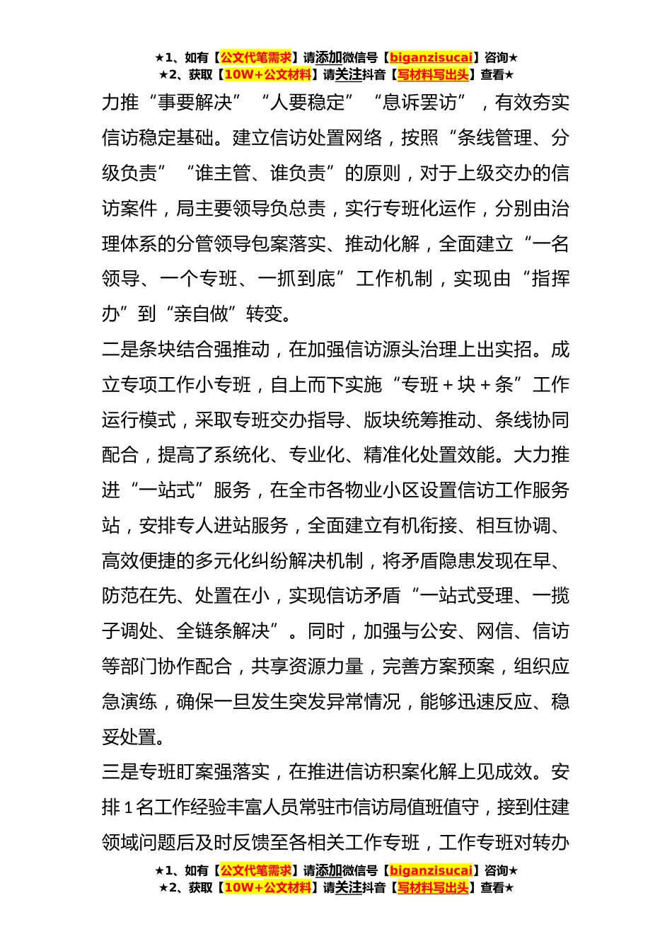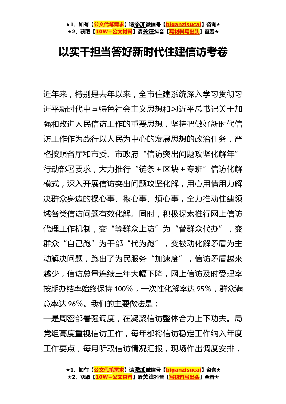 ★1、如有【公文代笔需求】请添加微信号【biganzisucai】咨询★★2、获取【10W+公文材料】请关注抖音【写材料写出头】查看★以实干担当答好新时代住建信访考卷近年来,特别是去年以来,全市住建系统深入学习贯彻习近平新时代中国特色社会主义思想和习近平总书记关于加强和改进人民信访工作的重要思想,坚持把做好新时代信访工作作为践行以人民为中心的发展思想的政治任务,严格按照省厅和市委、市政府“信访突出问题攻坚化解年”行动部署要求,大力推行“链条+区块+专班”信访化解模式,深入开展信访突出问题攻坚化解,用心用情用力解决群众身边的操心事、揪心事、烦心事,全力推动住建领域各类信访问题有效化解。同时,积极探索推行网上信访代理工作机制,变“等群众上访”为“替群众代办”,变群众“自己跑”...