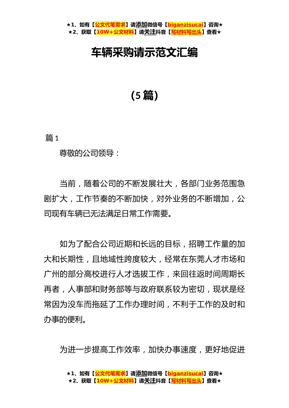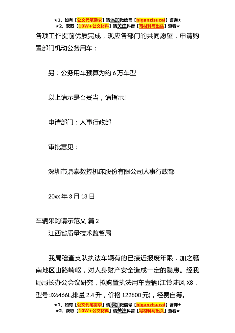 ★1、如有【公文代笔需求】请添加微信号【biganzisucai】咨询★★2、获取【10W+公文材料】请关注抖音【写材料写出头】查看★车辆采购请示范文汇编(5篇)篇1尊敬的公司领导:当前,随着公司的不断发展壮大,各部门业务范围急剧扩大,工作节奏的不断加快,对外业务的不断增加,公司现有车辆已无法满足日常工作需要。如为了配合公司近期和长远的目标,招聘工作量的加大和长期性,且地域性跨度较大,经常在东莞人才市场和广州的部分高校进行人才选拔工作,来回往返时间周期长再者,人事部和财务部等与政府联系较为密切,现状是经常因为没车而拖延了工作办理时间,不利于工作的及时和办事的便利。为进一步提高工作效率,加快办事速度,更好地促进★1、如有【公文代笔需求】请添加微信号【biganzisucai】咨询★★2、获...