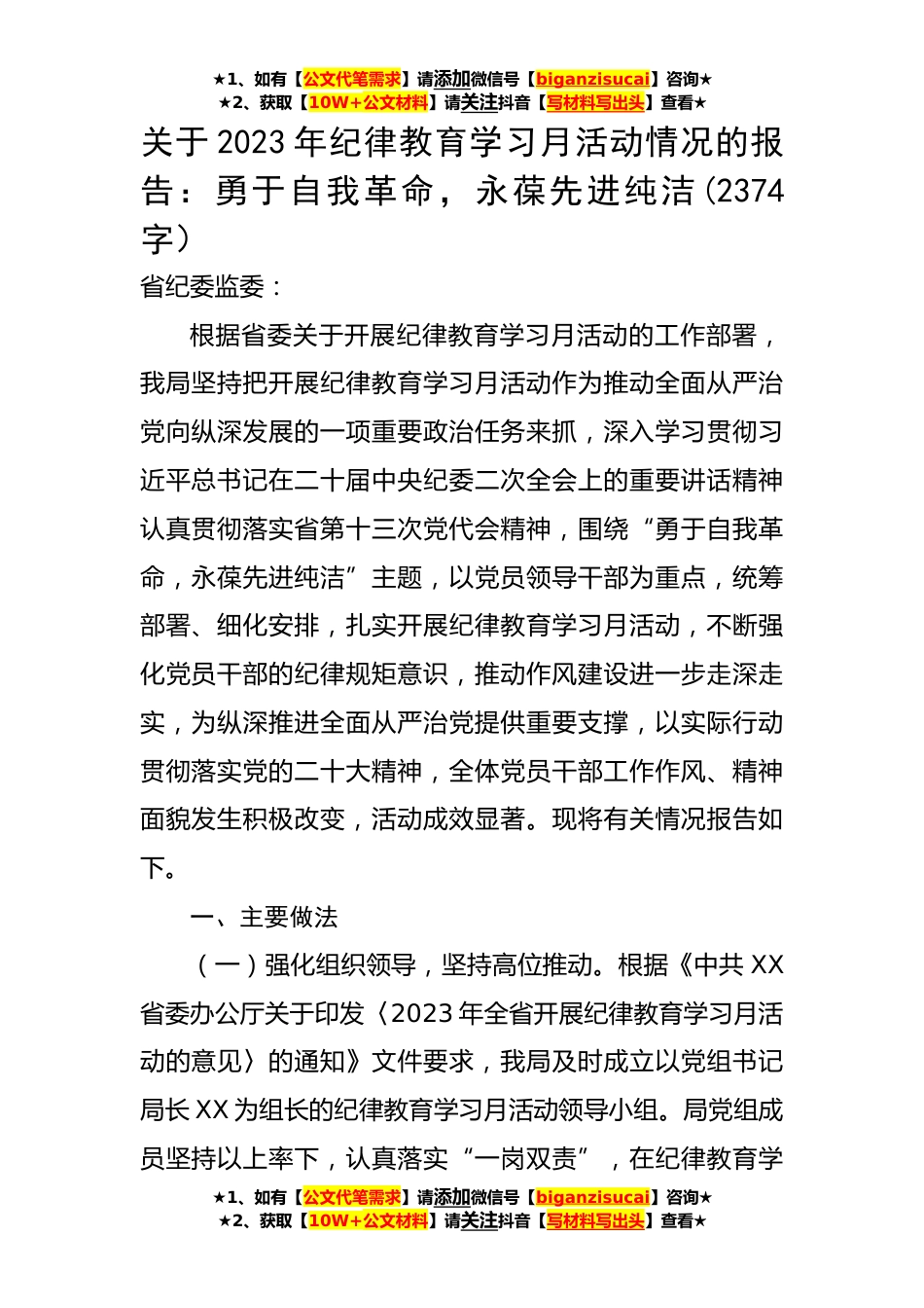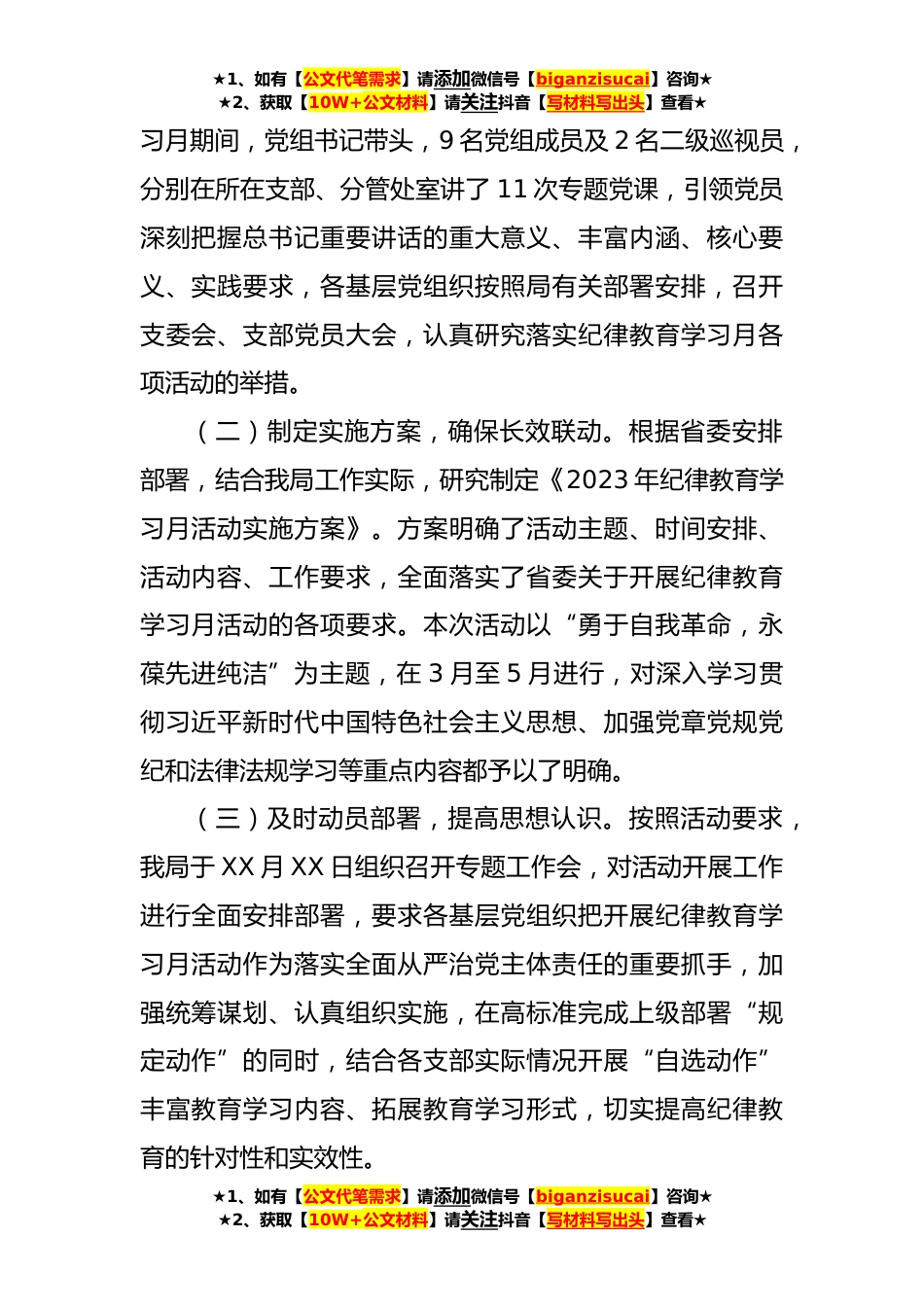 ★1、如有【公文代笔需求】请添加微信号【biganzisucai】咨询★★2、获取【10W+公文材料】请关注抖音【写材料写出头】查看★关于2023年纪律教育学习月活动情况的报告:勇于自我革命,永葆先进纯洁(2374字)省纪委监委:根据省委关于开展纪律教育学习月活动的工作部署,我局坚持把开展纪律教育学习月活动作为推动全面从严治党向纵深发展的一项重要政治任务来抓,深入学习贯彻习近平总书记在二十届中央纪委二次全会上的重要讲话精神认真贯彻落实省第十三次党代会精神,围绕“勇于自我革命,永葆先进纯洁”主题,以党员领导干部为重点,统筹部署、细化安排,扎实开展纪律教育学习月活动,不断强化党员干部的纪律规矩意识,推动作风建设进一步走深走实,为纵深推进全面从严治党提供重要支撑,以实际行动贯彻落实党的二...