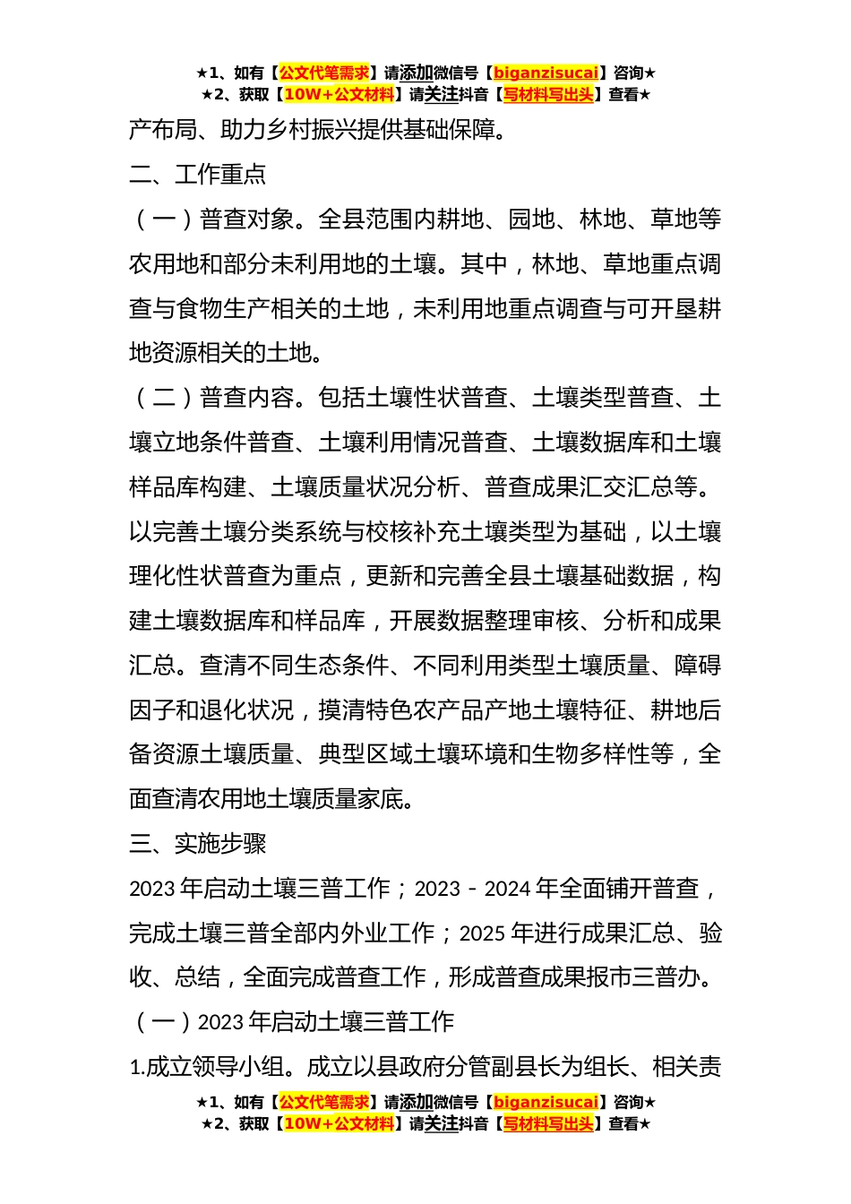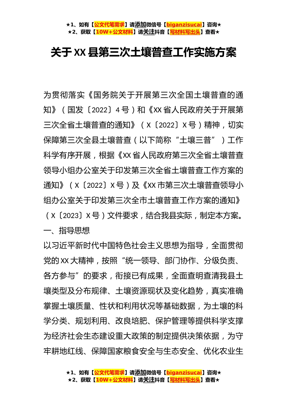 ★1、如有【公文代笔需求】请添加微信号【biganzisucai】咨询★★2、获取【10W+公文材料】请关注抖音【写材料写出头】查看★关于XX县第三次土壤普查工作实施方案为贯彻落实《国务院关于开展第三次全国土壤普查的通知》(国发〔2022〕4号)和《XX省人民政府关于开展第三次全省土壤普查的通知》(X〔2022〕X号)精神,切实保障第三次全县土壤普查(以下简称“土壤三普”)工作科学有序开展,根据《XX省人民政府第三次全省土壤普查领导小组办公室关于印发第三次全省土壤普查工作方案的通知》(X〔2022〕X号)及《XX市第三次土壤普查领导小组办公室关于印发第三次全市土壤普查工作方案的通知》(X〔2023〕X号)文件要求,结合我县实际,制定本方案。一、指导思想以习近平新时代中国特色社会主义思想为指导,全面贯彻党...