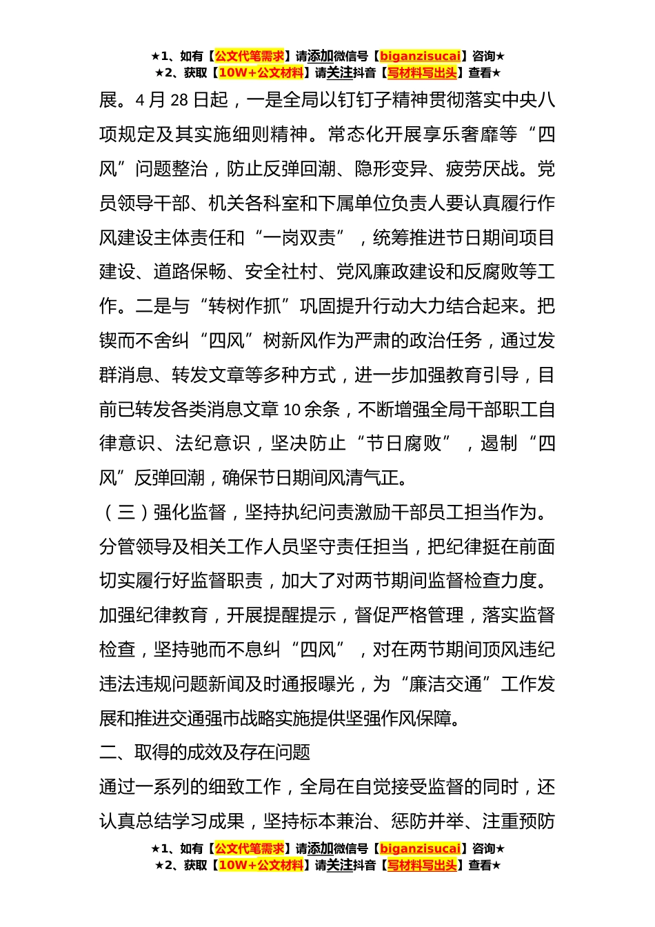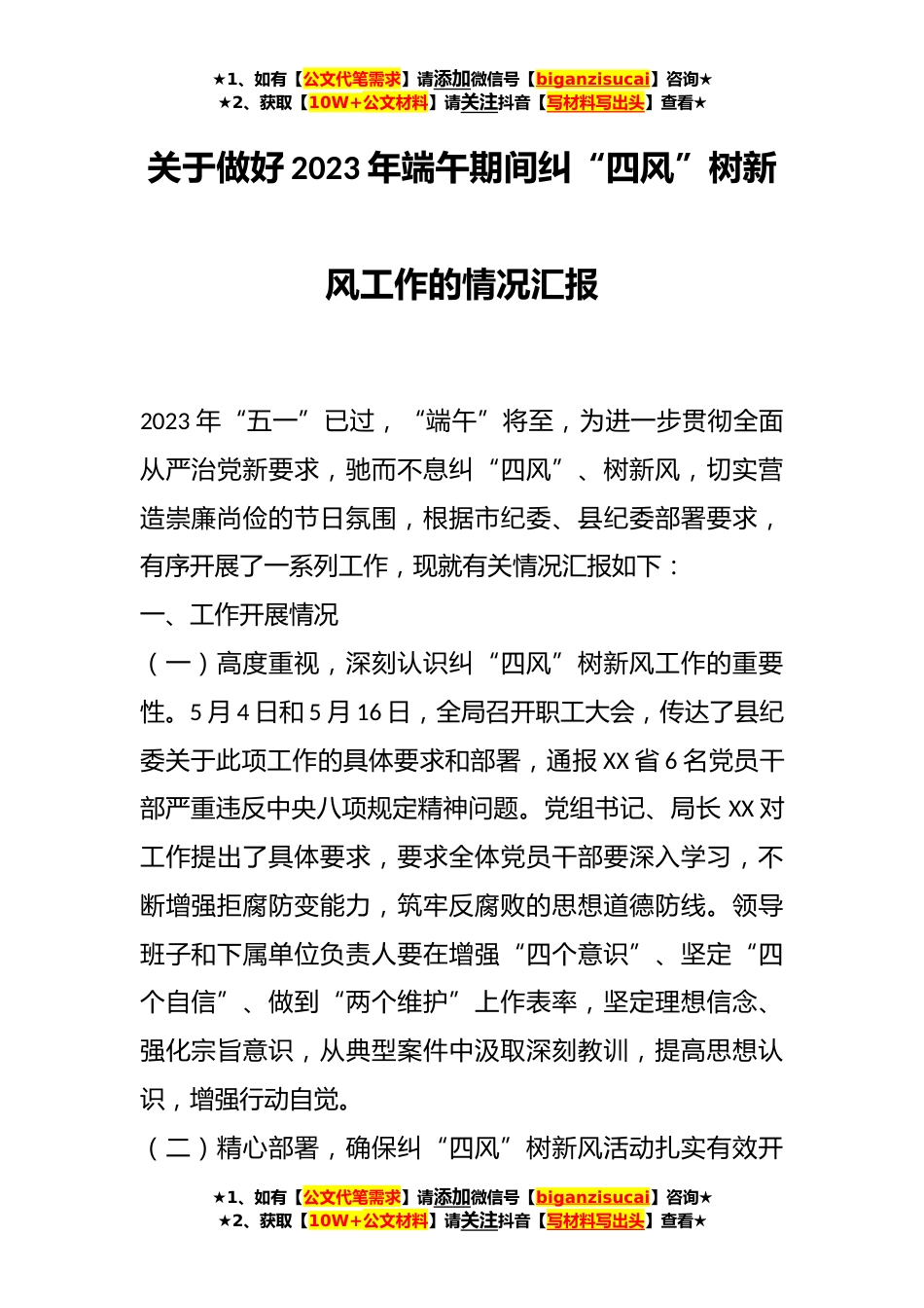 ★1、如有【公文代笔需求】请添加微信号【biganzisucai】咨询★★2、获取【10W+公文材料】请关注抖音【写材料写出头】查看★关于做好2023年端午期间纠“四风”树新风工作的情况汇报2023年“五一”已过,“端午”将至,为进一步贯彻全面从严治党新要求,驰而不息纠“四风”、树新风,切实营造崇廉尚俭的节日氛围,根据市纪委、县纪委部署要求,有序开展了一系列工作,现就有关情况汇报如下:一、工作开展情况(一)高度重视,深刻认识纠“四风”树新风工作的重要性。5月4日和5月16日,全局召开职工大会,传达了县纪委关于此项工作的具体要求和部署,通报XX省6名党员干部严重违反中央八项规定精神问题。党组书记、局长XX对工作提出了具体要求,要求全体党员干部要深入学习,不断增强拒腐防变能力,筑牢反腐败的思想...