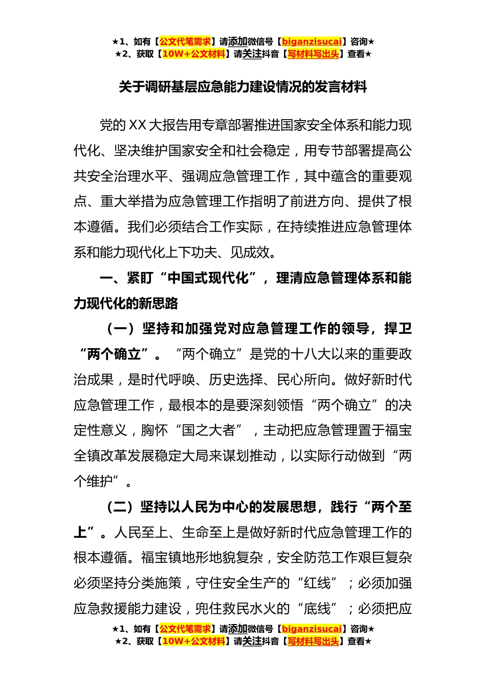 ★1、如有【公文代笔需求】请添加微信号【biganzisucai】咨询★★2、获取【10W+公文材料】请关注抖音【写材料写出头】查看★关于调研基层应急能力建设情况的发言材料党的XX大报告用专章部署推进国家安全体系和能力现代化、坚决维护国家安全和社会稳定,用专节部署提高公共安全治理水平、强调应急管理工作,其中蕴含的重要观点、重大举措为应急管理工作指明了前进方向、提供了根本遵循。我们必须结合工作实际,在持续推进应急管理体系和能力现代化上下功夫、见成效。一、紧盯“中国式现代化”,理清应急管理体系和能力现代化的新思路(一)坚持和加强党对应急管理工作的领导,捍卫“两个确立”。“两个确立”是党的十八大以来的重要政治成果,是时代呼唤、历史选择、民心所向。做好新时代应急管理工作,最根本的是...
