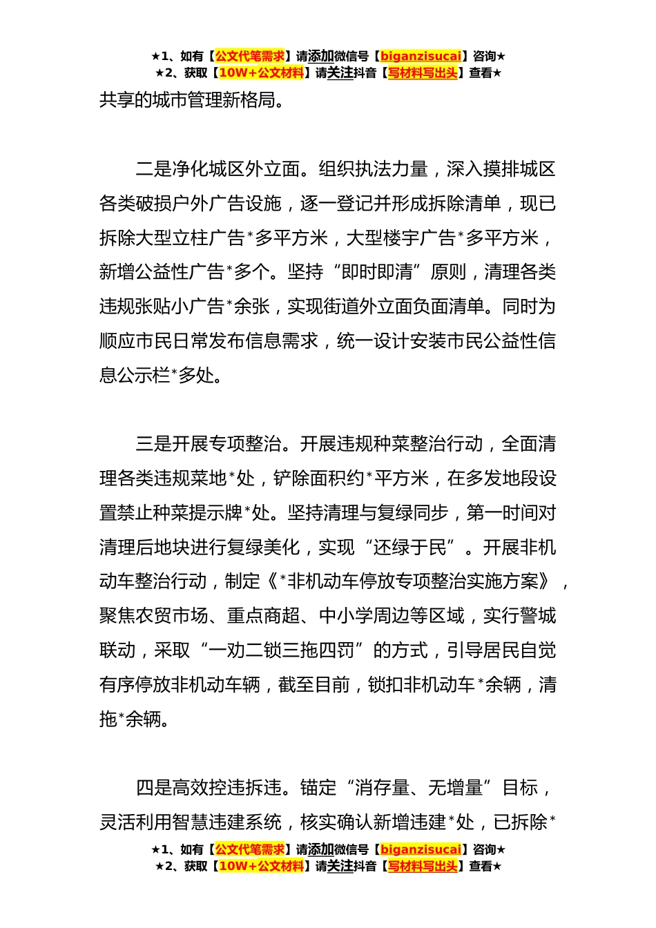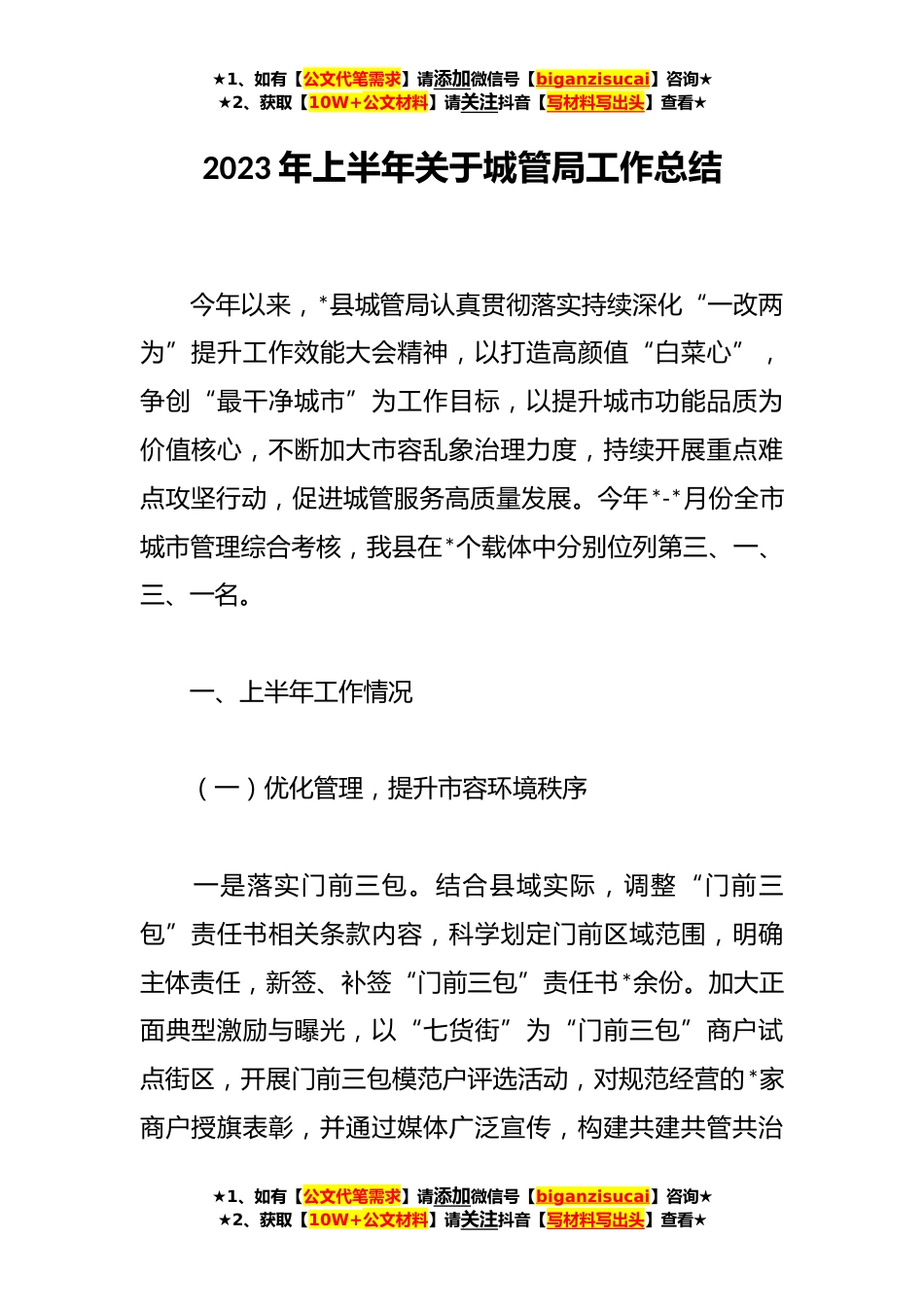 ★1、如有【公文代笔需求】请添加微信号【biganzisucai】咨询★★2、获取【10W+公文材料】请关注抖音【写材料写出头】查看★2023年上半年关于城管局工作总结今年以来,*县城管局认真贯彻落实持续深化“一改两为”提升工作效能大会精神,以打造高颜值“白菜心”,争创“最干净城市”为工作目标,以提升城市功能品质为价值核心,不断加大市容乱象治理力度,持续开展重点难点攻坚行动,促进城管服务高质量发展。今年*-*月份全市城市管理综合考核,我县在*个载体中分别位列第三、一、三、一名。一、上半年工作情况(一)优化管理,提升市容环境秩序一是落实门前三包。结合县域实际,调整“门前三包”责任书相关条款内容,科学划定门前区域范围,明确主体责任,新签、补签“门前三包”责任书*余份。加大正面典型激励与...