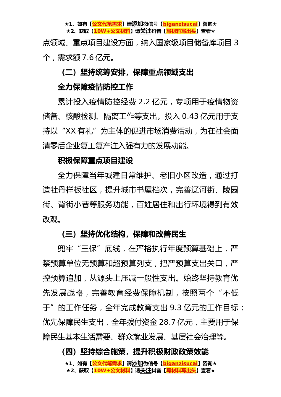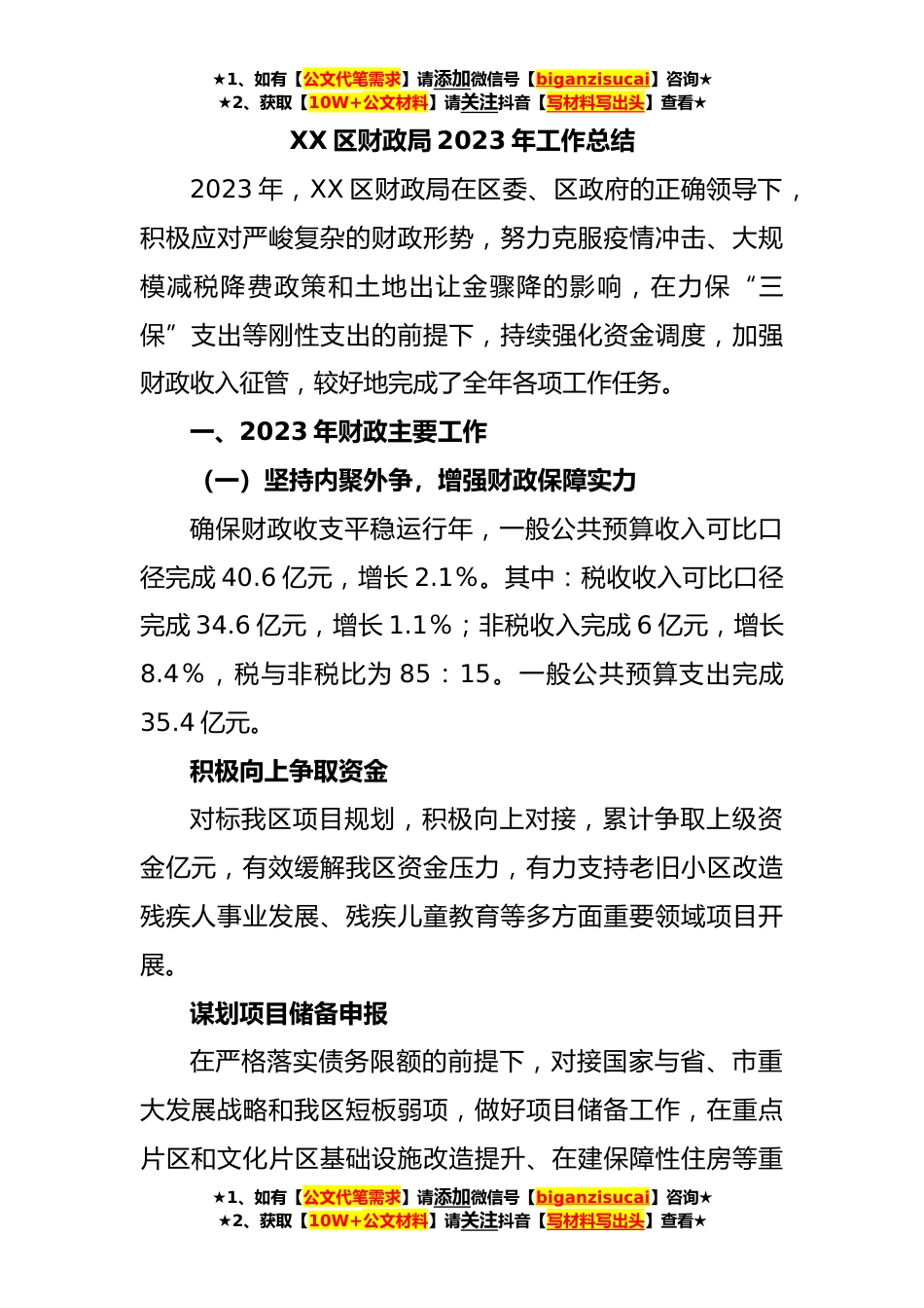 ★1、如有【公文代笔需求】请添加微信号【biganzisucai】咨询★★2、获取【10W+公文材料】请关注抖音【写材料写出头】查看★XX区财政局2023年工作总结2023年,XX区财政局在区委、区政府的正确领导下,积极应对严峻复杂的财政形势,努力克服疫情冲击、大规模减税降费政策和土地出让金骤降的影响,在力保“三保”支出等刚性支出的前提下,持续强化资金调度,加强财政收入征管,较好地完成了全年各项工作任务。一、2023年财政主要工作(一)坚持内聚外争,增强财政保障实力确保财政收支平稳运行年,一般公共预算收入可比口径完成40.6亿元,增长2.1%。其中:税收收入可比口径完成34.6亿元,增长1.1%;非税收入完成6亿元,增长8.4%,税与非税比为85:15。一般公共预算支出完成35.4亿元。积极向上争取资金对标我区项...