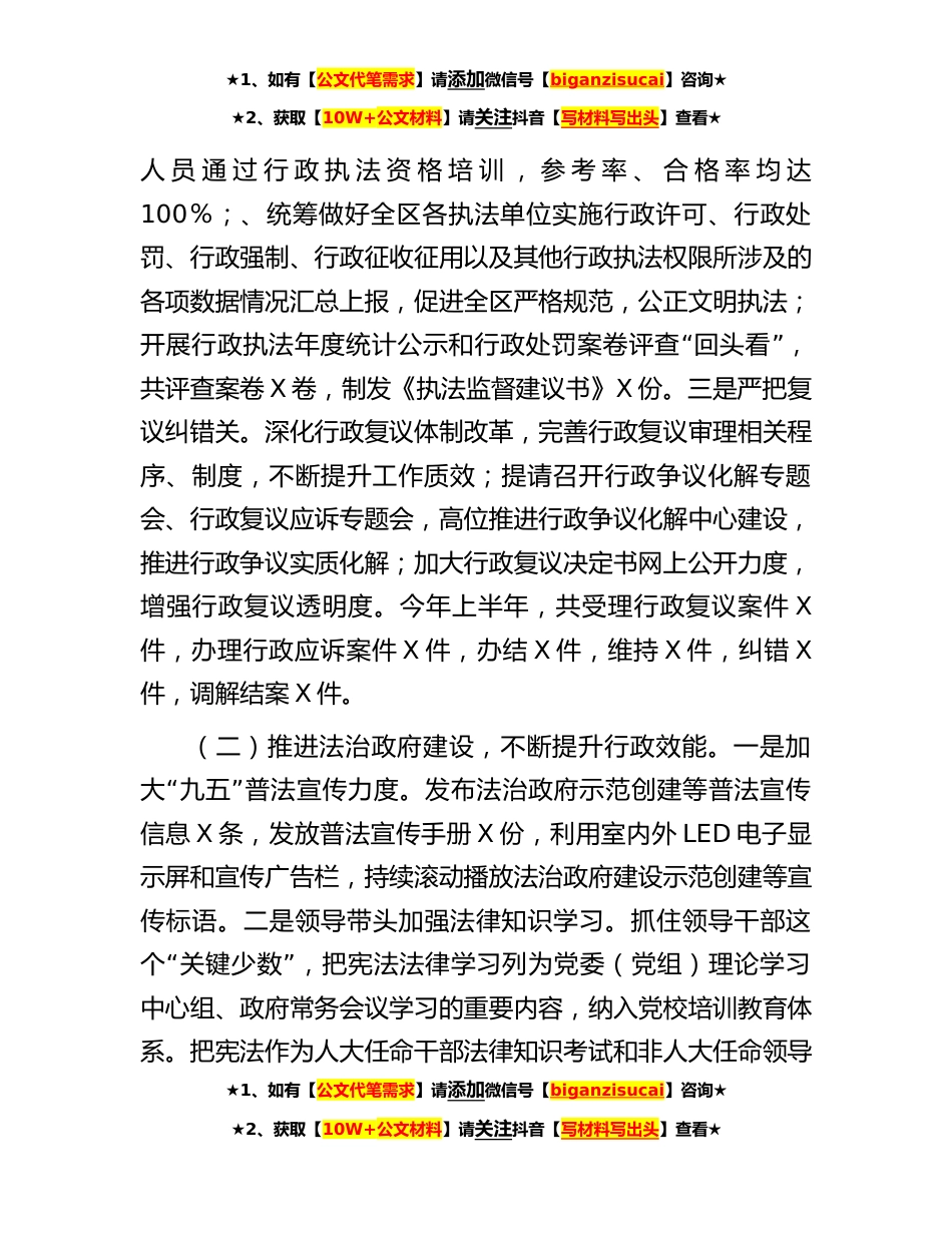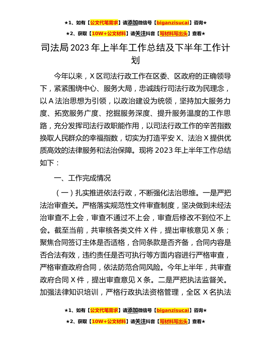 ★1、如有【公文代笔需求】请添加微信号【biganzisucai】咨询★★2、获取【10W+公文材料】请关注抖音【写材料写出头】查看★司法局2023年上半年工作总结及下半年工作计划今年以来,X区司法行政工作在区委、区政府的正确领导下,紧紧围绕中心、服务大局,忠诚践行司法行政为民理念,以A法治思想为引领,以政治建设为统领,坚持加大服务力度、拓宽服务广度、挖掘服务深度、提升服务温度的工作思路,充分发挥司法行政职能作用,以司法行政工作的辛苦指数换取人民群众的幸福指数,切实为打造平安X、法治X提供优质高效的法律服务和法治保障。现将2023年上半年工作总结如下:一、工作完成情况(一)扎实推进依法行政,不断强化法治思维。一是严把法治审查关。严格落实规范性文件审查制度,坚决做到未经法治审查不上会,...