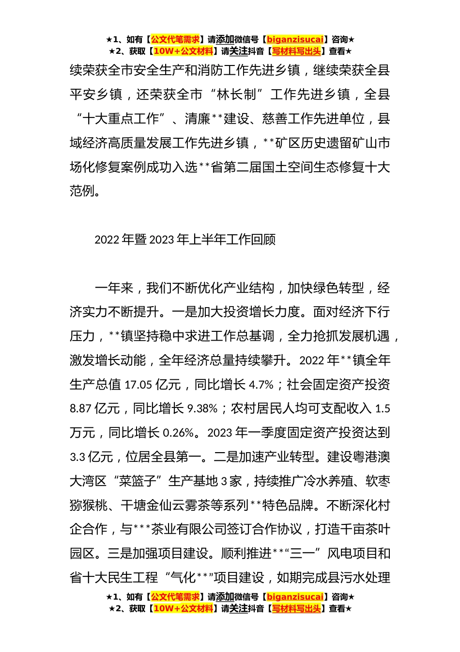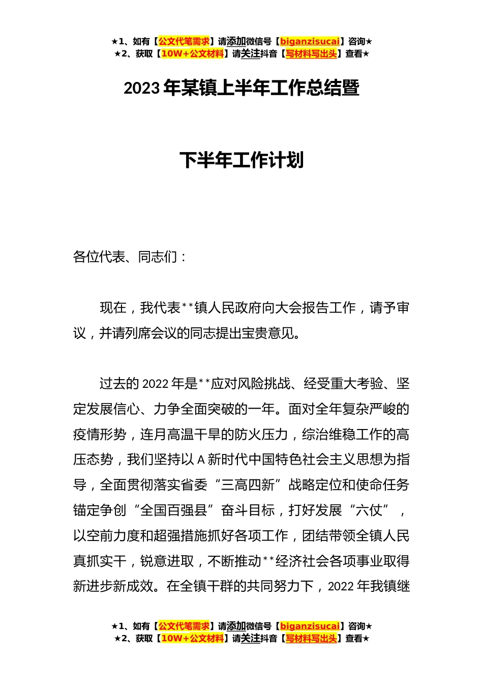 ★1、如有【公文代笔需求】请添加微信号【biganzisucai】咨询★★2、获取【10W+公文材料】请关注抖音【写材料写出头】查看★2023年某镇上半年工作总结暨下半年工作计划各位代表、同志们:现在,我代表**镇人民政府向大会报告工作,请予审议,并请列席会议的同志提出宝贵意见。过去的2022年是**应对风险挑战、经受重大考验、坚定发展信心、力争全面突破的一年。面对全年复杂严峻的疫情形势,连月高温干旱的防火压力,综治维稳工作的高压态势,我们坚持以A新时代中国特色社会主义思想为指导,全面贯彻落实省委“三高四新”战略定位和使命任务锚定争创“全国百强县”奋斗目标,打好发展“六仗”,以空前力度和超强措施抓好各项工作,团结带领全镇人民真抓实干,锐意进取,不断推动**经济社会各项事业取得新进步新成效...