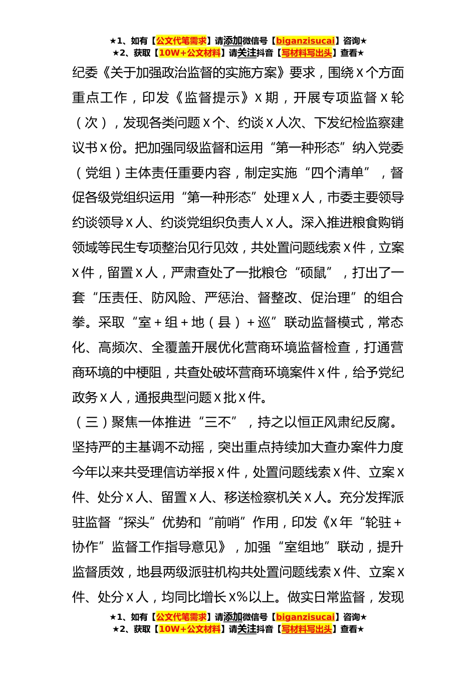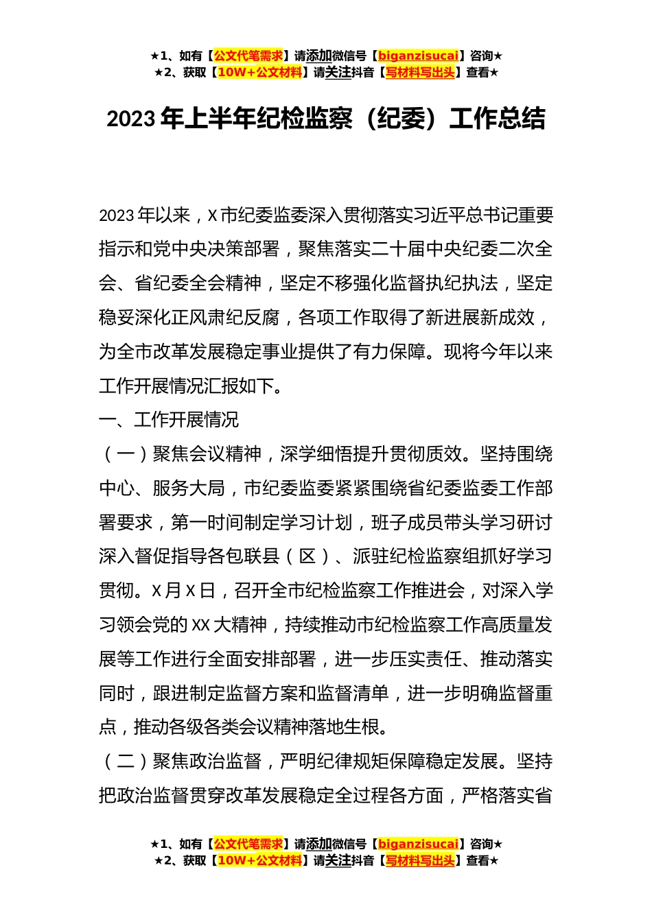 ★1、如有【公文代笔需求】请添加微信号【biganzisucai】咨询★★2、获取【10W+公文材料】请关注抖音【写材料写出头】查看★2023年上半年纪检监察(纪委)工作总结2023年以来,X市纪委监委深入贯彻落实习近平总书记重要指示和党中央决策部署,聚焦落实二十届中央纪委二次全会、省纪委全会精神,坚定不移强化监督执纪执法,坚定稳妥深化正风肃纪反腐,各项工作取得了新进展新成效,为全市改革发展稳定事业提供了有力保障。现将今年以来工作开展情况汇报如下。一、工作开展情况(一)聚焦会议精神,深学细悟提升贯彻质效。坚持围绕中心、服务大局,市纪委监委紧紧围绕省纪委监委工作部署要求,第一时间制定学习计划,班子成员带头学习研讨深入督促指导各包联县(区)、派驻纪检监察组抓好学习贯彻。X月X日,召开全市...