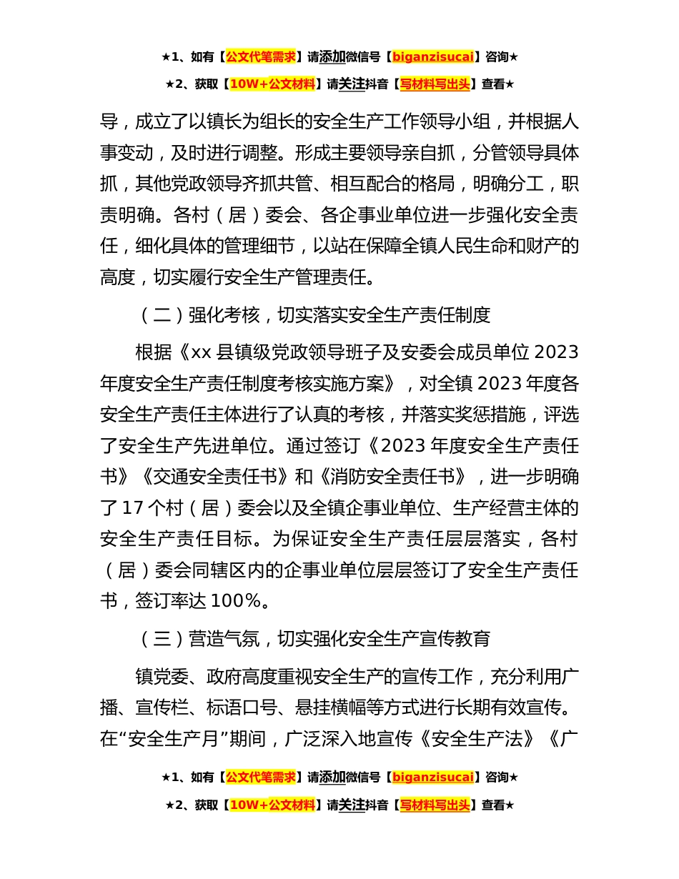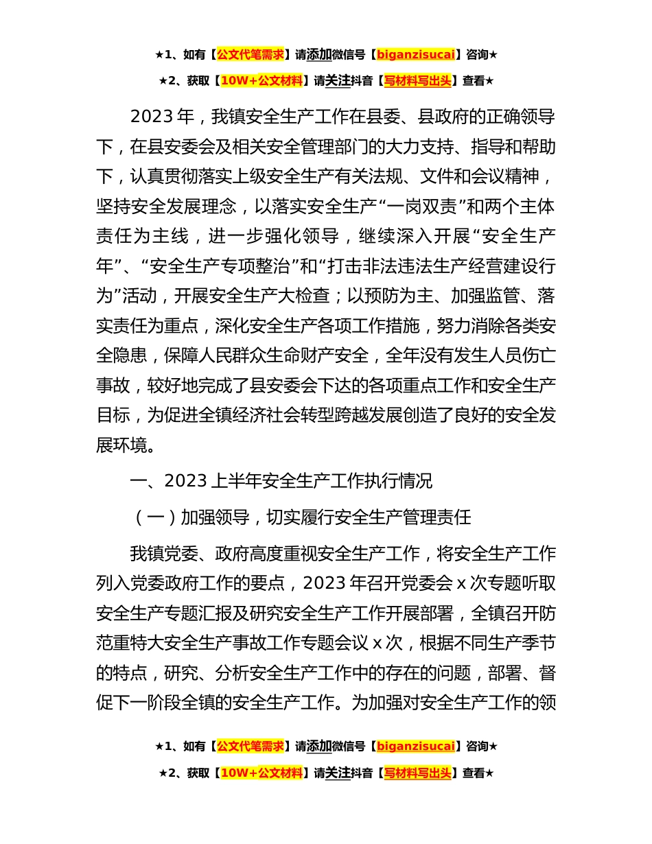 ★1、如有【公文代笔需求】请添加微信号【biganzisucai】咨询★★2、获取【10W+公文材料】请关注抖音【写材料写出头】查看★2023年,我镇安全生产工作在县委、县政府的正确领导下,在县安委会及相关安全管理部门的大力支持、指导和帮助下,认真贯彻落实上级安全生产有关法规、文件和会议精神,“”坚持安全发展理念,以落实安全生产一岗双责和两个主体“责任为主线,进一步强化领导,继续深入开展安全生产”“”“年、安全生产专项整治和打击非法违法生产经营建设行”为活动,开展安全生产大检查;以预防为主、加强监管、落实责任为重点,深化安全生产各项工作措施,努力消除各类安全隐患,保障人民群众生命财产安全,全年没有发生人员伤亡事故,较好地完成了县安委会下达的各项重点工作和安全生产目标,为促进全...