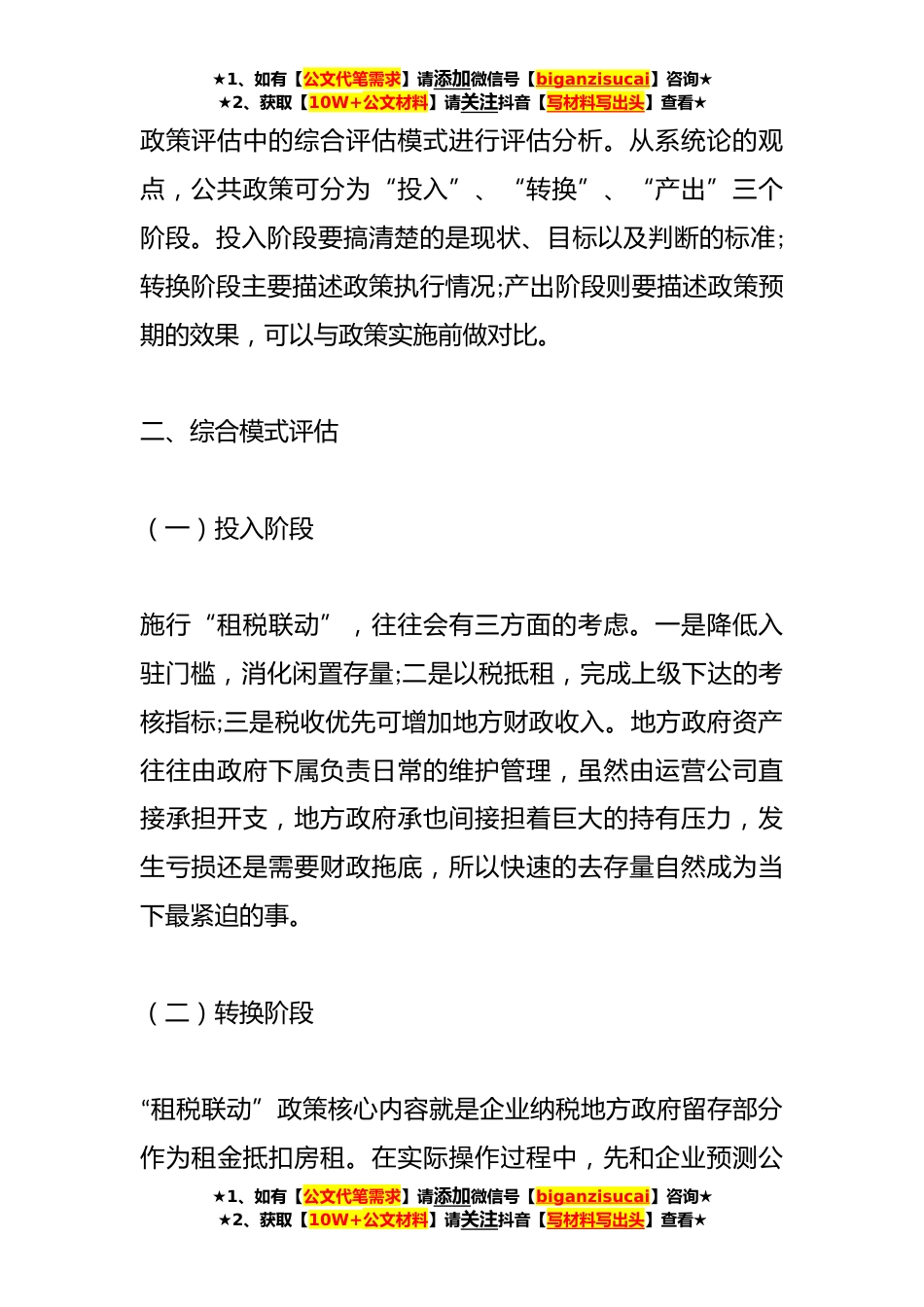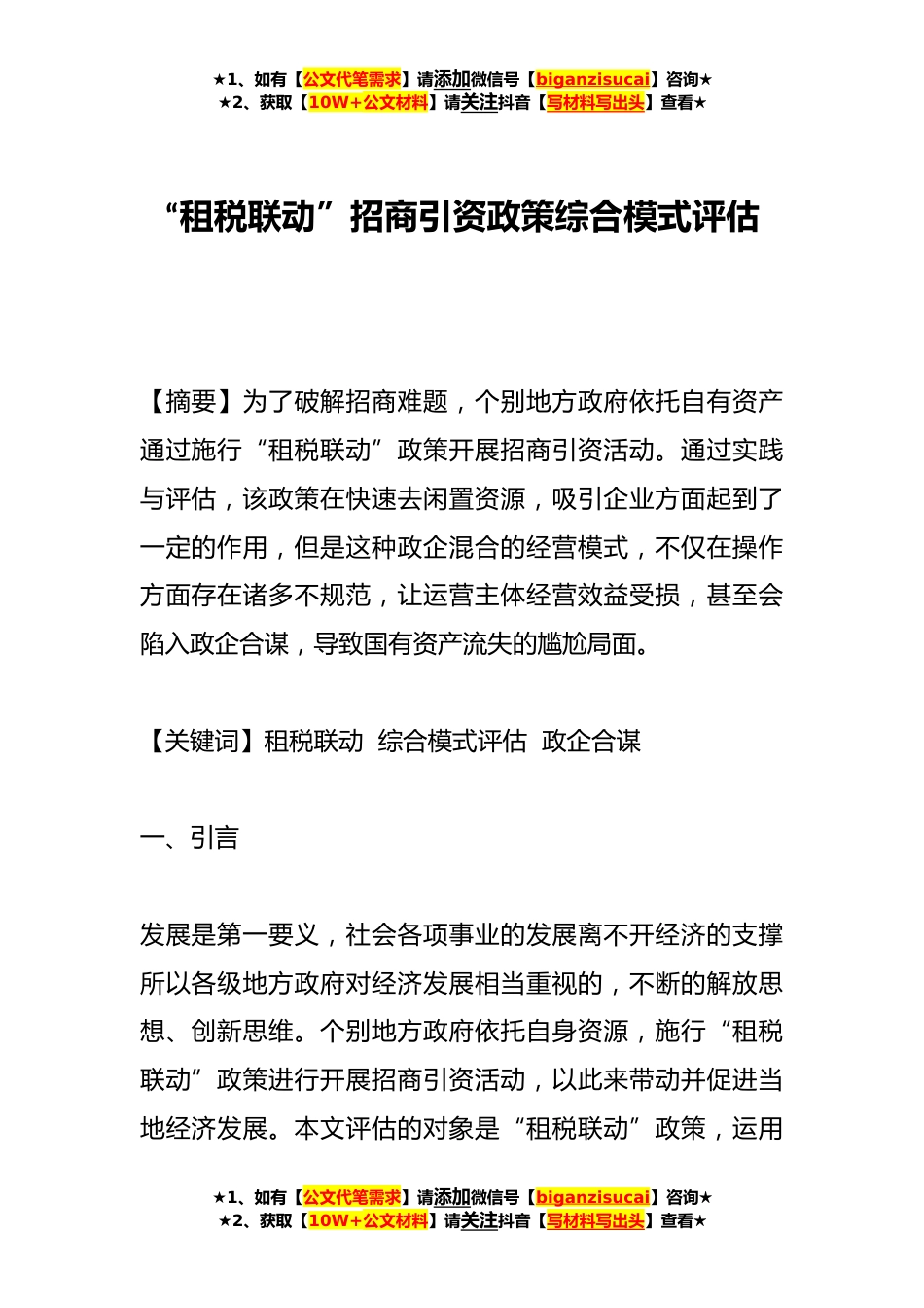 ★1、如有【公文代笔需求】请添加微信号【biganzisucai】咨询★★2、获取【10W+公文材料】请关注抖音【写材料写出头】查看★“租税联动”招商引资政策综合模式评估【摘要】为了破解招商难题,个别地方政府依托自有资产通过施行“租税联动”政策开展招商引资活动。通过实践与评估,该政策在快速去闲置资源,吸引企业方面起到了一定的作用,但是这种政企混合的经营模式,不仅在操作方面存在诸多不规范,让运营主体经营效益受损,甚至会陷入政企合谋,导致国有资产流失的尴尬局面。【关键词】租税联动综合模式评估政企合谋一、引言发展是第一要义,社会各项事业的发展离不开经济的支撑所以各级地方政府对经济发展相当重视的,不断的解放思想、创新思维。个别地方政府依托自身资源,施行“租税联动”政策进行开展招商...