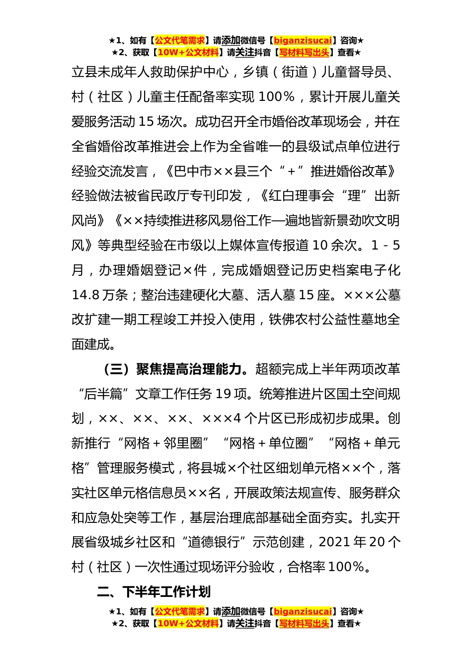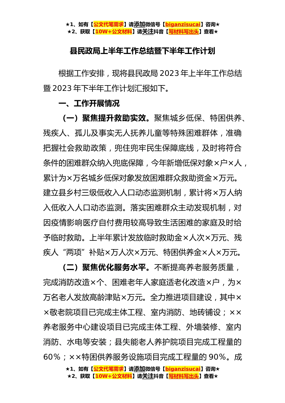 ★1、如有【公文代笔需求】请添加微信号【biganzisucai】咨询★★2、获取【10W+公文材料】请关注抖音【写材料写出头】查看★县民政局上半年工作总结暨下半年工作计划根据工作安排,现将县民政局2023年上半年工作总结暨2023年下半年工作计划汇报如下。一、工作开展情况(一)聚焦提升救助实效。聚焦城乡低保、特困供养、残疾人、孤儿及事实无人抚养儿童等特殊困难群体,准确把握社会救助政策,兜住兜牢民生保障底线,及时将符合条件的困难群众纳入兜底保障,今年新增低保对象×户×人,累计为×万名城乡低保对象发放困难群众救助资金×万元。建立县乡村三级低收入人口动态监测机制,累计将×万人纳入低收入人口动态监测。落实困难群众主动发现机制,对因疫情影响医疗自付费用较高导致生活困难的家庭及时给予临时救...