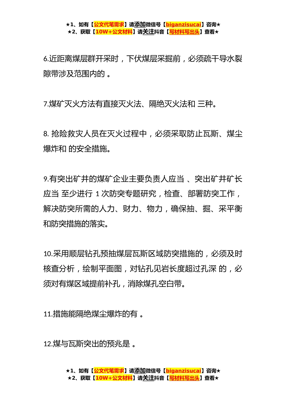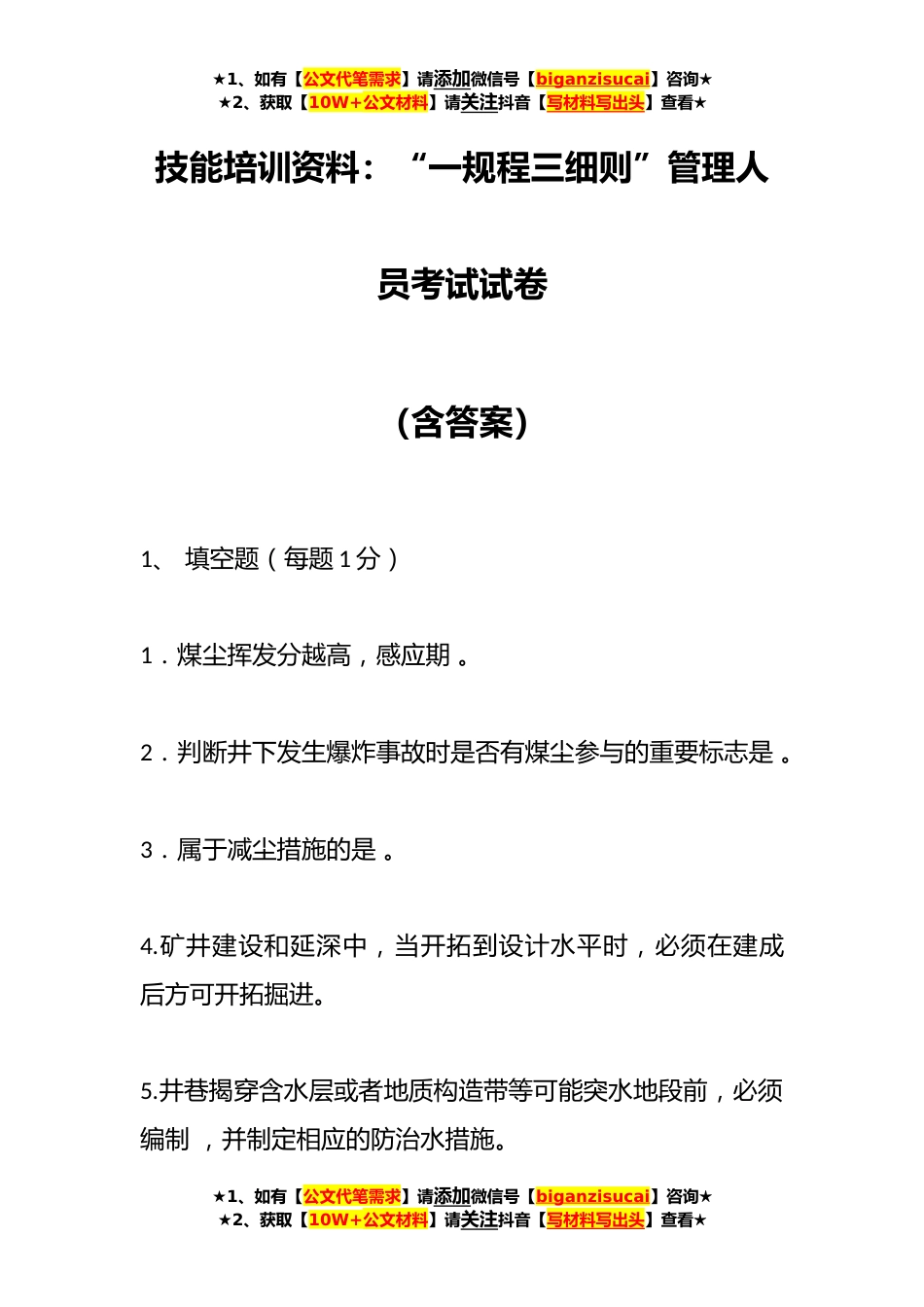 ★1、如有【公文代笔需求】请添加微信号【biganzisucai】咨询★★2、获取【10W+公文材料】请关注抖音【写材料写出头】查看★技能培训资料:“一规程三细则”管理人员考试试卷(含答案)1、填空题(每题1分)1.煤尘挥发分越高,感应期。2.判断井下发生爆炸事故时是否有煤尘参与的重要标志是。3.属于减尘措施的是。4.矿井建设和延深中,当开拓到设计水平时,必须在建成后方可开拓掘进。5.井巷揭穿含水层或者地质构造带等可能突水地段前,必须编制,并制定相应的防治水措施。★1、如有【公文代笔需求】请添加微信号【biganzisucai】咨询★★2、获取【10W+公文材料】请关注抖音【写材料写出头】查看★★1、如有【公文代笔需求】请添加微信号【biganzisucai】咨询★★2、获取【10W+公文材料】请关注抖音【写材料写出...