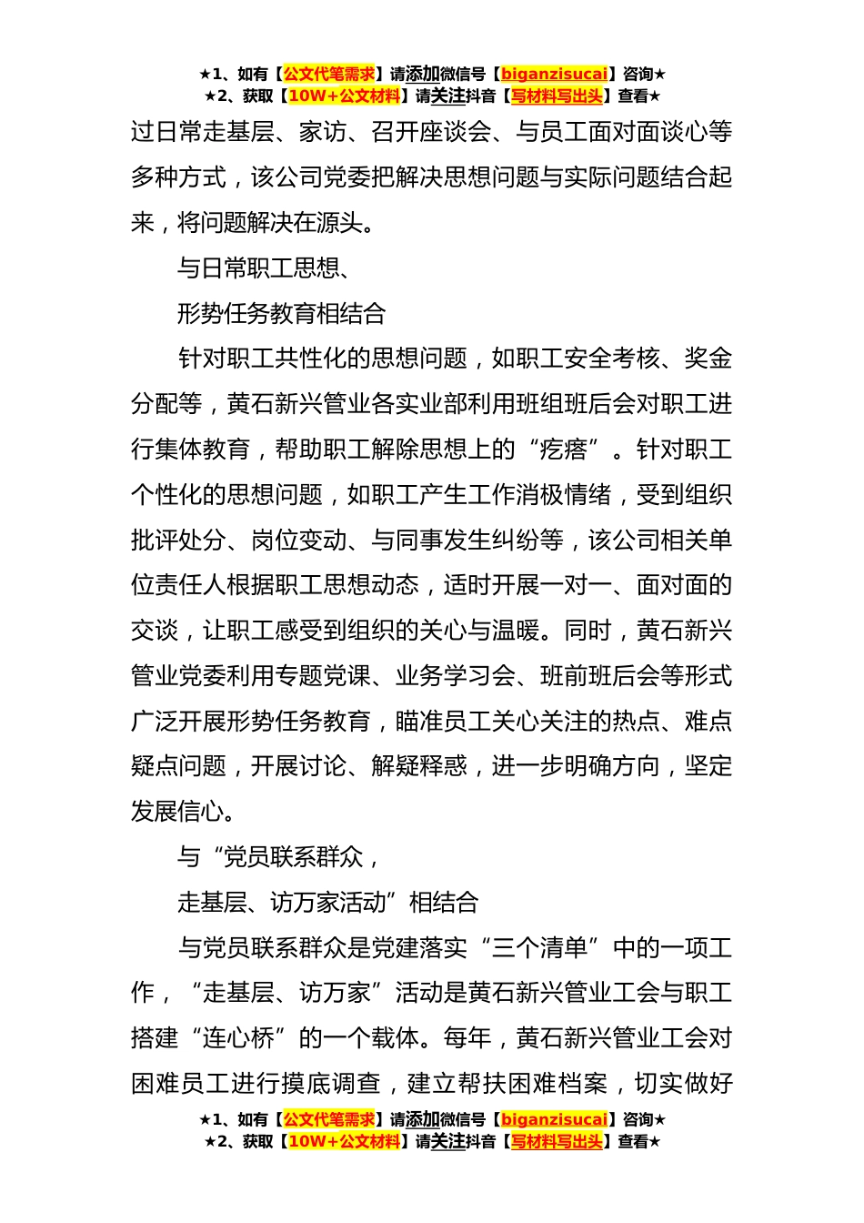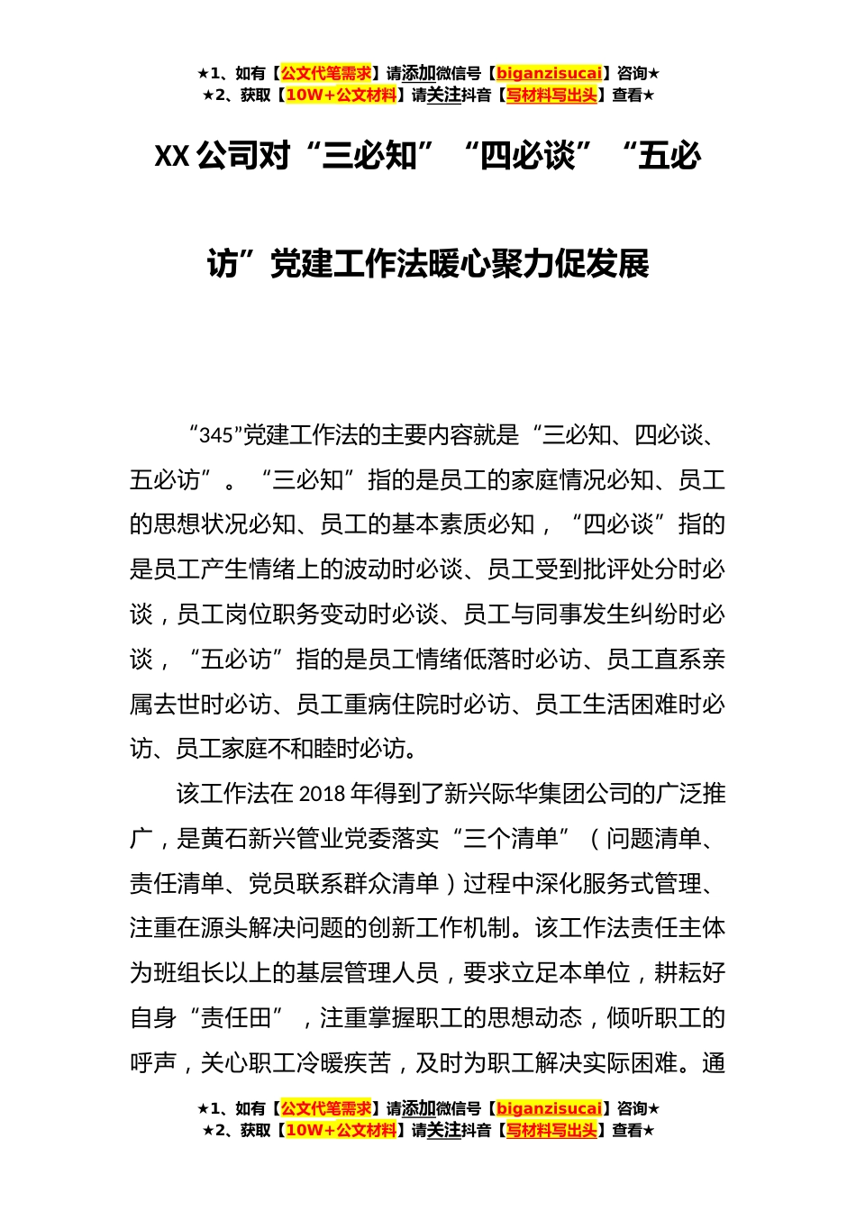 ★1、如有【公文代笔需求】请添加微信号【biganzisucai】咨询★★2、获取【10W+公文材料】请关注抖音【写材料写出头】查看★XX公司对“三必知”“四必谈”“五必访”党建工作法暖心聚力促发展“345”党建工作法的主要内容就是“三必知、四必谈、五必访”。“三必知”指的是员工的家庭情况必知、员工的思想状况必知、员工的基本素质必知,“四必谈”指的是员工产生情绪上的波动时必谈、员工受到批评处分时必谈,员工岗位职务变动时必谈、员工与同事发生纠纷时必谈,“五必访”指的是员工情绪低落时必访、员工直系亲属去世时必访、员工重病住院时必访、员工生活困难时必访、员工家庭不和睦时必访。该工作法在2018年得到了新兴际华集团公司的广泛推广,是黄石新兴管业党委落实“三个清单”(问题清单、责任清单、党员...