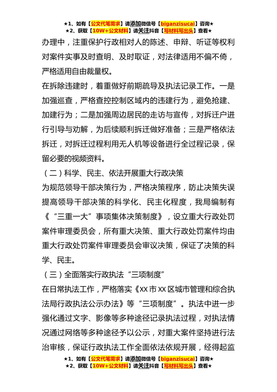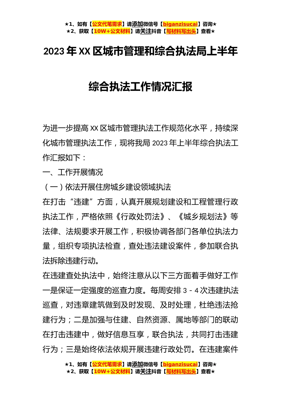 ★1、如有【公文代笔需求】请添加微信号【biganzisucai】咨询★★2、获取【10W+公文材料】请关注抖音【写材料写出头】查看★2023年XX区城市管理和综合执法局上半年综合执法工作情况汇报为进一步提高XX区城市管理执法工作规范化水平,持续深化城市管理执法工作,现将我局2023年上半年综合执法工作汇报如下:一、工作开展情况(一)依法开展住房城乡建设领域执法在打击“违建”方面,认真开展规划建设和工程管理行政执法工作,严格依照《行政处罚法》、《城乡规划法》等法律、法规要求开展工作,积极协调各部门各单位执法力量,组织专项执法检查,查处违法建设案件,参加联合执法拆除违建行动。在违建查处执法中,始终注意从以下三方面着手做好工作一是保证一定强度的巡查力度。每周安排3-4次违建执法巡查,对违章...