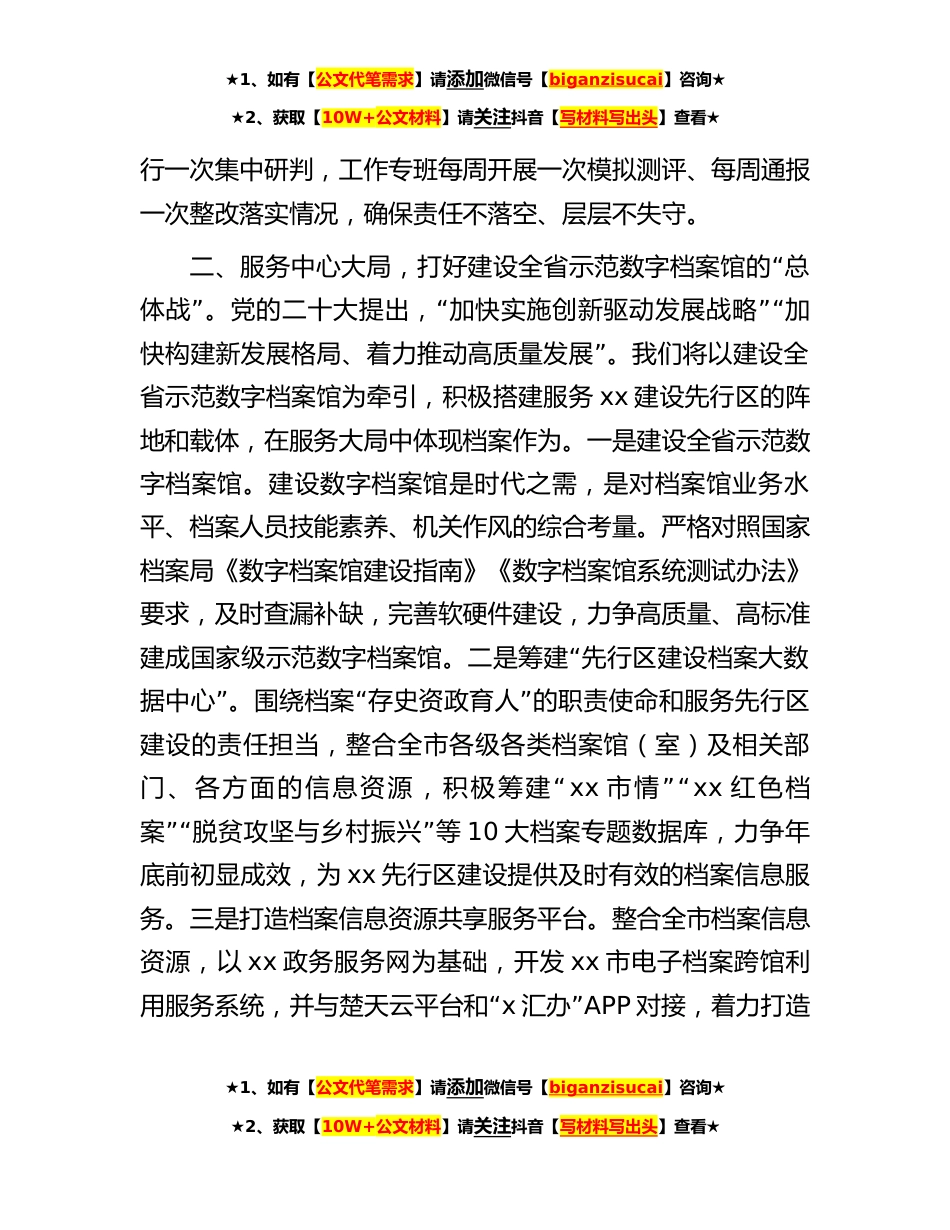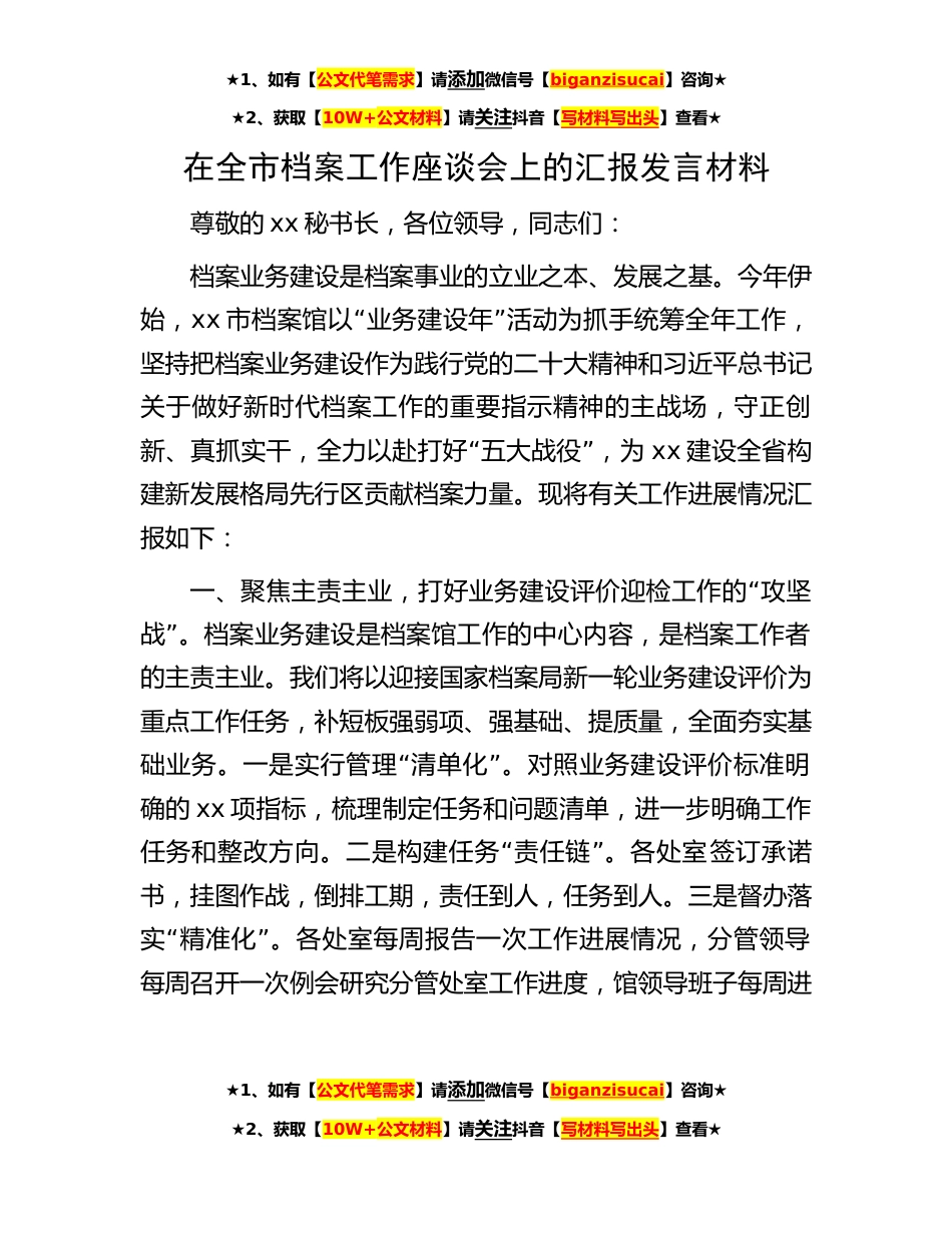 ★1、如有【公文代笔需求】请添加微信号【biganzisucai】咨询★★2、获取【10W+公文材料】请关注抖音【写材料写出头】查看★在全市档案工作座谈会上的汇报发言材料尊敬的xx秘书长,各位领导,同志们:档案业务建设是档案事业的立业之本、发展之基。今年伊始,xx“”市档案馆以业务建设年活动为抓手统筹全年工作,坚持把档案业务建设作为践行党的二十大精神和习近平总书记关于做好新时代档案工作的重要指示精神的主战场,守正创“”新、真抓实干,全力以赴打好五大战役,为xx建设全省构建新发展格局先行区贡献档案力量。现将有关工作进展情况汇报如下:“一、聚焦主责主业,打好业务建设评价迎检工作的攻坚”战。档案业务建设是档案馆工作的中心内容,是档案工作者的主责主业。我们将以迎接国家档案局新一轮业务建...